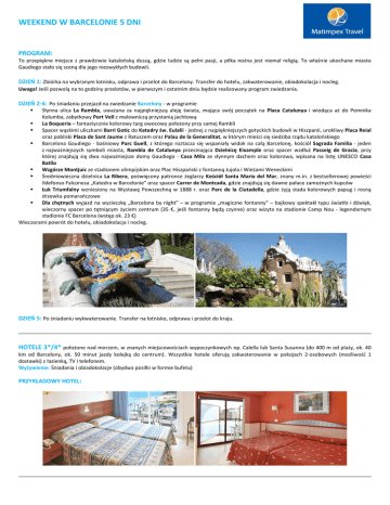WEEKEND W BARCELONIE 5 DNI PROGRAM: To przepiękne miejsce z prawdziwie katalońską duszą, gdzie ludzie są pełni pasji, a piłka nożna jest niemal religią. To właśnie ukochane miasto Gaudiego stało się sceną dla jego niezwykłych budowli. DZIEŃ 1: Zbiórka na wybranym lotnisku, odprawa i przelot do Barcelony. Transfer do hotelu, zakwaterowanie, obiadokolacja i nocleg. Uwaga! Jeśli pozwolą na to godziny przelotów, w pierwszym i ostatnim dniu będzie realizowany program zwiedzania . DZIEŃ 2-4: Po śniadaniu przejazd na zwiedzanie Barcelony - w programie Słynna ulica La Rambla, uważana za najpiękniejszą aleję świata, mająca swój początek na Placa Catalunya i wiodąca aż do Pomnika Kolumba, zabytkowy Port Vell z malowniczą przystanią jachtową La Boqueria – fantastycznie kolorowy targ owocowy położony przy samej Rambli Spacer wąskimi uliczkami Barri Gotic do Katedry św. Eulalii - jednej z najpiękniejszych gotyckich budowli w Hiszpanii, urokliwy Placa Reial oraz pobliski Placa de Sant Jaume z Ratuszem oraz Palau de la Generalitat, w którym mieści się siedziba rządu katalońskiego Barcelona Gaudiego - baśniowy Parc Guell, z którego roztacza się wspaniały widok na całą Barcelonę, kościół Sagrada Familia - jeden z najważniejszych symboli miasta, Rambla de Catalunya przecinająca Dzielnicę Eixample oraz spacer wzdłuż Passeig de Gracia, przy której znajdują się dwa najważniejsze domy Gaudiego - Casa Mila ze słynnym dachem oraz kolorowa, wpisana na listę UNESCO Casa Batllo Wzgórze Montjuic ze stadionem olimpijskim oraz Plac Hiszpański z fontanną Jujola i Wieżami Weneckimi Średniowieczna dzielnica La Ribera, poświęcony patronce żeglarzy Kościół Santa Maria del Mar, znany m.in. z bestsellerowej powieści Ildefonso Falconesa „Katedra w Barcelonie” oraz spacer Carrer de Montcada, gdzie znajdują się dawne pałace zamożnych kupców Łuk Triumfalny wzniesiony na Wystawę Powszechną w 1888 r. oraz Parc de la Ciutadella, gdzie żyją stada kolorowych papug i rosną drzewka pomarańczowe Dla chętnych wyjazd na wycieczkę „Barcelona by night” – w programie „magiczne fontanny” – bajkowy spektakl typu światło i dźwięk, wieczorny spacer po tętniącym życiem centrum (35 €, jeśli fontanny będą czynne) oraz wizyta na stadionie Camp Nou - legendarnym stadionie FC Barcelona (wstęp ok. 23 €) Wieczorami powrót do hotelu, obiadokolacja i nocleg. DZIEŃ 5: Po śniadaniu wykwaterowanie. Transfer na lotnisko, odprawa i przelot do kraju. HOTELE 3*/4* położone nad morzem, w znanych miejscowościach wypoczynkowych np. Calella lub Santa Susanna (do 400 m od plaży, ok. 40 km od Barcelony, ok. 50 minut jazdy kolejką do centrum). Wszystkie hotele oferują zakwaterowanie w pokojach 2-osobowych (możliwość 1 dostawki) z łazienką, TV i telefonem. Wyżywienie: Śniadania i obiadokolacje (obydwa posiłki w formie bufetu) PRZYKŁADOWY HOTEL: ŚWIADCZENIA ZAWARTE W CENIE: Przelot na wybranej trasie Opłaty lotniskowe Bagaż podręczny (cena NIE zawiera bagażu głównego, istnieje możliwość dopłaty do dużej walizki) Transfer lotnisko – hotel – lotnisko 4 noclegi w hotelu 3*/4* 4 śniadania + 4 obiadokolacje Pokoje 2-osobowe z łazienkami Opieka pilota Ubezpieczenie podstawowe Signal Iduna (KL, NNW, CHP i bagaż) KOSZTY DODATKOWE: Orientacyjny koszt realizacji programu zwiedzania to ok. 90-100 € (w zależności od wielkości grupy) - kwota ta obejmuje przejazdy komunikacją miejską oraz podmiejską podczas realizacji programu oraz bilety wstępu do zwiedzanych obiektów wraz z kosztami ich rezerwacji (Sagrada Familia, Casa Mila lub Casa Batllo, Park Guell). Cena nie zawiera podatku miejskiego w wysokości 1-2 €/os/noc Cena nie zawiera napojów do obiadokolacji. Opcje dla chętnych (Camp Nou, wycieczka Barcelona by night) są dodatkowo płatne. Wycieczka na fontanny jest realizowana przy min. 10 zgłoszonych osobach. INFORMACJE DODATKOWE: Promocja „S” - promocja dla osób podróżujących w pojedynkę, dokwaterowanie do pokoju 2- lub 3-osobowego Dopłata za pokój 1-osobowy +350-500 zł (w zależności od terminu) Zniżka dla trzeciej osoby w pokoju -100 zł Gwarancja niezmienności ceny +30 zł WYBIERZ SWÓJ BAGAŻ: Cena wycieczki zawiera jedynie bagaż podręczny: Ryanair (wyloty z Krakowa, Modlina, Poznania w układzie niedziela-czwartek oraz z Wrocławia): bagaż podręczny o wadze 10 kg i wymiarach 55x40x20 cm oraz dodatkowy mały bagaż podręczny o wymiarach 35x20x20 cm Wizzair (wyloty z Gdańska, Katowic, Poznania w układzie środa-niedziela i Warszawy): bagaż podręczny o wymiarach 42x32x25 cm (bagaż mieszczący się pod siedzeniem fotela lotniczego). Za dopłatą można powiększyć bagaż podręczny do wymiarów 56x45x25 cm (bagaż mieszczący się w schowku nad siedzeniami). Istnieje możliwość wykupienia bagażu głównego – ceny bagażu zależą od przewoźnika, trasy i terminu wycieczki, a dodatkowy bagaż przypisany jest do konkretnej osoby. Szczegółowy cennik bagażu znajdziecie na stronie www.matimpex.pl w zakładce Katalogi i ceny. Prosimy o wybór bagażu w momencie dokonywania rezerwacji, gdyż w przypadku wykupienia bagażu w późniejszym terminie, jego cena będzie wyższa ok. 20-50 zł (w zależności od taryfy przewoźnika). Ze względów organizacyjnych prosimy o ostateczny wybór opcji bagażu najpóźniej na 4 dni robocze przed planowanym terminem wycieczki – po tym terminie dodanie bagażu może nie być możliwe. Przypominamy, że w bagażu podręcznym nie mogą znajdować się płyny ani żele czy fluidy w opakowaniach większych niż 100 ml oraz ostre narzędzia (noże, metalowe pilniczki do paznokci, nożyczki, itp.). Szczegóły na www.matimpex.pl w zakładce Linie lotnicze. POZOSTAŁE UWAGI: Kolejność zwiedzania może ulec zmianie, jednak wszystkie punkty programu zostaną zrealizowane. Pilot nie oprowadza grupy po wnętrzach muzeów. Spotkanie z pilotem nastą