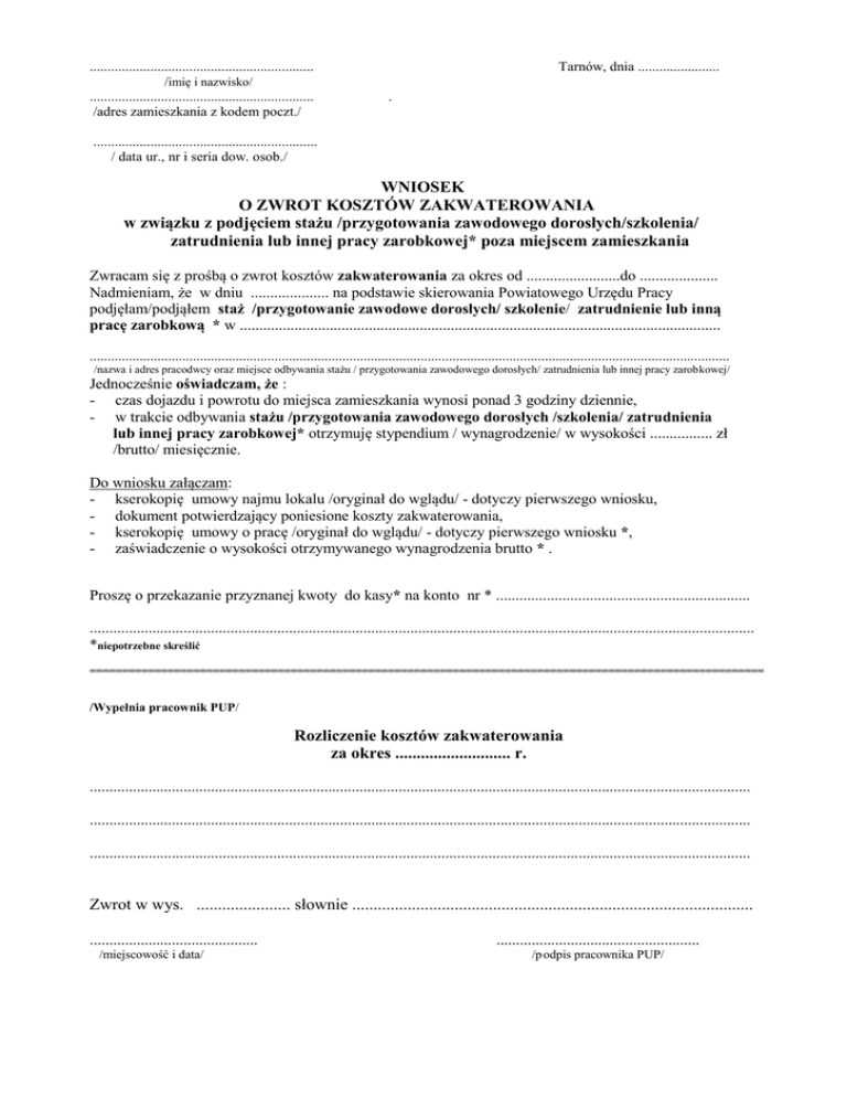 ............................................................... /imię i nazwisko/ ............................................................... /adres zamieszkania z kodem poczt./ Tarnów, dnia ....................... . ............................................................... / data ur., nr i seria dow. osob./ WNIOSEK O ZWROT KOSZTÓW ZAKWATEROWANIA w związku z podjęciem stażu /przygotowania zawodowego dorosłych/szkolenia/ zatrudnienia lub innej pracy zarobkowej* poza miejscem zamieszkania Zwracam się z prośbą o zwrot kosztów zakwaterowania za okres od ........................do .................... Nadmieniam, że w dniu .................... na podstawie skierowania Powiatowego Urzędu Pracy podjęłam/podjąłem staż /przygotowanie zawodowe dorosłych/ szkolenie/ zatrudnienie lub inną pracę zarobkową * w ........................................................................................................................... .................................................................................................................................................................................... /nazwa i adres pracodwcy oraz miejsce odbywania stażu / przygotowania zawodowego dorosłych/ zatrudnienia lub innej pracy zarobkowej/ Jednocześnie oświadczam, że : - czas dojazdu i powrotu do miejsca zamieszkania wynosi ponad 3 godziny dziennie, - w trakcie odbywania stażu /przygotowania zawodowego dorosłych /szkolenia/ zatrudnienia lub innej pracy zarobkowej* otrzymuję stypendium / wynagrodzenie/ w wysokości ................ zł /brutto/ miesięcznie. Do wniosku załączam: - kserokopię umowy najmu lokalu /oryginał do wglądu/ - dotyczy pierwszego wniosku, - dokument potwierdzający poniesione koszty zakwaterowania, - kserokopię umowy o pracę /oryginał do wglądu/ - dotyczy pierwszego wniosku *, - zaświadczenie o wysokości otrzymywanego wynagrodzenia brutto * . Proszę o przekazanie przyznanej kwoty do kasy* na konto nr * ................................................................. .......................................................................................................................................................................... *niepotrzebne skreślić ======================================================================================================== /Wypełnia pracownik PUP/ Rozliczenie kosztów zakwaterowania za okres ........................... r. ......................................................................................................................................................................... ......................................................................................................................................................................... ......................................................................................................................................................................... Zwrot w wys. ...................... słownie .............................................................................................. ........................................... /miejscowość i data/ .................................................... /p odpis pracownika PUP/