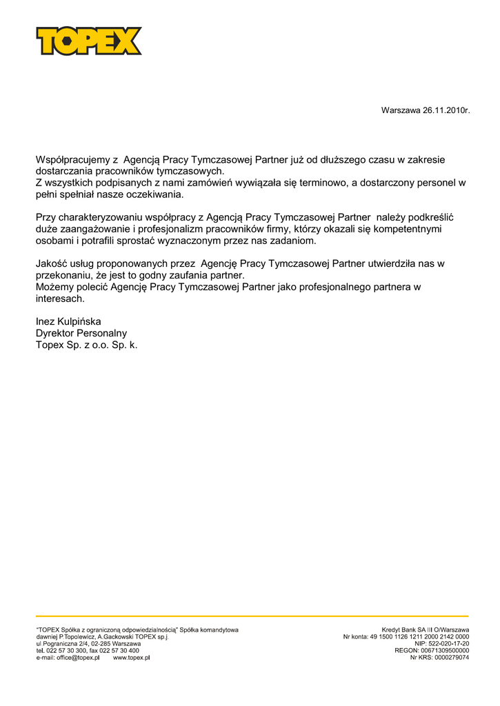 Warszawa 26.11.2010r. Współpracujemy z Agencją Pracy Tymczasowej Partner już od dłuższego czasu w zakresie dostarczania pracowników tymczasowych. Z wszystkich podpisanych z nami zamówień wywiązała się terminowo, a dostarczony personel w pełni spełniał nasze oczekiwania. Przy charakteryzowaniu współpracy z Agencją Pracy Tymczasowej Partner należy podkreślić duże zaangażowanie i profesjonalizm pracowników firmy, którzy okazali się kompetentnymi osobami i potrafili sprostać wyznaczonym przez nas zadaniom. Jakość usług proponowanych przez Agencję Pracy Tymczasowej Partner utwierdziła nas w przekonaniu, że jest to godny zaufania partner. Możemy polecić Agencję Pracy Tymczasowej Partner jako profesjonalnego partnera w interesach. Inez Kulpińska Dyrektor Personalny Topex Sp. z o.o. Sp. k.