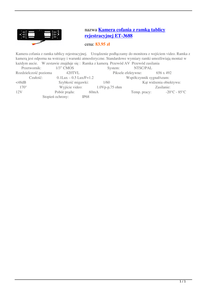 nazwa Kamera cofania z ramką tablicy rejestracyjnej ET-3688 cena: 83.95 zł Kamera cofania z ramka tablicy rejestracyjnej. Urządzenie podłączamy do monitora z wejściem video. Ramka z kamerą jest odporna na wstrząsy i warunki atmosferyczne. Standardowe wymiary ramki umożliwiają montaż w każdym aucie. W zestawie znajduje się : Ramka z kamerą Przewód AV Przewód zasilania Przetwornik: 1/3” CMOS System: NTSC/PAL Rozdzielczość pozioma 420TVL Piksele efektywne: 656 x 492 Czułość: 0.1Lux – 0.5 Lux/F=1.2 Współczynnik sygnał/szum: <48dB Szybkość migawki: 1/60 Kąt widzenia obiektywu: 170° Wyjście video: 1.0Vp-p,75 ohm Zasilanie: 12V Pobór prądu: 60mA Temp. pracy: -20°C - 85°C Stopień ochrony: IP68 1/1