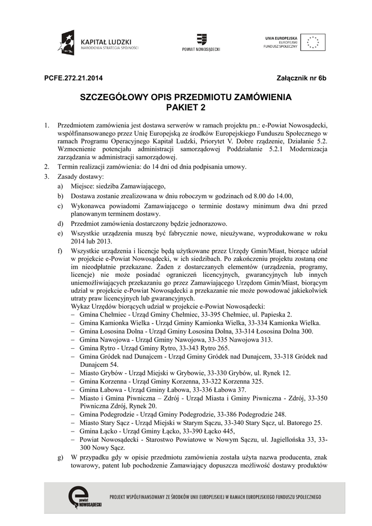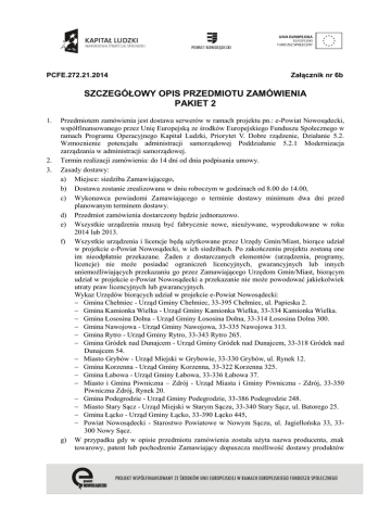 PCFE.272.21.2014 Załącznik nr 6b SZCZEGÓŁOWY OPIS PRZEDMIOTU ZAMÓWIENIA PAKIET 2 1. 2. 3. Przedmiotem zamówienia jest dostawa serwerów w ramach projektu pn.: e-Powiat Nowosądecki, współfinansowanego przez Unię Europejską ze środków Europejskiego Funduszu Społecznego w ramach Programu Operacyjnego Kapitał Ludzki, Priorytet V. Dobre rządzenie, Działanie 5.2. Wzmocnienie potencjału administracji samorządowej Poddziałanie 5.2.1 Modernizacja zarządzania w administracji samorządowej. Termin realizacji zamówienia: do 14 dni od dnia podpisania umowy. Zasady dostawy: a) Miejsce: siedziba Zamawiającego, b) Dostawa zostanie zrealizowana w dniu roboczym w godzinach od 8.00 do 14.00, c) Wykonawca powiadomi Zamawiającego o terminie dostawy minimum dwa dni przed planowanym terminem dostawy. d) Przedmiot zamówienia dostarczony będzie jednorazowo. e) Wszystkie urządzenia muszą być fabrycznie nowe, nieużywane, wyprodukowane w roku 2014 lub 2013. f) Wszystkie urządzenia i licencje będą użytkowane przez Urzędy Gmin/Miast, biorące udział w projekcie e-Powiat Nowosądecki, w ich siedzibach. Po zakończeniu projektu zostaną one im nieodpłatnie przekazane. Żaden z dostarczanych elementów (urządzenia, programy, licencje) nie może posiadać ograniczeń licencyjnych, gwarancyjnych lub innych uniemożliwiających przekazaniu go przez Zamawiającego Urzędom Gmin/Miast, biorącym udział w projekcie e-Powiat Nowosądecki a przekazanie nie może powodować jakiekolwiek utraty praw licencyjnych lub gwarancyjnych. Wykaz Urzędów biorących udział w projekcie e-Powiat Nowosądecki: Gmina Chełmiec - Urząd Gminy Chełmiec, 33-395 Chełmiec, ul. Papieska 2. Gmina Kamionka Wielka - Urząd Gminy Kamionka Wielka, 33-334 Kamionka Wielka. Gmina Łososina Dolna - Urząd Gminy Łososina Dolna, 33-314 Łososina Dolna 300. Gmina Nawojowa - Urząd Gminy Nawojowa, 33-335 Nawojowa 313. Gmina Rytro - Urząd Gminy Rytro, 33-343 Rytro 265. Gmina Gródek nad Dunajcem - Urząd Gminy Gródek nad Dunajcem, 33-318 Gródek nad Dunajcem 54. Miasto Grybów - Urząd Miejski w Grybowie, 33-330 Grybów, ul. Rynek 12. Gmina Korzenna - Urząd Gminy Korzenna, 33-322 Korzenna 325. Gmina Łabowa - Urząd Gminy Łabowa, 33-336 Łabowa 37. Miasto i Gmina Piwniczna – Zdrój - Urząd Miasta i Gminy Piwniczna - Zdrój, 33-350 Piwniczna Zdrój, Rynek 20. Gmina Podegrodzie - Urząd Gminy Podegrodzie, 33-386 Podegrodzie 248. Miasto Stary Sącz - Urząd Miejski w Starym Sączu, 33-340 Stary Sącz, ul. Batorego 25. Gmina Łącko - Urząd Gminy Łącko, 33-390 Łącko 445, Powiat Nowosądecki - Starostwo Powiatowe w Nowym Sączu, ul. Jagiellońska 33, 33300 Nowy Sącz. g) W przypadku gdy w opisie przedmiotu zamówienia została użyta nazwa producenta, znak towarowy, patent lub pochodzenie Zamawiający dopuszcza możliwość dostawy produktów 4. 5. równoważnych tzn. o nie gorszych parametrach technicznych niż te, które posiadają produkty wskazane za pomocą znaku towarowego, producenta, patentu lub pochodzenia. h) W przypadkach, w których przedmiot zamówienia opisany jest za pomocą norm, aprobat, specyfikacji technicznych i systemów odniesienia, o których mowa w art. 30 ust. 1 – 3 ustawy, Zamawiający dopuszcza rozwiązania równoważne opisywanym. Wykonawca, który powołuje się na rozwiązanie równoważne opisywanym przez Zamawiającego, jest obowiązany wykazać, że oferowane przez niego dostawy spełniają wymagania określone przez Zamawiającego. Wykonawca jest zobowiązany do zrealizowania usług towarzyszących dostawie, takich jak transport, załadunek, rozładunek, wniesienie do pomieszczeń wskazanych przez przedstawicieli Zamawiającego oraz wszelkich innych usług dodatkowych niezbędnych do prawidłowego wykonania zamówienia. Szczegółowe wymagania dotyczące zamawianego sprzętu: A) Serwer typ A, 1) Zamawiana ilość: 1 sztuka 2) Parametry techniczne nie gorsze niż: a) Obudowa: typu Rack o wysokości maksymalnie 2U z możliwością instalacji minimum 10 dysków 2.5" Hot Plug wraz z kompletem szyn umożliwiających montaż w szafie rack i wysuwanie serwera do celów serwisowych oraz organizatorem kabli. Posiadająca fizyczne zabezpieczenie dedykowane przez producenta serwera uniemożliwiające wyjęcie dysków twardych przez nieuprawnionych użytkowników. b) Płyta Głowna: Z możliwością instalacji minimum dwóch fizycznych procesorów dwu, cztero, sześcio lub ośmiordzeniowych, posiadająca minimum 24 sloty na pamięci z możliwością zainstalowania do minimum 768 GB pamięci RAM, możliwe zabezpieczenia pamięci: ECC, SDDC, Memory Mirroring Rank Sparing, SBEC. Płyta główna zaprojektowana przez producenta serwera. c) Procesor: Dwa procesory sześciordzeniowe dedykowane do pracy z zaoferowanym serwerem umożliwiające osiągnięcie wyniku minimum 375 punktów w teście SPECint_rate_base2006 dostępnym na stronie internetowej www.spec.org dla konfiguracji dwuprocesorowej. d) Pamięć RAM: Minimum 64 GB pamięci RAM, typu LV RDIMM o częstotliwości taktowania minimum 1333 MHz. e) Sloty PCI Express: Funkcjonujące sloty PCI Express: min. dwa sloty x16 generacji 3, minimum jeden slot x8. f) Wbudowane porty: min.4 porty USB 2.0 (w tym 2 na tylnym panelu, 1 wewnętrzny), 1x RS-232, 1x VGA D-Sub. g) Karta graficzna: Zintegrowana karta graficzna, umożliwiająca wyświetlanie obrazu w rozdzielczości minimum 1280x1024 pikseli. h) Interfejsy sieciowe: Minimum cztery interfejsy sieciowe 1Gb Ethernet w standardzie BaseT, interfejsy sieciowe nie mogą zajmować żadnego z dostępnych slotów PCI Express. Wsparcie dla protokołów iSCSI Boot oraz IPv6. Możliwość instalacji wymiennie modułów udostępniających: dwa interfejsy sieciowe 1Gb Ethernet w standardzie BaseT oraz dwa interfejsy sieciowe 10Gb Ethernet ze złączami w standardzie SFP+, dwa interfejsy sieciowe 1Gb Ethernet w standardzie BaseT oraz dwa interfejsy sieciowe 10Gb Ethernet ze złączami w standardzie BaseT, czter