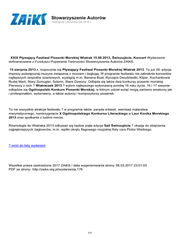 XXIX Pływający Festiwal Piosenki Morskiej Wiatrak 15.08.2013, Świnoujście, Koncert Wydarzenie dofinansowane z Funduszu Popierania Twórczości Stowarzyszenia Autorów ZAiKS. 15 sierpnia 2013 r. rozpocznie się Pływający Festiwal Piosenki Morskiej Wiatrak 2013. To już 29. edycja imprezy poświęconej muzyce związanej z morzem i żeglugą. W programie festiwalu nie zabraknie koncertów najlepszych zespołów szantowych, wystąpią m.in. Banana Boat, Ryczące Dwudziestki, Kliper, Kochankowie Rudej Marii, Stary Szmugler, Sztorm, Stare Dzwony. Odbęda się także dwa konkursy piosenki morskiej. Pierwszy z nich ? Wiatraczek 2013 ? wyłoni najlepszego wykonawcę poniżej 16 roku życia. 16 i 17 sierpnia odbędzie się Ogólnopolski Konkurs Piosenki Morskiej, w którym udział wziąć mogą zarówno amatorzy jak i profesjonaliści, wykonawcy, a także autorzy i kompozytorzy piosenek. To nie wszystkie atrakcje festiwalu ? w programie także: parada orkiestr, wernisaż malarstwa marynistycznego, rozstrzygnięcie X Ogólnopolskiego Konkursu Literackiego o Laur Konika Morskiego 2013 oraz spotkania z ludźmi morza. Równolegle do Wiatraka 2013 odbywać się będzie piąta edycja Sail Świnoujście ? okazja do obejrzenia najpiękniejszych żaglowców, m.in. repliki okrętu flagowego rosyjskiej floty cara Piotra Wielkiego. ? wróć do listy wydarzeń Wszelkie prawa zastrzeżone 2017 ZAiKS / data wygenerowania strony 06.03.2017 23:01:03 PDF ze strony: http://zaiks.org.pl/wydarzenia,176 1/1