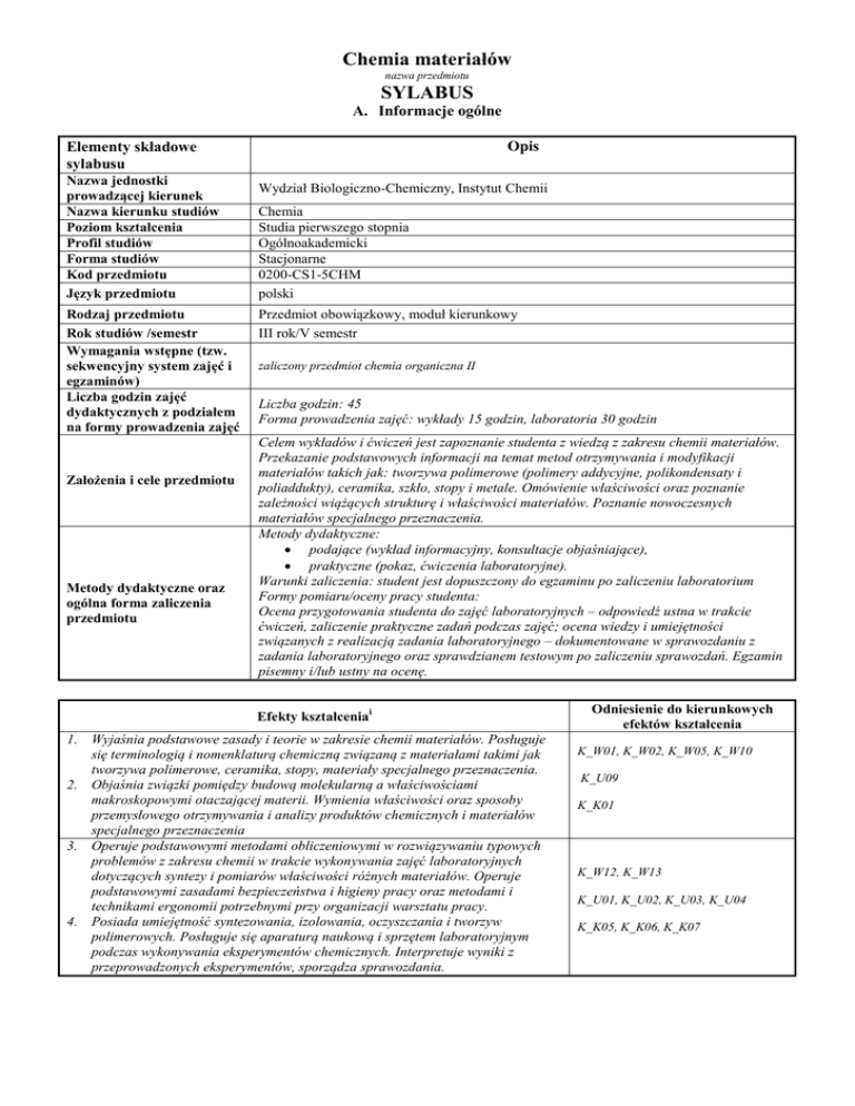 Chemia materiałów nazwa przedmiotu SYLABUS A. Informacje ogólne Elementy składowe sylabusu Opis Nazwa jednostki prowadzącej kierunek Nazwa kierunku studiów Poziom kształcenia Profil studiów Forma studiów Kod przedmiotu Język przedmiotu Wydział Biologiczno-Chemiczny, Instytut Chemii Rodzaj przedmiotu Rok studiów /semestr Wymagania wstępne (tzw. sekwencyjny system zajęć i egzaminów) Liczba godzin zajęć dydaktycznych z podziałem na formy prowadzenia zajęć Przedmiot obowiązkowy, moduł kierunkowy III rok/V semestr Założenia i cele przedmiotu Metody dydaktyczne oraz ogólna forma zaliczenia przedmiotu Chemia Studia pierwszego stopnia Ogólnoakademicki Stacjonarne 0200-CS1-5CHM polski zaliczony przedmiot chemia organiczna II Liczba godzin: 45 Forma prowadzenia zajęć: wykłady 15 godzin, laboratoria 30 godzin Celem wykładów i ćwiczeń jest zapoznanie studenta z wiedzą z zakresu chemii materiałów. Przekazanie podstawowych informacji na temat metod otrzymywania i modyfikacji materiałów takich jak: tworzywa polimerowe (polimery addycyjne, polikondensaty i poliaddukty), ceramika, szkło, stopy i metale. Omówienie właściwości oraz poznanie zależności wiążących strukturę i właściwości materiałów. Poznanie nowoczesnych materiałów specjalnego przeznaczenia. Metody dydaktyczne: podające (wykład informacyjny, konsultacje objaśniające), praktyczne (pokaz, ćwiczenia laboratoryjne). Warunki zaliczenia: student jest dopuszczony do egzaminu po zaliczeniu laboratorium Formy pomiaru/oceny pracy studenta: Ocena przygotowania studenta do zajęć laboratoryjnych – odpowiedź ustna w trakcie ćwiczeń, zaliczenie praktyczne zadań podczas zajęć; ocena wiedzy i umiejętności związanych z realizacją zadania laboratoryjnego – dokumentowane w sprawozdaniu z zadania laboratoryjnego oraz sprawdzianem testowym po zaliczeniu sprawozdań. Egzamin pisemny i/lub ustny na ocenę. Efekty kształceniai 1. Wyjaśnia podstawowe zasady i teorie w zakresie chemii materiałów. Posługuje się terminologią i nomenklaturą chemiczną związaną z materiałami takimi jak tworzywa polimerowe, ceramika, stopy, materiały specjalnego przeznaczenia. 2. Objaśnia związki pomiędzy budową molekularną a właściwościami makroskopowymi otaczającej materii. Wymienia właściwości oraz sposoby przemysłowego otrzymywania i analizy produktów chemicznych i materiałów specjalnego przeznaczenia 3. Operuje podstawowymi metodami obliczeniowymi w rozwiązywaniu typowych problemów z zakresu chemii w trakcie wykonywania zajęć laboratoryjnych dotyczących syntezy i pomiarów właściwości różnych materiałów. Operuje podstawowymi zasadami bezpieczeństwa i higieny pracy oraz metodami i technikami ergonomii potrzebnymi przy organizacji warsztatu pracy. 4. Posiada umiejętność syntezowania, izolowania, oczyszczania i tworzyw polimerowych. Posługuje się aparaturą naukową i sprzętem laboratoryjnym podczas wykonywania eksperymentów chemicznych. Interpretuje wyniki z przeprowadzonych eksperymentów, sporządza sprawozdania. Odniesienie do kierunkowych efektów kształcenia K_W01, K_W02, K_W05, K_W10 K_U09 K_K01 K_W12, K_W13 K_U01, K_U02, K_U03, K_U04 K_K05, K_K06, K_K07 Punkty ECTS Bilans nakładu pracy studentaii Wskaźniki ilościowe Data opracowania: 3 Ogólny nakład pracy studenta: 75 godz. w tym: udział w wykładach i laboratoriach: 45 godz.; przygotowanie się do zajęć i zaliczeń: 24 godz.; udział w konsultacjach, zaliczeniach: 6 godz. Nakład pracy studenta związany z zajęciami iii: Liczba godzin Punkty ECTS 51 2,0 wymagającymi bezpośredniego udziału nauczyciela 60 2,4 o charakterze praktycznym 01.10.2013 Koordynator przedmiotu: dr Agnieszka Z. Wilczewska SYLABUS B. Informacje szczegółowe Elementy składowe sylabusu Opis Nazwa przedmiotu Kod przedmiotu Nazwa kierunku Nazwa jednostki prowadzącej kierunek Język przedmiotu Rok studiów/ semestr Chemia materiałów 0200-CS1-5CHM Chemia Wydział Biologiczno-Chemiczny, Instytut Chemii Liczba godzin zajęć dydaktycznych oraz forma prowadzenia zajęć Prowadzący Treści merytoryczne przedmiotu Liczba godzin: 15 Forma prowadzenia zajęć: wykład 15 godzin Efekty kształcenia wraz ze sposobem ich weryfikacji Forma i warunki zaliczenia przedmiotu Wykaz literatury podstawowej i uzupełniającej polski III rok/V semestr Dr Agnieszka Z. Wilczewska Wykłady: Definicja polimeru i makromolekuł. Główne metody syntezy makromolekuł, podstawowe pojęcia i podział polimerów. Polimeryzacja stopniowa i łańcuchowa. Metody polimeryzacji: w masie, roztworze, emulsji, suspensji, w fazie gazowej, w plazmie. Omówienie właściwości, otrzymywania i zastosowania najważniejszych polimerów (PE, PP, PS, PCV, PMM, PVA, kauczuki naturalne i syntetyczne, fenoplasty, aminoplasty, poliestry i poliamidy, poliuretany, poliwęglany, żywice epoksydowe. Polimery naturalne (biocząsteczki: asfalty, żywice, wielocukry (celuloza, skrobia, chityna,), kwasy nukleinowe (RNA, DNA), białka). Biodegradacja i tworzywa biodegradowalne. Materiały metaliczne, stopy – obróbka cieplna, korozja, erozja. Materiały ceramiczne, szkło - otrzymywanie, właściwości, zastosowanie. Nowoczesne materiały specjalnego przeznaczenia: półprzewodniki i polimery elektroprzewodzące, inteligentne żele, materiały elektroluminescencyjne i fotoluminescencyjne, optoelektroniczne, biokompatybilne, materiały i tworzywa stosowane w budownictwie, materiały kompozytowe, włókna szklane i węglowe, izolatory akustyczne, cieplne i inne). Wyjaśnia podstawowe zasady i teorie w zakresie chemii materiałów. Posługuje się terminologią i nomenklaturą chemiczną związaną z materiałami takimi jak tworzywa polimerowe, ceramika, stopy, materiały specjalnego przeznaczenia. Objaśnia związki pomiędzy budową molekularną a właściwościami makroskopowymi otaczającej materii. Wymienia właściwości oraz sposoby przemysłowego otrzymywania i analizy prod