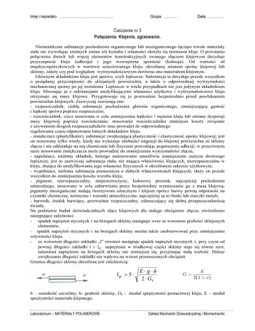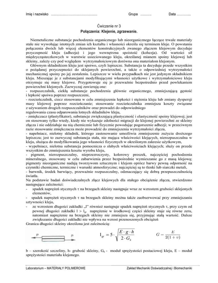 Imię i nazwisko …………………………………… Grupa ………. Data …………. Ćwiczenie nr 3 Połączenia: Klejenie, zgrzewanie. Niemetaliczne substancje pochodzenia organicznego lub nieorganicznego łączące trwale materiały stale nie wywołując istotnych zmian ich kształtu i własności określa się terminem kleje. O powstaniu połączenia dwóch lub więcej elementów konstrukcyjnych zwanego złączem klejowym decyduje przyczepność kleju (adhezja) i jego wewnętrzna spoistość (kohezja). Od wartości sił międzycząsteczkowych w warstwie usieciowanego kleju, określanej mianem spoiny klejowej lub skleiny, zależy czy pod względem wytrzymałościowym dorówna ona materiałom klejonym. Głównym składnikiem kleju jest spoiwo, czyli lepiszcze. Substancja ta decyduje przede wszystkim o pożądanej przyczepności do sklejanych powierzchni, a także o odpowiedniej wytrzymałości mechanicznej spoiny po jej zestaleniu. Lepiszcze w wielu przypadkach nie jest jedynym składnikiem kleju. Mieszając je z substancjami modyfikującymi własności użytkowe i wytrzymałościowe kleju otrzymuje się masy klejowe. Przygotowuje się je przeważnie bezpośrednio przed powlekaniem powierzchni klejonych. Zazwyczaj zawierają one: - rozpuszczalnik, ciekłą substancje pochodzenia głównie organicznego, zmniejszającą gęstość i lepkość spoiwa poprzez rozpuszczeni, - rozcieńczalnik, ciecz stosowana w celu zmniejszenia lepkości i stężenia kleju lub zmiany dyspersji masy klejowej poprzez rozcieńczanie; stosowanie rozcieńczalnika zmniejsza koszty związane z używaniem drogich rozpuszczalników oraz prowadzi do odpowiedniego regulowania czasu odparowania lotnych składników kleju, - zmiękczacz (plastyfikator), substancje zwiększającą plastyczność i elastyczność spoiny klejowej; jest on stosowany tylko wtedy, kiedy nie wykazuje zdolności migracji do klejonej powierzchni ze skleiny złącza i nie oddziałuje na nią chemicznie lub fizycznie powodując pogorszenie adhezji; w przeciwnym razie stosowanie zmiękczacza może prowadzić do zmniejszenia wytrzymałości złącza, - napełniacz, nielotny składnik, którego zastosowanie umożliwia zmniejszenie zużycia droższego lepiszcza; jest to zazwyczaj substancja stała, nie mająca właściwości klejących, nierozpuszczalna w kleju, służąca do modyfikowania jego własności fizycznych w określonym zakresie użytkowym, - wypełniacz, nielotna substancja pomocnicza o słabych właściwościach klejących; służy on przede wszystkim do zmniejszenia kosztu wyrobu kleju, - pigment, nierozpuszczalny, nieprzezroczysty, kolorowy proszek, najczęściej pochodzenia mineralnego, stosowany w celu zabarwienia przez bezpośrednie wymieszanie go z masą klejową; pigmenty nieorganiczne nadają tworzywom sztucznym i klejom oprócz barwy pewną odporność na czynniki chemiczne, termiczne i warunki atmosferyczne; najczęściej są to tlenki lub siarczki metali, - barwnik, środek barwiący, przeważnie rozpuszczalny, odznaczający się dobrą przepuszczalnością światła. Na podstawie badań doświadczalnych złącz klejowych dla stałego obciążenie złącza, stwierdzono następujące zależności: - spadek naprężeń stycznych τ na brzegach skleiny następuje wraz ze wzrostem grubości sklejonych elementów, - spadek naprężeń stycznych τ na brzegach skleiny można także zaobserwować przy zmniejszaniu sztywności kleju, - ze wzrostem długości zakładki „l” również następuje spadek naprężeń stycznych τ, przy czym od pewnej długości zakładki l > lgr naprężenie w środkowej części skleiny staje się równe zeru, natomiast naprężenie na brzegach skleiny nie zmniejsza się, przyjmując stałą wartość. Dalsze zwiększanie długości zakładki nie wpływa na wzrost przenoszonych obciążeń Granica długości skleiny określona jest zależnością: l gr = 5 ⋅ E ⋅ g ⋅h 2 ⋅ Gk b – szerokość szczeliny, h- grubość skleiny, Gk - moduł sprężystości postaciowej kleju, E – moduł sprężystości materiału klejonego. Laboratorium – MATERIAŁY POLIMEROWE Zakład Mechaniki Doświadczalnej i Biomechaniki Dobre przygotowanie powierzchni do klejenia jest decydującym warunkiem uzyskania wytrzymałego złącza. Ten początkowy etap procesu technologicznego klejenia musi zapewnić: - usunięcie wszystkich zanieczyszczeń powierzchniowych (brudów, pyłów, luźno związanych warstw korozyjnych oraz tłuszczów) , -uzyskanie właściwego rozwinięcia powierzchni - uzyskanie dobrego uaktywnienia powierzchni. W celu ułatwienia procesu klejenia wprowadzono preparaty czyszczące oraz przygotowujące powierzchnię do właściwego procesu klejenia: • Cleanery – preparaty czyszczące oraz zwiększające przyczepność i przyleganie klejów • Aktywatory - preparaty do czyszczenia i aktywowania powierzchni • Primery (podkłady/grunty) - preparaty do przygotowania powierzchni (stosowane głównie w klejeniu materiałów gdzie adhezja jest słaba, np. szkło, ceramika, metale) Zadania do wykonania: Sklejenie po uprzednim oczyszczeniu i odtłuszczeniu oraz rozwinięciu powierzchni poprzez obróbkę płomieniową (poliamid) lub potarcie papierem ściernym (aluminium) dwóch płaskich próbek. Obliczyć długość graniczną dla klejonych elementów - przyjmując moduł sprężystości postaciowej kleju epoksydowego - Gk = 2000 [MPa]. Dodatkowo opisać swoje doświadczenia złe i dobre z klejeniem różnych przedmiotów i dokładnie uzasadnić sukcesy i porażki. ZGRZEWANIE STYKOWE (kondukcyjne) – ogrzanie łączonych przedmiotów poprzez zetknięcie ich z ogrzanym przedmiotem (stempel, rolki). Istnieją dwa zasadnicze rodzaje zgrzewania stykowego: punktowe i liniowe. Stempel, stół, rolki dociskowe są ogrzewane, natomiast zgrzewane przedmioty: folie, cienkie płyty, itp. zmieniają położenie względem elementów dociskających. Pod wpływem ciepła następuje miejscowe mięknienie twor