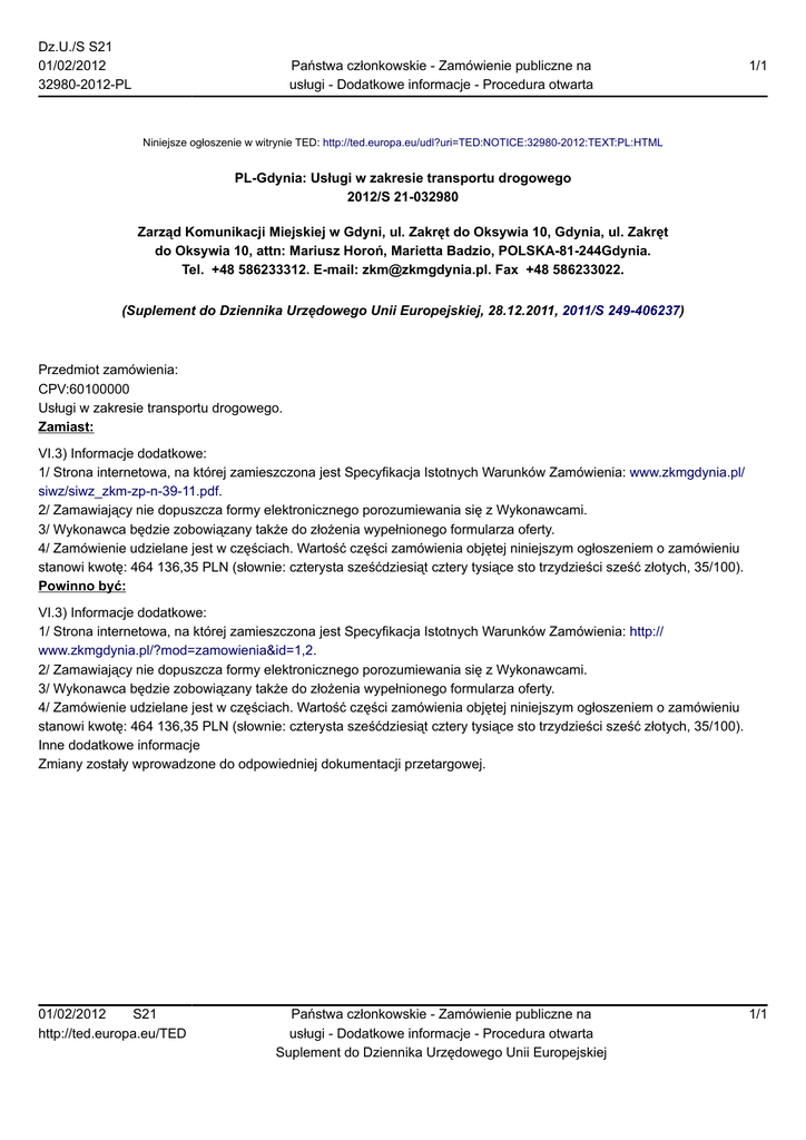 Dz.U./S S21 01/02/2012 32980-2012-PL Państwa członkowskie - Zamówienie publiczne na usługi - Dodatkowe informacje - Procedura otwarta 1/1 Niniejsze ogłoszenie w witrynie TED: http://ted.europa.eu/udl?uri=TED:NOTICE:32980-2012:TEXT:PL:HTML PL-Gdynia: Usługi w zakresie transportu drogowego 2012/S 21-032980 Zarząd Komunikacji Miejskiej w Gdyni, ul. Zakręt do Oksywia 10, Gdynia, ul. Zakręt do Oksywia 10, attn: Mariusz Horoń, Marietta Badzio, POLSKA-81-244Gdynia. Tel. +48 586233312. E-mail: [email protected]. Fax +48 586233022. (Suplement do Dziennika Urzędowego Unii Europejskiej, 28.12.2011, 2011/S 249-406237) Przedmiot zamówienia: CPV:60100000 Usługi w zakresie transportu drogowego. Zamiast: VI.3) Informacje dodatkowe: 1/ Strona internetowa, na której zamieszczona jest Specyfikacja Istotnych Warunków Zamówienia: www.zkmgdynia.pl/ siwz/siwz_zkm-zp-n-39-11.pdf. 2/ Zamawiający nie dopuszcza formy elektronicznego porozumiewania się z Wykonawcami. 3/ Wykonawca będzie zobowiązany także do złożenia wypełnionego formularza oferty. 4/ Zamówienie udzielane jest w częściach. Wartość części zamówienia objętej niniejszym ogłoszeniem o zamówieniu stanowi kwotę: 464 136,35 PLN (słownie: czterysta sześćdziesiąt cztery tysiące sto trzydzieści sześć złotych, 35/100). Powinno być: VI.3) Informacje dodatkowe: 1/ Strona internetowa, na której zamieszczona jest Specyfikacja Istotnych Warunków Zamówienia: http:// www.zkmgdynia.pl/?mod=zamowienia&id=1,2. 2/ Zamawiający nie dopuszcza formy elektronicznego porozumiewania się z Wykonawcami. 3/ Wykonawca będzie zobowiązany także do złożenia wypełnionego formularza oferty. 4/ Zamówienie udzielane jest w częściach. Wartość części zamówienia objętej niniejszym ogłoszeniem o zamówieniu stanowi kwotę: 464 136,35 PLN (słownie: czterysta sześćdziesiąt cztery tysiące sto trzydzieści sześć złotych, 35/100). Inne dodatkowe informacje Zmiany zostały wprowadzone do odpowiedniej dokumentacji przetargowej. 01/02/2012 S21 http://ted.europa.eu/TED Państwa członkowskie - Zamówienie publiczne na usługi - Dodatkowe informacje - Procedura otwarta Suplement do Dziennika Urzędowego Unii Europejskiej 1/1