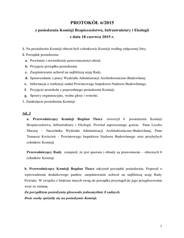 PROTOKÓŁ 6/2015 z posiedzenia Komisji Bezpieczeństwa, Infrastruktury i Ekologii z dnia 18 czerwca 2015 r. 1. Na posiedzeniu Komisji obecni byli członkowie Komisji według załączonej listy. 2. Porządek posiedzenia: a. Powitanie i stwierdzenie prawomocności obrad. b. Przyjęcie porządku posiedzenia. c. Zaopiniowanie uchwał na najbliższą sesję Rady. d. Sprawozdanie z pracy Wydziału Administracji Architektoniczno-Budowlanej. e. Informacja o realizacji zadań Powiatowego Inspektora Nadzoru Budowlanego. f. Przyjęcie protokołu z poprzedniego posiedzenia Komisji. g. Sprawy organizacyjne, wolne głosy i wnioski. 3. Zamknięcie posiedzenia Komisji. Ad. 2 a. Przewodniczący Komisji Bogdan Tkocz otworzył 6 posiedzenie Komisji Bezpieczeństwa, Infrastruktury i Ekologii. Powitał zaproszonego gościa: Pana Leszka Macurę – Naczelnika Wydziału Administracji Architektoniczno-Budowlanej, Pana Tomasza Kwiecień – Powiatowego Inspektora Nadzoru Budowlanego oraz przybyłych członków Komisji. Przewodniczący Rady oznajmił, że jest quorum i obrady są prawomocne – obecnych 8 członków Komisji. b. Przewodniczący Komisji Bogdan Tkocz odczytał porządek posiedzenia. Poprosił o wprowadzenie dodatkowego punktu: zaopiniowanie uchwał na najbliższą sesję Rady Powiatu. W związku z brakiem innych uwag do porządku przystąpił do jego przegłosowania wraz ze zmianą. Za porządkiem posiedzenia głosowało jednomyślnie 8 radnych. Dwie osoby spóźniły się na posiedzenie Komisji. 1 c. Przewodniczący Komisji oddał głos Pani Danucie Bywalec – Skarbnikowi Powiatu w celu przedstawienie projektów uchwał. Pani Skarbnik poinformowała, iż na dzisiejszej Komisji omówi trzy powiązane ze sobą projekty uchwał: 1) projekt uchwały w sprawie emisji obligacji komunalnych oraz zasad ich zbywania i wykupu. Projekt stanowi załącznik nr 1 do protokołu. Pani Danuta Bywalec wyjaśniła, iż wczesniejsze propozycje podjęcia uchwał dotyczących konsolidacji zadłużenia nie uzyskały aporobaty Regionalnej Izby Obrachunkowej. Jedną z propozycji rozwiązań poprawy wskaźników zadłużenia, którą zaakceptowała RIO jest emisja obligacji. Przedstawiony projekt uchwały stanowi początek i podstawę prawną procedury uruchamiania emisji obligacji komunalnych w trybie emisji niepublicznej. Emisja obligacji ma na celu poprawę wartości wskaźnika obsługi zadłużenia w latach 2015-2020, poprzez pozyskanie środków pieniężnych na wcześniejszą spłatę rat kapitałowych z tytułu zaciągniętych kredytów. Obligacje komunalne spełniają funkcję kredytu konsolidacyjnego, jednak są dla Powiatu bardziej korzystne niż tradycyjny komercyjny kredyt bankowy. Wynika to przede wszystkim z uwagi na ich elastyczność. Dają możliwość określenia takich terminów wykupu (spłaty kapitału), które zapewniają bezpieczeństwo w zakresie płynności finansowej budżetu. Uchwała określa ogólne warunki emisji, m. in. wielkość emisji, podział na transze i serie, długość życia poszczególnych obligacji, sposób emisji. Ogólne określenie warunków emisji obligacji jest niezbędne w celu przeprowadzenia negocjacji w sprawie wyboru agenta emisji obligacji, który będzie organizatorem, depozytariuszem i gwarantem emisji. Uchwała określa równocześnie granice, w których oferenci mogą przygotowywać swoje oferty. Emisja obligacji komunalnych poprzez poprawę wskaźników zapewni środki na rozwój Powiatu, możliwość dokonywania nowych inwestycji zarówno w roku bieżącym jak i w latach następnych. 2) projekt uchwały w sprawie zmiany Wieloletniej Prognozy Finansowej Powiatu Mikołowskiego na okres od 2015 do o2026 roku 3) projekt uchwały w sprawie zmiany budżetu. Pani Skarbnik poinformowała, iż uchwała w sprawie zmiany budżetu w części obejmującej działalność Komisji dotyczy głównie przeznaczenia środków (z oszczędności na rozchodach przy ewentualnej emisji obligacji) na zadania drogowe. W rozdziale 60014 „Drogi publiczne powiatowe” wydatki zostaną zwiększone o kwotę 231.974 zł na wykonanie tzw. cichych nawierzchni na drogach powiatowych. Natomiast w 2 rozdziale 90019 zabezpieczono dodatkowo 58 026 zł na ten cel. W sumie na to zadanie drogowe zaplanowano kwotę 300 000 zł. Ponadto uchwała zakłada także : - zwiększenie środków o kwotę 30.197 zł z dotacji z gminy Orzesze, na zadaniu „wymiana nawierzchni ciąg pieszy ul. Żorska w Orzeszu”, po tych zmianach łącznie na to zadanie zaplanowano kwotę 90.197 zł. - po przetargach na zadania drogowe środki na niektóre z nich zostały zmniejszone zgodnie z zapisami w projekcie uchwały. - wprowadzenie planu wydatków w kwocie 2.250 zł na Fundusz Wsparcia Policji (rozdział 75404- „ Komendy wojewódzkie Policji) z przeznaczeniem na wypłatę nagród dla funkcjonariuszy Komendy Powiatowej Policji w Mikołowie - w rozdziale 75495- „Pozostała działalność”- zabezpieczenie środków na opłacenie usług za parkowanie usuniętych z dróg publicznych pojazdów w kwocie 30 000 zł oraz dla Wydziału Zarządzania Bezpieczeństwem w kwocie 10 000 zł. Pani Bywalec poinformowała, iż zmiany zwarte w uchwale w sprawie zmiany budżetu znajdują swoje odzwierciedleniem w uchwale dotyczącej Wieloletniej Prognozy Finansowej. Radna Elżbieta Piecha zapytała, które odcinki dróg powiatowych zostaną objęte zadaniem nowych cichych nawierzchni asfaltowych. Pani Skarbnik odpowiedziała, że to zadanie jest nowe, a Dyrektor Powiatowego Zarządu Dróg przebywa obecnie na urlopie, więc wybór odcinków dróg dopiero się rozstrzygnie. Konieczność podjęcia uchwały w szybkim trybie wynika po części z lipcowej przerwy w pracach Rady Powiatu. Radny Henryk Stencel zapytał o przyczyny emisji obligacji. Pani Skarbnik odpowiedziała, że obligacje emituje się głównie po to aby spełnić wskaźnik na następne lata, wydłuża się również okres spłaty, spada roczna kwota spłaty i przy okazji uwa