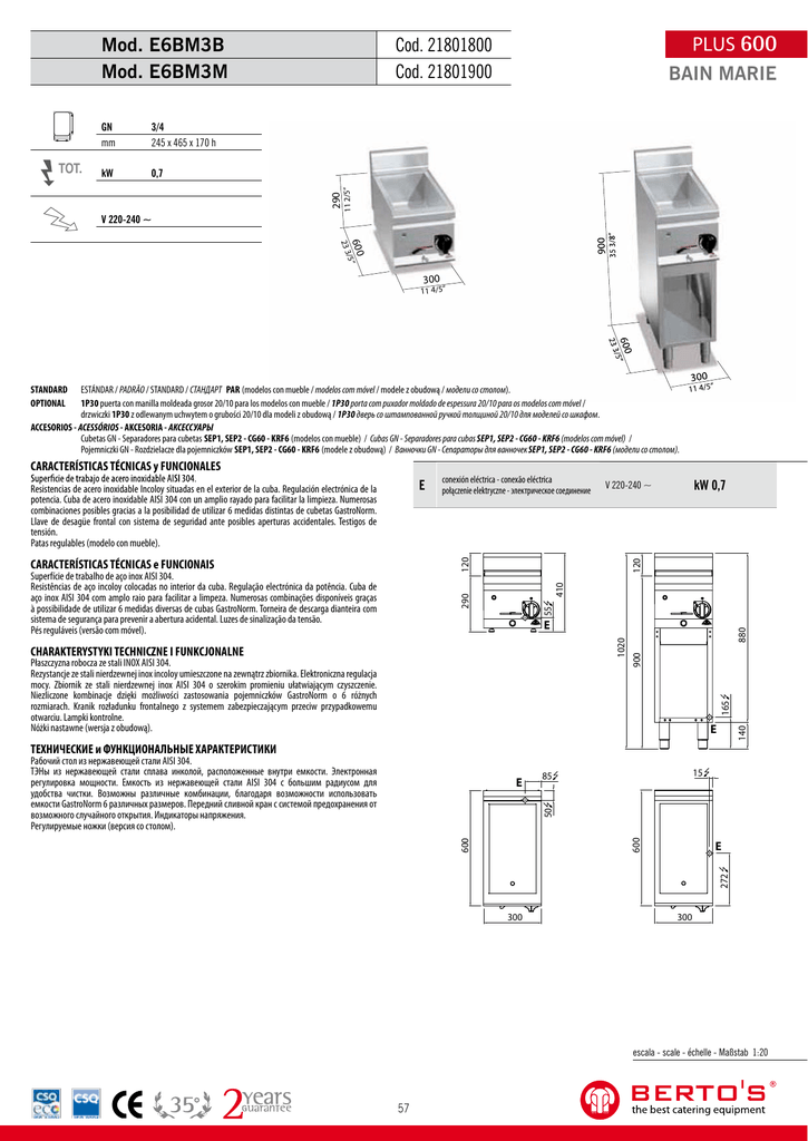 Mod. E6BM3B Mod. E6BM3M kW 0,7 290 TOT. 3/4 245 x 465 x 170 h 11 2/5” TOT. GN mm PLUS 600 BAIN MARIE Cod. 21801800 Cod. 21801900 V 220-240 ~ / 23 3 600 5” 300 11 4/5” STANDARD OPTIONAL ESTÁNDAR / PADRÃO / STANDARD / СТАНДАРТ PAR (modelos con mueble / modelos com móvel / modele z obudową / модели со столом). 1P30 puerta con manilla moldeada grosor 20/10 para los modelos con mueble / 1P30 porta com puxador moldado de espessura 20/10 para os modelos com móvel / drzwiczki 1P30 z odlewanym uchwytem o grubości 20/10 dla modeli z obudową / 1P30 дверь со штампованной ручкой толщиной 20/10 для моделей со шкафом. ACCESORIOS - ACESSÓRIOS - AKCESORIA - АКСЕССУАРЫ Cubetas GN - Separadores para cubetas SEP1, SEP2 - CG60 - KRF6 (modelos con mueble) / Cubas GN - Separadores para cubas SEP1, SEP2 - CG60 - KRF6 (modelos com móvel) / Pojemniczki GN - Rozdzielacze dla pojemniczków SEP1, SEP2 - CG60 - KRF6 (modele z obudową) / Ванночки GN - Сепараторы для ванночек SEP1, SEP2 - CG60 - KRF6 (модели со столом). CARACTERÍSTICAS TÉCNICAS y FUNCIONALES E Resistencias de acero inoxidable Incoloy situadas en el exterior de la cuba. Regulación electrónica de la potencia. Cuba de acero inoxidable AISI 304 con un amplio rayado para facilitar la limpieza. Numerosas combinaciones posibles gracias a la posibilidad de utilizar 6 medidas distintas de cubetas GastroNorm. Llave de desagüe frontal con sistema de seguridad ante posibles aperturas accidentales. Testigos de tensión. Patas regulables (modelo con mueble). 120 410 55 290 Superfície de trabalho de aço inox AISI 304. Resistências de aço incoloy colocadas no interior da cuba. Regulação electrónica da potência. Cuba de aço inox AISI 304 com amplo raio para facilitar a limpeza. Numerosas combinações disponíveis graças à possibilidade de utilizar 6 medidas diversas de cubas GastroNorm. Torneira de descarga dianteira com sistema de segurança para prevenir a abertura acidental. Luzes de sinalização da tensão. Pés reguláveis (versão com móvel). kW 0,7 V 220-240 ~ 120 CARACTERÍSTICAS TÉCNICAS e FUNCIONAIS conexión eléctrica - conexão eléctrica połączenie elektryczne - электрическое соединение CHARAKTERYSTYKI TECHNICZNE I FUNKCJONALNE 880 165 Płaszczyzna robocza ze stali INOX AISI 304. Rezystancje ze stali nierdzewnej inox incoloy umieszczone na zewnątrz zbiornika. Elektroniczna regulacja mocy. Zbiornik ze stali nierdzewnej inox AISI 304 o szerokim promieniu ułatwiającym czyszczenie. Niezliczone kombinacje dzięki możliwości zastosowania pojemniczków GastroNorm o 6 różnych rozmiarach. Kranik rozładunku frontalnego z systemem zabezpieczającym przeciw przypadkowemu otwarciu. Lampki kontrolne. Nóżki nastawne (wersja z obudową). 900 1020 E 140 E ТЕХНИЧЕСКИЕ и ФУНКЦИОНАЛЬНЫЕ ХАРАКТЕРИСТИКИ Рабочий стол из нержавеющей стали AISI 304. ТЭНы из нержавеющей стали сплава инколой, расположенные внутри емкости. Электронная регулировка мощности. Емкость из нержавеющей стали AISI 304 с большим радиусом для удобства чистки. Возможны различные комбинации, благодаря возможности использовать емкости GastroNorm 6 различных размеров. Передний сливной кран с системой предохранения от возможного случайного открытия. Индикаторы напряжения. Регулируемые ножки (версия со столом). 15 85 E 272 600 600 50 E 300 300 escala - scale - échelle - Maßstab 1:20 57