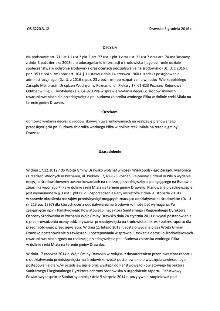 OŚ.6220.3.12 Drawsko 5 grudnia 2016 r. DECYZJA Na podstawie art. 71 ust 1 i ust 2 pkt 2 art. 77 ust 1 pkt 1 oraz ust. 3 i ust 7 oraz art. 74 ust 3ustawy z dnia 3 października 2008 r. o udostępnianiu informacji o środowisku i jego ochronie udziale społeczeństwa w ochronie środowiska oraz ocenach oddziaływania na środowisko (Dz. U. z 2016 r. poz. 353 z późn. zm) oraz art. 104 § 1 ustawy z dnia 14 czerwca 1960 r. Kodeks postępowania administracyjnego (Dz. U. z 2016 r. poz. 23 z późn zm) po rozpatrzeniu wniosku Wielkopolskiego Zarządu Melioracji i Urządzeń Wodnych w Poznaniu, ul. Piekary 17, 61-823 Poznań, Rejonowy Oddział w Pile, ul. Motylewska 7, 64-920 Piła w sprawie wydania decyzji o środowiskowych uwarunkowaniach dla przedsięwzięcia pn: budowa zbiornika wodnego Piłka w dolinie rzeki Miała na terenie gminy Drawsko. Orzekam odmówić wydania decyzji o środowiskowych uwarunkowaniach na realizację planowanego przedsięwzięcia pn: Budowa zbiornika wodnego Piłka w dolinie rzeki Miała na terenie gminy Drawsko. Uzasadnienie W dniu 17.12.2012 r do Wójta Gminy Drawsko wpłynął wniosek Wielkopolskiego Zarządu Melioracji i Urządzeń Wodnych w Poznaniu, ul. Piekary 17, 61-823 Poznań, Rejonowy Oddział w Pile o wydanie decyzji o środowiskowych uwarunkowaniach na realizację przedsięwzięcia polegającego na Budowie zbiornika wodnego Piłka w dolinie rzeki Miała na terenie gminy Drawsko. Planowane przedsięwzięcie jest wymienione w § 3 ust 1 pkt 66 d Rozporządzenia Rady Ministrów z dnia 9 listopada 2010 r w sprawie określenia rodzajów przedsięwzięć mogących znacząco oddziaływać na środowisko (Dz. U nr 213 poz 1397) dla których ocena oddziaływania na środowisko może być wymagana. Po zasięgnięciu opinii Państwowego Powiatowego Inspektora Sanitarnego i Regionalnego Dyrektora Ochrony Środowiska w Poznaniu Wójt Gminy Drawsko dnia 24 stycznia 2013 r. wydał postanowienie o przeprowadzeniu oceny oddziaływania przedsięwzięcia na środowisko i określił zakres raportu dla przedmiotowego przedsięwzięcia. W dniu 11 lutego 2013 r. zostało wydane przez Wójta Gminy Drawsko postanowienie o zawieszeniu postępowania w sprawie uzyskania decyzji o środowiskowych uwarunkowaniach zgody na realizację przedsięwzięcia pn: : Budowa zbiornika wodnego Piłka w dolinie rzeki Miała na terenie gminy Drawsko. W dniu 17 czerwca 2014 r. Wójt Gminy Drawsko w związku z dostarczeniem przez inwestora raportu o oddziaływaniu przedsięwzięcia na środowisko wydał postanowienie o wszczęciu zawieszonego postępowania dla w/w przedsięwzięcia oraz wystąpił do Państwowego Powiatowego Inspektora Sanitarnego i Regionalnego Dyrektora ochrony Środowiska o uzgodnienie raportu. Państwowy Powiatowy Inspektor Sanitarny opinią z dnia 5 sierpnia 2014 r. pozytywnie zaopiniował pod względem wymagań higienicznych i zdrowotnych przedmiotowe przedsięwzięcie natomiast Regionalny Dyrektor Ochrony Środowiska postanowieniem z dnia 7 maja 2015 r i postanowieniem z dnia 4 listopada 2016 r. postanowił odmówić uzgodnienia warunków realizacji przedsięwzięcia polegającego na budowie zbiornika wodnego Piłka w dolinie rzeki Miała na terenie gminy Drawsko. Na podstawie art. 77 ust. 1 pkt 1 ustawy o udostępnianiu informacji o środowisku i jego ochronie, udziale społeczeństwa w ochronie środowiska oraz o ocenach oddziaływania na środowisko, dalej ustawa ooś, organem właściwym do uzgodnienia warunków realizacji przedmiotowej inwestycji jest regionalny dyrektor ochrony środowiska. W toku prowadzonego postępowania Regionalny Dyrektor pismem z 26.07.2016r., znak: WOO-I.4242.133.2016.IJ.2 wezwał Inwestora do uzupełnienia raportu o oddziaływaniu na środowisko m.in. w zakresie ochrony przyrody oraz ochrony przed hałasem. Inwestor zwracał się do Regionalnego Dyrektora z wnioskiem o przedłużenie terminu złożenia wyjaśnień – do 02.09.2016r. i następnie do 30.09.2016r., na co Regionalny Dyrektor wyraził zgodę. Ostatecznie uzupełnienie do raportu zostało przedłożone 05.10.2016r. Zakres inwestycji obejmuje wykonanie czaszy zbiornika oraz podniesienie fragmentu terenu wokół jego obrzeża, budowę ziemnej zapory czołowej wraz z niezbędną infrastrukturą, w tym budowlą przelewowo – upustową, regulację rzeki Miała na odcinku 40 m poniżej zapory, przebudowę przepustu oraz przebudowę linii energetycznych. Planowany zbiornik przy NPP=43,50 m n.p.m. zajmowałby powierzchnię ok. 66,22 ha oraz charakteryzowałby się średnią głębokością 1,16 m. Projektowany zbiornik położony będzie w obrębie obszaru specjalnej ochrony ptaków Puszcza Notecka PLB300015 i obszaru chronionego krajobrazu Puszcza Notecka. W odległości ok. 5 km od inwestycji, na rzece Miała, znajduje się obszar mający znaczenie dla Wspólnoty Dolina rzeki Miały. Przedmiotami ochrony obszaru specjalnej ochrony ptaków Puszcza Notecka PLB300015 (zgodnie z SDF umieszczonym na stronie http://natura2000.gdos.gov.pl/ data dostępu 28.10.2016r.) jest 20 gatunków ptaków z załącznika I dyrektywy ptasiej, tj.: bąk Botaurus stellaris, bocian czarny Ciconia nigra, trzmielojad Pernis apivorus, dzięcioł czarny Dryocopus martius, dzięcioł średni Dendrocopos medius, gąsiorek Lanius collurio, jarzębatka Sylvia nisoria, kania czarna Milvus migrant, kania ruda Milvus milvus, lelek Caprimulgus europaeus, lerka Lullula arboreta, łabędź krzykliwy Cygnus cygnus , podgorzałka Aythya nyroca, puchacz Bubo Bubo, włochatka Aegolius funereus, rybołów Pandion haliaetus, zimorodek Alcedo atthis, muchołówka mała Ficedula parva i żuraw Grus grus oraz pięć gatunków ptaków migrujących niewymienionych w załączniku I dyrektywy ptasiej , tj.: gęś białoczelna Anser albifrons, gęś zbożowa Anser fabalis, gągoł Bucephala clangula, łabędź niemy Cygnus olor i nurogęś Mergus merganser. Obszar Natura 2000 posiada plan zadań ochronnych ustanowionych zarządzeniem Regio
