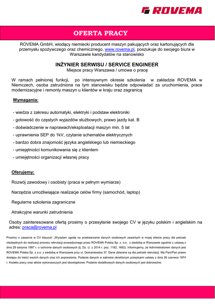OFERTA PRACY ROVEMA GmbH, wiodący niemiecki producent maszyn pakujących oraz kartonujących dla przemysłu spożywczego oraz chemicznego, www.rovema.pl, poszukuje do swojego biura w Warszawie kandydatów na stanowisko INŻYNIER SERWISU / SERVICE ENGINEER Miejsce pracy Warszawa / umowa o pracę W ramach pełnionej funkcji, po intensywnym okresie szkolenia w zakładzie ROVEMA w Niemczech, osoba zatrudniona na tym stanowisku będzie odpowiadać za uruchomienia, prace modernizacyjne i remonty maszyn u klientów w kraju oraz zagranicą Wymagania: - wiedza z zakresu automatyki, elektryki i podstaw elektroniki - gotowość do częstych wyjazdów służbowych, prawo jazdy kat. B - doświadczenie w naprawach/eksploatacji maszyn min. 5 lat - uprawnienia SEP do 1kV, czytanie schematów elektrycznych - bardzo dobra znajomość języka angielskiego lub niemieckiego - umiejętności komunikowania się z klientem - umiejętności organizacji własnej pracy Oferujemy: Rozwój zawodowy i osobisty (praca w pełnym wymiarze) Narzędzia umożliwiające realizacje celów firmy (samochód, laptop) Regularne szkolenia zagraniczne Atrakcyjne warunki zatrudnienia Osoby zainteresowane ofertą prosimy o przesyłanie swojego CV w języku polskim i angielskim na adres: [email protected] Prosimy o zawarcie w CV klauzuli: „Wyrażam zgodę na przetwarzanie danych osobowych zawartych w mojej ofercie pracy dla potrzeb niezbędnych do realizacji procesu rekrutacji prowadzonego przez ROVEMA Polska Sp. z. o.o. z siedzibą w Warszawie zgodnie z ustawą z dnia 29 sierpnia 1997 r. o ochronie danych osobowych (tj. Dz. U. z 2014 r. poz. 1182, 1662). Informujemy, że Administratorem danych jest ROVEMA Polska Sp. z o.o. z siedzibą w Warszawie przy ul. Domaniewska 37. Dane zbierane są dla potrzeb rekrutacji. Ma Pani/Pan prawo dostępu do treści swoich danych oraz ich poprawiania. Podanie danych w zakresie określonym przepisami ustawy z dnia 26 czerwca 1974 r. Kodeks pracy oraz aktów wykonawczych jest obowiązkowe. Podanie dodatkowych danych osobowych jest dobrowolne.