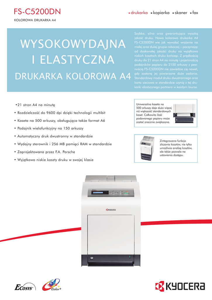 FS-C5200DN drukarka kopiarka skaner fax KOLOROWA DRUKARKA A4 WYSOKOWYDAJNA I ELASTYCZNA DRUKARKA KOLOROWA A4 •21 stron A4 na minut´ • RozdzielczoÊç do 9600 dpi dzi´ki technologii multibit • Kaseta na 500 arkuszy, obsługujàca tak˝e format A6 Szybka, silna oraz gwarantujàca wysokà jakoÊç druku. Nowa kolorowa drukarka A4 FS-C5200DN wie jak wywołaç wra˝enie na małej oraz du˝ej grupie roboczej – poczynajàc od doskonałej jakoÊci druku na wyjàtkowo niskich kosztach druku koƒczàc. Z pr´dkoÊcià druku do 21 stron A4 na minut´ i pojemnoÊcià podajników papieru do 2150 arkuszy z pewnoÊcià FS-C5200DN nie zawiedzie ci´ nawet, gdy zostanà jej powierzone du˝e zadania. Standardowy moduł druku dwustronnego oraz karta sieciowa w standardzie czynià z tej drukarki elastycznego partnera w ka˝dym biurze. Uniwersalna kaseta na 500 arkuszy daje du˝o wi´cej ni˝ wi´kszoÊç standardowych kaset. Całkowita iloÊç podawanego papieru mo˝e zostaç znacznie zwi´kszona. • Podajnik wielofunkcyjny na 150 arkuszy • Automatyczny druk dwustronny w standardzie • Wydajny sterownik i 256 MB pami´ci RAM w standardzie • Zaprojektowana przez F.A. Porsche • Wyjàtkowo niskie koszty druku w swojej klasie Zintegrowana funkcja zliczania kosztów, nie tylko umo˝liwia analiz´ kosztów, ale tak˝e pozwala na ustawienia dost´pu. FS-C5200DN KOLOROWA DRUKARKA A4 KM-NetViewer: KM-NetViewer umo˝liwia całkowite monitorowanie i kontrol´ wszystkich drukarek Kyocera opartych na systemie ECOSYS oraz laserowych urzàdzeƒ wielofunkcyjnych Kyocera pracujàcych w systemie operacyjnym Windows, co z kolei umo˝liwia doskonałà administracj´ sieciowà. KM-NetViewer obsługuje tak˝e standardowy protokół SNMP. PRESCRIBE IIc Prescribe IIe jest zarówno j´zykiem sterujàcym, jak i j´zykiem opisu strony. To dzi´ki niemu mo˝liwe jest drukowanie kompleksowej grafiki, loga oraz formularzy pod ka˝dym systemem operacyjnym. Prescribe IIc umo˝liwia tak˝e, póêniejsze zapisywanie i aktualizowanie ju˝ z poziomu drukarki. NARZ¢DZIA MONITOROWANIA i ZARZÑDZANIA DRUKARKÑ: Ustawienia drukarki mogà byç sprawdzone w formie wizualnej i poprawione za pomocà komputera osobistego. Rozwiàzanie Status monitor zapewnia łatwà zmian´ ustawieƒ drukarki i sprawdzania jej statusu za pomocà złàcza USB. KM-NET Viewer to zaawansowany system operacyjny, słu˝àcy do zarzàdzania drukarkà u˝ywajàcy standardowego protokołu SNMP. INTERFEJS USB DLA PAMI¢CI PRZENOÂNEJ USB FLASH Pliki PDF mogà byç drukowane bezpoÊrednio z pami´ci przenoÊnych USB (poprzez dedykowany port USB). Pliki przeznaczone do drukowania wybierane sà z panelu operacyjnego drukarki. Do przeprowadzenia tej operacji komputer nie jest wymagany. System ECOSYS został stworzony dla zmniejszenia kosztów utrzymania i eksploatowania drukarek. Ta unikalna technologia pozwala zredukowaç wydatki potrzebne na u˝ytkowanie urzàdzeƒ. Kyocera zapewnia tak˝e innowacyjnà technologi´ oddzielnej wymiany b´bna i tonera. Teraz nie trzeba ju˝ wyrzucaç sprawnego b´bna połàczonego z pojemnikiem na toner. Wystarczy jedynie wymieniç pojemnik z tonerem. Dzi´ki temu oszcz´dza u˝ytkownik, jednoczeÊnie bardziej dbajàc o Êrodowisko. OGÓLNE KONTROLER Technologia: Laserowa, Kyocera Mita ECOSYS SzybkoÊç drukowania: 21 stron A4 na minut´ Czas wydruku pierwszej strony: 10,5 sekundy dla wydruków czarno-białych, 12 sekund lub mniej dla wydruków kolorowych RozdzielczoÊç: 600 x 600 dpi;Technologia Multi-Bit pozwala na drukowanie w rozdzielczoÊci 9600 x 600 dpi Obcià˝alnoÊç: 65,000 stron Poziom hałasu (ISO 7779): Drukowanie: 53 dB(A) Czuwanie: 36 dB(A) Tryb oszcz´dzania energii (power-saving): niemierzalnie niski Pobór mocy: Drukowanie: 420 W Czuwanie: 70 W UÊpienie (ECOpower): 7 W Zasilanie: AC 220 – 240V, 50/60Hz Wymiary: (szer. x gł´b. x d∏.) 345 x 518 x 480 mm Waga: 29 kg Certyfikaty: GS/TÜV/CE Drukarki produkowane zgodnie z normà jakoÊci ISO 9001 i normà ochrony Êrodowiska ISO 14001 Pami´ç: 256 MB, maksymalnie 1280 MB Procesor: PowerPC 440 / 553 MHz Emulacje: PCL6, PCL5c, PJL, KPDL3 (PostScript 3*) z automatycznym przełàczaniem emulacji (AES), Drukowanie bezpoÊrednie XPS, Drukowanie bezpoÊrednie PDF Sterownik: Wszystkie powszechne systemy operacyjne Windows, Mac OS X wersja 10.2 lub wy˝sza, UNIX, LINUX oraz inne ˝àdane systemy operacyjne J´zyk sterujàcy: Prescribe IIc Czcionki: 93 czcionek kraw´dziowych dost´pnych we wszystkich emulacjach, 8 czcionek dla systemu Windows Vista* czcionka bitmapowa, 45 typów czcionek kodów kreskowych jednowymiarowych, jeden typ czcionek kodów kreskowych dwuwymiarowych (PDF-417) Interfejs standardowy: USB 2.0 (pełna szybkoÊç), gniazdo USB przeznaczone dla pami´ci przenoÊnych flash USB, FastEthernet (10/100BaseTX) Gniazdo na opcjonalny serwer druku Gniazdo na opcjonalnà kart´ CompactFlash Zintegrowany system zliczania wydruków: 100 kodów departamentowych Podajnik papieru PF-510: maks. 500 arkuszy: 60-220 g/m2, A4, A5, B5, Letter, Legal, Custom (148 x 210 mm – 216 x 356 mm) Szafka CB-500: podstawa pod drukark´ z miejscem na materiały eksploatacyjny (papier, toner), wysokoÊç ok. 40 cm Opcjonalna pami´ç Pami´ç drukarki: MDDR2(128, 256, 512 lub 1024 MB) Karta CompactFlash®: 1 gniazdo (do 4 GB), formularze, czcionki, loga, makra Pami´ç USB flash: Umo˝liwia drukowanie plików PDF bez koniecznoÊci korzystania z komputera GWARANCJA Gwarancja 2 letnia w standardzie. Kyocera gwarantuje 3 letnià lub 100,000 stron trwałoÊç b´bna (zale˝nie od tego który z warunków wystàpi wczeÊniej) przy zało˝eniu, ˝e ka˝da z drukarek b´dzie stosowana i czyszczona zgodnie z instrukcjà Dla drukarek i urzàdzeƒ opcjonalnych dost´pne jest rozszerzenie gwarancji do 3 lat OBSŁUGA PAPIERU Toner TK-550K: Drobnoziarnisty, jednoskładnikowy toner na 7000 stron przy 5% pokryciu (ISO/IEC 19752) Toner TK-550C: Drobnoziarnisty, jednoskładnikowy toner na 6000 st