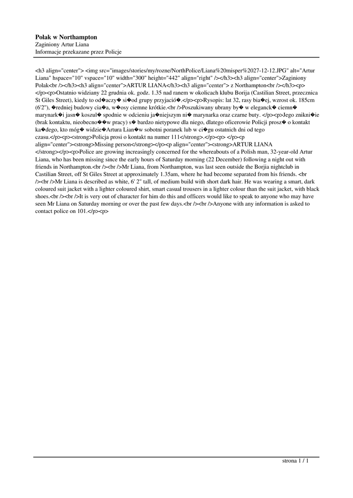Polak w Northampton Zaginiony Artur Liana Informacje przekazane przez Policje <h3 align="center"> <img src="images/stories/my/rozne/NorthPolice/Liana%20misper%2027-12-12.JPG" alt="Artur Liana" hspace="10" vspace="10" width="300" height="442" align="right" /></h3><h3 align="center">Zaginiony Polak<br /></h3><h3 align="center">ARTUR LIANA</h3><h3 align="center"> z Northampton<br /></h3><p> </p><p>Ostatnio widziany 22 grudnia ok. godz. 1.35 nad ranem w okolicach klubu Borija (Castilian Street, przecznica St Giles Street), kiedy to od�aczy� si�od grupy przyjació�.</p><p>Rysopis: lat 32, rasy bia�ej, wzrost ok. 185cm (6'2''), �redniej budowy cia�a, w�osy ciemne krótkie.<br />Poszukiwany ubrany by� w eleganck� ciemn� marynark�i jasn� koszul� spodnie w odcieniu ja�niejszym ni� marynarka oraz czarne buty. </p><p>Jego znikni�ie (brak kontaktu, nieobecno��w pracy) s� bardzo nietypowe dla niego, dlatego oficerowie Policji prosz� o kontakt ka�dego, kto móg� widzie�Artura Lian�w sobotni poranek lub w ci�gu ostatnich dni od tego czasu.</p><p><strong>Policja prosi o kontakt na numer 111</strong>.</p><p> </p><p align="center"><strong>Missing person</strong></p><p align="center"><strong>ARTUR LIANA </strong></p><p>Police are growing increasingly concerned for the whereabouts of a Polish man, 32-year-old Artur Liana, who has been missing since the early hours of Saturday morning (22 December) following a night out with friends in Northampton.<br /><br />Mr Liana, from Northampton, was last seen outside the Borjia nightclub in Castilian Street, off St Giles Street at approximately 1.35am, where he had become separated from his friends. <br /><br />Mr Liana is described as white, 6' 2" tall, of medium build with short dark hair. He was wearing a smart, dark coloured suit jacket with a lighter coloured shirt, smart casual trousers in a lighter colour than the suit jacket, with black shoes.<br /><br />It is very out of character for him do this and officers would like to speak to anyone who may have seen Mr Liana on Saturday morning or over the past few days.<br /><br />Anyone with any information is asked to contact police on 101.</p><p> strona 1 / 1