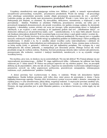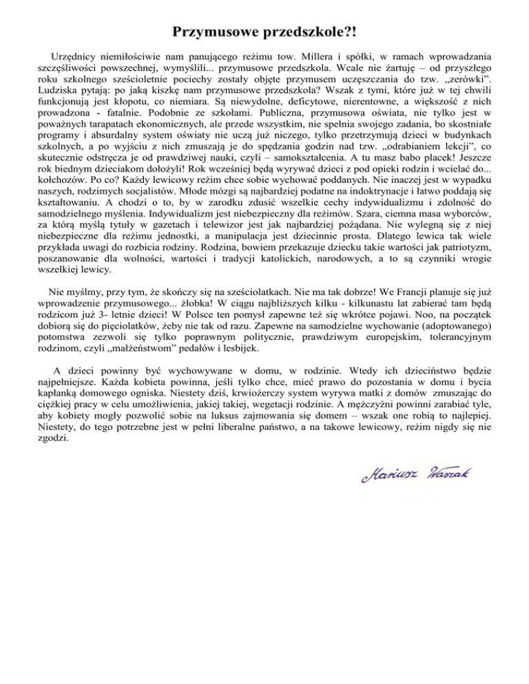 Przymusowe przedszkole?! Urzędnicy niemiłościwie nam panującego reżimu tow. Millera i spółki, w ramach wprowadzania szczęśliwości powszechnej, wymyślili... przymusowe przedszkola. Wcale nie żartuję – od przyszłego roku szkolnego sześcioletnie pociechy zostały objęte przymusem uczęszczania do tzw. „zerówki”. Ludziska pytają: po jaką kiszkę nam przymusowe przedszkola? Wszak z tymi, które już w tej chwili funkcjonują jest kłopotu, co niemiara. Są niewydolne, deficytowe, nierentowne, a większość z nich prowadzona - fatalnie. Podobnie ze szkołami. Publiczna, przymusowa oświata, nie tylko jest w poważnych tarapatach ekonomicznych, ale przede wszystkim, nie spełnia swojego zadania, bo skostniałe programy i absurdalny system oświaty nie uczą już niczego, tylko przetrzymują dzieci w budynkach szkolnych, a po wyjściu z nich zmuszają je do spędzania godzin nad tzw. „odrabianiem lekcji”, co skutecznie odstręcza je od prawdziwej nauki, czyli – samokształcenia. A tu masz babo placek! Jeszcze rok biednym dzieciakom dołożyli! Rok wcześniej będą wyrywać dzieci z pod opieki rodzin i wcielać do... kołchozów. Po co? Każdy lewicowy reżim chce sobie wychować poddanych. Nie inaczej jest w wypadku naszych, rodzimych socjalistów. Młode mózgi są najbardziej podatne na indoktrynacje i łatwo poddają się kształtowaniu. A chodzi o to, by w zarodku zdusić wszelkie cechy indywidualizmu i zdolność do samodzielnego myślenia. Indywidualizm jest niebezpieczny dla reżimów. Szara, ciemna masa wyborców, za którą myślą tytuły w gazetach i telewizor jest jak najbardziej pożądana. Nie wylegną się z niej niebezpieczne dla reżimu jednostki, a manipulacja jest dziecinnie prosta. Dlatego lewica tak wiele przykłada uwagi do rozbicia rodziny. Rodzina, bowiem przekazuje dziecku takie wartości jak patriotyzm, poszanowanie dla wolności, wartości i tradycji katolickich, narodowych, a to są czynniki wrogie wszelkiej lewicy. Nie myślmy, przy tym, że skończy się na sześciolatkach. Nie ma tak dobrze! We Francji planuje się już wprowadzenie przymusowego... żłobka! W ciągu najbliższych kilku - kilkunastu lat zabierać tam będą rodzicom już 3- letnie dzieci! W Polsce ten pomysł zapewne też się wkrótce pojawi. Noo, na początek dobiorą się do pięciolatków, żeby nie tak od razu. Zapewne na samodzielne wychowanie (adoptowanego) potomstwa zezwoli się tylko poprawnym politycznie, prawdziwym europejskim, tolerancyjnym rodzinom, czyli „małżeństwom” pedałów i lesbijek. A dzieci powinny być wychowywane w domu, w rodzinie. Wtedy ich dzieciństwo będzie najpełniejsze. Każda kobieta powinna, jeśli tylko chce, mieć prawo do pozostania w domu i bycia kapłanką domowego ogniska. Niestety dziś, krwiożerczy system wyrywa matki z domów zmuszając do ciężkiej pracy w celu umożliwienia, jakiej takiej, wegetacji rodzinie. A mężczyźni powinni zarabiać tyle, aby kobiety mogły pozwolić sobie na luksus zajmowania się domem – wszak one robią to najlepiej. Niestety, do tego potrzebne jest w pełni liberalne państwo, a na takowe lewicowy, reżim nigdy się nie zgodzi.