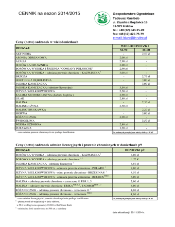 CENNIK na sezon 2014/2015 Gospodarstwo Ogrodnicze Tadeusz Kusibab ul. Zbyszka z Bogdańca 16 31-979 Kraków tel.: +48 (12) 643-15-20 fax: +48 (12) 425-75-79 e-mail: [email protected] Ceny (netto) sadzonek w wielodoniczkach RODZAJ: WIELODONICZKI M-90 M-60 AKTINIDIA ARONIA ODMIANOWA AZALIA BORÓWKA BRUSZNICA BORÓWKA WYSOKA I ŚREDNIA "ODMIANY PÓŁNOCNE" 2,00 zł 2,90 zł 2,00 zł 2,90 zł 2,50 zł - BORÓWKA WYSOKA - odmiana prawnie chroniona - KAZPLISZKA1 BRZOZA HORTENSJA DĘBOLISTNA JAGODA KAMCZACKA JAGODA KAMCZACKA (odmiany licencyjne) JEŻYNA WIELKOOWOCOWA KALMIA SZEROKOLISTNA (Kalmia latifolia ) LILAK MALINA MALINOJEŻYNA MALINOTRUSKAWKA MORWA RÓŻANECZNIK ŚWIDOŚLIWA WIŚNIA OZDOBNA ŻURAWINA 3,00 zł 3,50 zł 2,50 zł 2,90 zł 2,80 zł 2,50 zł 2,90 zł 2,80 zł 1,20 zł 2,70 zł 3,00 zł 3,00 zł 2,50 zł 2,20 zł 3,00 zł 3,50 zł - 1 - cena odmian prawnie chronionych nie podlega bonifikatom Do podanych powyżej cen należy doliczyć VAT Ceny (netto) sadzonek odmian licencyjnych i prawnie chronionych w doniczkach p9 DONICZKI p9 RODZAJ: BORÓWKA WYSOKA - odmiana prawnie chroniona - KAZPLISZKA1 BORÓWKA WYSOKA - odmiany prawnie chronione JAGODA KAMCZACKA - odmiany licencyjne 4,00 zł 1, 2 1,25 € 1 4,50 zł 1 JEŻYNA WIELKOOWOCOWA - odmiana prawnie chroniona - POLAR® 4,50 zł PBR 1 6,00 zł JEŻYNA WIELKOOWOCOWA - odm. prawnie chroniona - BRZEZINA® JEŻYNA WIELKOOWOCOWA - odmiana prawnie chroniona - REUBEN MALINA - odmiany prawnie chronione - oznaczone ® PBR 1, 3 PBR 1, 3 MALINA - odmiany prawnie chronione: ERIKA , TADMOR 1 RÓŻANECZNIK - odmiany prawnie chronione - oznaczone ® RÓŻANECZNIK - odmiany prawnie chronione - oznaczone PBR 1 1 2 - cena odmian licencyjnych i prawnie chronionych nie podlega bonifikatom 4,00 zł 1 3,00 zł PBR 1, 3 4,00 zł 4,00 zł 4,00 zł Do podanych powyżej cen należy doliczyć VAT - płatne przed lub najpóźniej w dniu odbioru, w PLN według kursu sprzedaży EURO w Raiffeisen Bank 3 - minimalna ilość zamówienia to 500 szt. z odmiany data aktualizacji: 25.11.2014 r. Prowadzimy sprzedaż wyłącznie hurtową: ♦ minimum 50 sztuk roślin w P9 z jednej odmiany; ♦ minimum 60 sztuk roślin w wielodoniczce (multiplacie M-60) z jednej odmiany; ♦ minimum 90 sztuk roślin w wielodoniczce (multiplacie M-90) z jednej odmiany. RABATY (bonifikaty) udzielane są klientom, którzy zakupili następujące ilości roślin: ♦ dla klientów kupujących sadzonki w naszej firmie kolejny sezon – 2% rabatu od ceny netto; ♦ przy zamówieniach powyżej 3 000 szt. jednorazowo – udzielamy 3% rabatu od wartości netto zamówienia; ♦ przy zamówieniach powyżej 5 000 szt. jednorazowo – udzielamy 5% rabatu od wartości netto zamówienia; ♦ przy zamówieniach powyżej 10 000 szt. jednorazowo – udzielamy 7% rabatu od wartości netto zamówienia; ♦ sprzedaż sadzonek odmian chronionych i licencyjnych nie podlega bonifikatom. TRANSPORT Jednorazowe dostawy powyżej 5 000 szt. dostarczamy bezpłatnie na terenie całego kraju. data aktualizacji: 25.11.2014 r.