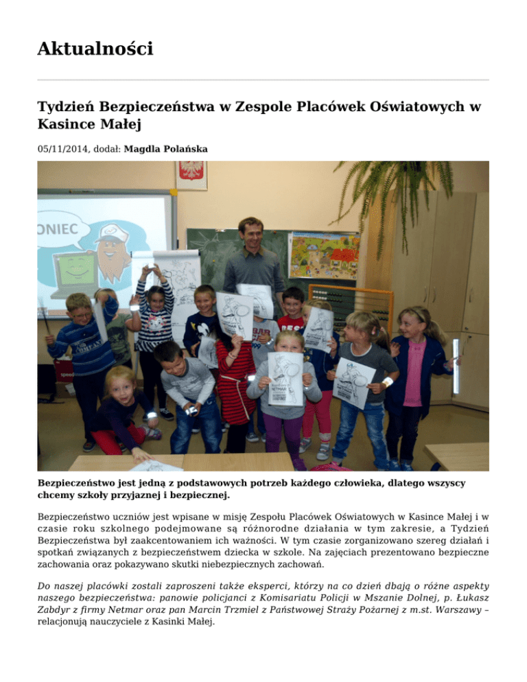 Aktualności Tydzień Bezpieczeństwa w Zespole Placówek Oświatowych w Kasince Małej 05/11/2014, dodał: Magdla Polańska Bezpieczeństwo jest jedną z podstawowych potrzeb każdego człowieka, dlatego wszyscy chcemy szkoły przyjaznej i bezpiecznej. Bezpieczeństwo uczniów jest wpisane w misję Zespołu Placówek Oświatowych w Kasince Małej i w czasie roku szkolnego podejmowane są różnorodne działania w tym zakresie, a Tydzień Bezpieczeństwa był zaakcentowaniem ich ważności. W tym czasie zorganizowano szereg działań i spotkań związanych z bezpieczeństwem dziecka w szkole. Na zajęciach prezentowano bezpieczne zachowania oraz pokazywano skutki niebezpiecznych zachowań. Do naszej placówki zostali zaproszeni także eksperci, którzy na co dzień dbają o różne aspekty naszego bezpieczeństwa: panowie policjanci z Komisariatu Policji w Mszanie Dolnej, p. Łukasz Zabdyr z firmy Netmar oraz pan Marcin Trzmiel z Państwowej Straży Pożarnej z m.st. Warszawy – relacjonują nauczyciele z Kasinki Małej. Celem spotkania z przedstawicielem firmy Netmar było wprowadzenie dzieci w świat bezpiecznego korzystania z Internetu. Prezentowano pozytywne aspekty korzystania z sieci, uświadamiano słuchaczy, jakie zagrożenia wiążą się z używaniem Internetu i wskazywano jak bezpiecznie z niego korzystać. Na koniec każde dziecko otrzymało dyplom za uczestnictwo w zajęciach oraz odblaskowe elementy, dzięki którym uczniowie będą mogli zadbać o swoje bezpieczeństwo na drodze. Kolejnym bardzo interesującym spotkaniem były zajęcia z panem Marcinem Trzmielem. Dzięki nim dzieci mogły dowiedzieć się na czym polega praca strażaka i jego psa podczas ratowania ludzi. Strażak-trener pokazał jakie są możliwości psów ratowników, jakie komendy są im wydawane, jak wygląda cały proces włączania psów do pracy w straży pożarnej lub policji. Uczniowie dowiedzieli się wielu informacji na temat zachowania się w wypadku ataku psa oraz zasad dotyczących karmienia i opieki nad zwierzęciem. Niewątpliwie ogromna atrakcją dla dzieci była możliwość pogłaskania psa. Zaproszeni do szkoły panowie policjanci przypomnieli wszystkim o zasadach ruchu drogowego, a w szczególności o bezpiecznej drodze do i ze szkoły oraz o zachowaniu w kontakcie z nieznajomymi. Mundurowi omówili podstawowe zasady związane z przechodzeniem przez jezdnię i bezpieczeństwem przy drodze. Stróże prawa uświadomili jak ważne jest to, aby zawsze być widocznym, zwłaszcza poruszając się po drodze oraz w jej pobliżu po zmroku. Policjanci zwrócili się również do uczniów z apelem, aby w trakcie jazdy samochodem dbali o swoje bezpieczeństwo. Podejmowanie działań profilaktycznych w zakresie poprawy stanu bezpieczeństwa dzieci i młodzieży na teranie szkoły i poza jej obrębem oraz zapobieganie zagrożeniom, na jakie narażony jest dorastający młody człowiek są niezwykle ważne –podkreśla dyrektor placówki Anna Piwowarska. S potkania te „wyposażyły” uczniów w wiedzę teoretyczną. Mamy nadzieję że znajdzie ona również zastosowanie w praktyce. red. Małgorzata Łabuz