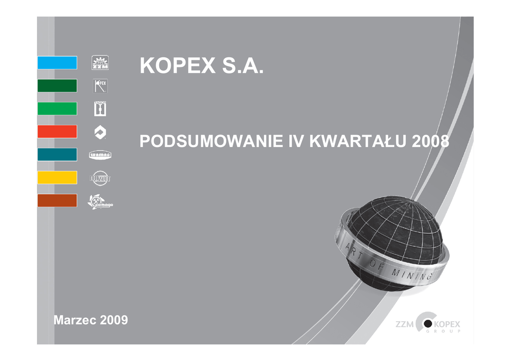 KOPEX S.A. PODSUMOWANIE IV KWARTAŁU 2008 Marzec 2009 Zastrzeżenia Niniejsze opracowanie zostało sporządzone wyłącznie w celach informacyjnych. Nie stanowi reklamy ani oferowania papierów wartościowych w publicznym obrocie. Zostały w nim wykorzystane źródła informacji, które Kopex S.A. uznaje za wiarygodne i dokładne, jednak nie ma gwarancji, że są one wyczerpujące i w pełni odzwierciedlają stan faktyczny. Opracowanie może zawierać stwierdzenia dotyczące przyszłości, które stanowią ryzyko inwestycyjne lub źródło niepewności i mogą istotnie różnić się od faktycznych rezultatów. Kopex S.A. nie ponosi odpowiedzialności za efekty decyzji, które zostały podjęte na podstawie niniejszego opracowania. Odpowiedzialność spoczywa wyłącznie na korzystającym z opracowania. Opracowanie podlega ochronie wynikającej z ustawy o prawie autorskim i prawach pokrewnych. Powielanie, publikowanie lub jego rozpowszechnianie wymaga pisemnej zgody Kopex S.A. 2 Agenda • podsumowanie wyników finansowych i inne informacje finansowe • podsumowanie działalności operacyjnej, sytuacja w branży na świecie i pozycja spółki 3 4 podsumowanie wyników finansowych i inne informacje finansowe Podsumowanie wyników 2008 4Q 4Q 2007 2007 zmiana zmiana 1-4Q 1-4Q 2008 2008 1-4Q 1-4Q 2007 2007 zmiana zmiana w w PLN PLN mln mln 4Q 4Q 2008 2008 przychody przychody 673,3 673,3 372,9 372,9 +80% +80% 11 970,6 970,6 11 290,2 290,2 +53% +53% EBITDA EBITDA 93,2 93,2 37,8 37,8 +147% +147% 235,4 235,4 148 148 +59% +59% EBIT EBIT 76,2 76,2 19,9 19,9 +283% +283% 173,7 173,7 105,7 105,7 +64% +64% zysk zysk netto netto po po udziałach udziałach mniejszości mniejszości 34,6 34,6 8,3 8,3 +317% +317% 92 92 500,1 500,1 // 85 85 +8% +8% • bardzo dobra dynamika wyników na poziomie EBITDA i EBIT • wzrost salda koszty vs /przychody finansowe + dywidendy/ ujemny wpływ na wyniki w kwocie 16 mln zł r/r • dodatnie przepływy z działalności operacyjnej: + 78 mln zł • wpływ wyceny otwartych instrumentów zabezpieczających na r-k wyników: -37,4 mln zł 5 Sytuacja walutowa rozliczenie rozliczenie zabezpieczających zabezpieczających instrumentów instrumentów finansowych finansowych na na 31.12.2009 31.12.2009 w w PLN PLN mln mln instrumenty instrumenty zabezpieczające zabezpieczające rozliczone rozliczone przez przez r-k r-k wyników wyników w w 2008 2008 (39,6)) (39,6)) instrumenty instrumenty zabezpieczające zabezpieczające –– wycena wycena przez przez kapitały kapitały na na 31.12.2008 31.12.2008 (54,8) (54,8) wartość wartość otwartych otwartych instrumentów instrumentów finansowych finansowych na na 31.12.2008 31.12.2008 429,6 429,6 wycena wycena instrumentów instrumentów zabezpieczających zabezpieczających na na 31.01.2009 31.01.2009 /kapitały/ /kapitały/ (93,6) (93,6) wartość wartość głównych głównych kontraktów kontraktów eksportowych eksportowych na na lata lata 2009-2010 2009-2010 ii należności należności walutowych walutowych 762,6 762,6 • hedging naturalny w ZZM • stosowanie instrumentów zabezpieczających w Kopex i Tagor oraz na niewielką skalę w Famago: 6 – stosowanie rachunkowości zabezpieczeń w Kopex /wycena przez kapitały efektywnej części zabezpieczeń przepływów pieniężnych/ – wycena bezpośrednio przez r-k wyników w Tagor i Famago Wyniki wg segmentów maszyny i urządzenia usługi górnicze elektronika pozostałe energia w w PLN PLN mln mln 2008 2008 2007 2007 2008 2008 2007 2007 2008 2008 2007 2007 2008 2008 2007 2007 2008 2008 2007 2007 przychody przychody 724,7 724,7 731 731 179,4 179,4 127,7 127,7 255,9 255,9 34,6 34,6 529,1 529,1 196,3 196,3 281,5 281,5 200,6 200,6 EBIT EBIT 108,5 108,5 87,4 87,4 (2,8) (2,8) 2,8 2,8 43,9 43,9 3,9 3,9 55 (9,5) (9,5) 19,1 19,1 21,1 21,1 struktura % sprzedaży wg segmentów 2008 9,1% struktura % EBIT wg segmentów 2008 61,4% 13,0% 24,9% 26,8% 2,8% 36,8% 10,8% 14,3% maszyny i urządzenia usługi górnicze elektronika energia pozostałe 7 maszyny i urządzenia elektronika energia pozostałe Rentowność EBIT EBITDA /%/ 23,70% 25,00% 19,50% 20,00% 16,10% 14,8% 14,50% 15,00% 10,70% 15,30% 9,70% 10,00% 5,00% • • 8 Tagor PBSz Grupa Grupa Kopex Kopex "core business" Joy Bucyrus Hansen Kopex Famago -1,50% Grupa ZZM PBSz -5,00% Hansen ZZM 0,00% Bucyrus rentowność głównych spółek z segmentu „maszyny” oraz „elektronika” na poziomie zbliżonym lub wyższym od liderów branży na świecie „zaniżona” marża EBIT w ZZM: zwyczajowa różnica EBITDA/EBIT w spółkach maszynowych to ok. 2%, w ZZM 12% ze względu na dzierżawę kombajnów jako główną formę sprzedaży w Polsce /EBITDA ZZM = 26,9%/ Rentowność EBITDA EBITDA /%/ 30,00% 26,9% 24,60% 25,00% 21,70% 20,00% 18,20% 16,80% 12,70% 15,00% 17,50% 11,90% 10,00% 5,80% 5,00% 9 PBSz Tagor PBSz Grupa Grupa Kopex Kopex "core business" Joy Bucyrus Hansen Kopex Famago Grupa ZZM Hansen ZZM 0,00% Bucyrus • rentowność głównych spółek z segmentu „maszyny” oraz „elektronika” na poziomie wyższym od liderów branży na świecie • dodatnia rentowność EBITDA wszystkich głównych spółek grupy Inwestycje PLN mln budowa zapasów stali ok. 233 mln 800 700 wzrost RMK – produkcja do Australii /MSR 11/ 600 500 433,0 400 142,7 300 200 100 0 212,5 101,2 capex • • 10 w tym nowe produkty ok. 32 mln 114 2007 • w tym przyrost o 20% mocy produkcyjnych w ZZM i Tagor 205 181,4 2008 2009P acquisitions opex capex odtworzeniowy w wysokości ok. 50 PLN mln rocznie; odpisy amortyzacyjne ok. 60 mln PLN rocznie „zero-jedynkowe” podejście do akwizycji w 2009 roku: 2 duże firmy w obszarze zainteresowań od II kwartału spadek kapitału obrotowego: spadek zapasów stali > przyrost należności Finansowanie stan stan na na 31.12.2008 31.12.2008 dług dług bankowy bankowy ii pochodne pochodne w w PLN PLN mln mln (489,6) (489,6) 172,2 172,2 gotówka gotówka ii ekwiwalenty ekwiwalenty dług dług netto netto (317,4) 