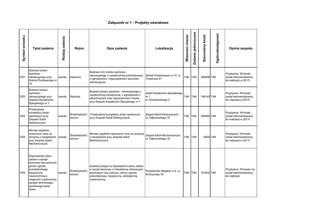 OŚ1 Budowa boiska sportowo rekreacyjnego przy twarde Szkole Podstawowej nr 10. Zawarcie Budowa mini boiska sportowo rekreacyjnego z nawierzchnią poliuretanową, Szkoła Podstawowa nr 10, ul. z ogrodzeniem i wyposażeniem sportowo Towarowa 21 rekreacyjnym. OŚ2 Budowa boiska sportowo rekreacyjnego przy Zespole Kształcenia Specjalnego nr 1. twarde Staszica Budowa boiska sportowo - rekreacyjnego z nawierzchnią syntetyczną, z ogrodzeniem i piłkochwytami oraz wyposażeniem boiska, przy Zespole Kształcenia Specjalnego nr 1. OŚ3 Przebudowa kompleksu boisk sportowych przy Zespole Szkół Elektrycznych. twarde Śródmieście/C Przebudowa kompleksu boisk sportowych entrum przy Zespole Szkół Elektrycznych. OŚ4 Montaż stojaków rowerowch wraz ze skrzynią z narzędziami twarde przy Zespole Szkół Mechanicznych. OŚ5 Doposażenie placu zabaw w sprzęt terenowy oraz pokrycie gruntu ogrodu przedszkolnego bezpieczną twarde nawierzchnią w miejscach użytkowania sprzętu terenowego i sportowego przez dzieci. Ogólnodostępność Lokalizacja Szacowany koszt Opis zadania Zadanie jednoroczne Rejon Własność miasta Tytuł zadania Rodzaj zadania Symbol wniosku Załącznik nr 1 - Projekty oświatowe Opinia zespołu TAK TAK 350000 TAK Pozytywna. Wniosek został rekomendowany do realizacji w 2017r. Zspół Kształcenia Specjalnego nr 1 TAK TAK ul. Dunikowskiego 5 146149 TAK Pozytywna. Wniosek został rekomendowany do realizacji w 2017r. Zespół Szkół Elektrycznych, ul. Dąbrowskiego 33 TAK TAK 300000 TAK Pozytywna. Wniosek został rekomendowany do realizacji w 2017r. Montaż stojaków rowerowch wraz ze skrzynią Śródmieście/C Zespół Szkół Mechanicznych, z narzędziami przy Zespole Szkół entrum ul. Dąbrowskiego 32. Mechanicznych. TAK TAK 6000 TAK Pozytywna. Wniosek został rekomendowany do realizacji w 2017r. Zadanie polega na doposażeniu placu zabaw w sprzęt terenowy o charakterze rekreacyjno Śródmieście/C Przedszkole Miejskie nr 6, ul. sportowym oraz pokryciu terenu ogrodu entrum M.Drzymały 18 poliuretanową, bezpieczną, ekologiczną nawierzchnią. TAK TAK 101832 TAK Pozytywna. Wniosek nie został rekomendowany do realizacji. OŚ6 Budowa bieżni, skoczni w dal i siłowni zewnętrznej przy twarde Szkole Podstawowej nr 5. Staszica OŚ7 Budowa wielofunkcyjnego twarde boiska przy Gimnazjum nr 7. Budowa boiska wielofunkcyjnego do koszykówki, piki ręcznej i piłki nożnej o nawierzchni syntetycznej poliuretanowej wraz Śródmieście/C Gimnazjum nr 7, z oświetleniem. Budowa chodnika z kostki entrum ul. E.Estkowskiego 3 betonowej wraz z ogrodzeniem oraz wjazdem technicznym i furtkami. Przebudowa istniejących schodów. OŚ8 Budowa zatoki parkingowej dla pojazdów dowożących uczniów twarde niepełnosprawnych do Zespołu Szkół Ogólnokształcących nr 16. TAK TAK 185000 TAK Pozytywna. Wniosek nie został rekomendowany do realizacji. TAK TAK 475000 TAK Pozytywna. Wniosek nie został rekomendowany do realizacji. Staszica Wybudowanie zatoki parkingowej dla pojazdów dowożących uczniów niepełnosprawnych do budynku szkoły, Zespół Szkół polegające na usunięciu ziemi na długości Ogólnokształąych nr 16, zatoki, ułożeniu krawężników, wykonaniu ul. Dunikowskiego 5 podłoża pod warstwę nawierzchni asfaltowej, ułożeniu nawierzchni asfaltowej, oznakowaniu zatoki. TAK TAK 80000 TAK Pozytywna. Wniosek nie został rekomendowany do realizacji. Zawarcie Projekt zakłada stworzenie parku street workout, wyposażonego w drążki rozmieszczone na różnych wysokościach, Zespół Szkół nr 12, poręcze, drabinki itp. oraz zamontowanie ul. Śląska 20. dwóch zewnętrznych stołów do tenisa stołowego i jednego stołu do gry w piłkarzyki. TAK TAK 241412 TAK Pozytywna. Wniosek nie został rekomendowany do realizacji. Zadanie polega na zorganizowaniu dla dzieci z przedszkoli i oddziałów zerowych Szkół Podstawowych oraz nieuczęszczających do przedszkola, zawodów lekkoatletycznych w Zorganizowanie III kategorii wiekowej 5-6 lat. Impreza Zawodów Stadion Lekkoatletyczny OSIR Śródmieście/C ogólnodostępna dla wszystkich mieszkańców OŚ10 Lekkoatletycznych o miękkie przy ulicy Wyszyńskiego w TAK TAK entrum Gorzowa Wlkp. w celu propagowania puchar Prezydenta Gorzowie Wlkp. aktywności ruchowej w społeczeństwie. Miasta Gorzowa Wlkp. Impreza składa się z czterech konkurencji, na początku bieg rekreacyjny dla wszystkich rozgrzewka, bieg na 40 m, skok w dal, rzut oszczepem dziecięcym, sztafeta 10x40. 9000 TAK Pozytywna. Wniosek nie został rekomendowany do realizacji. 70000 TAK Pozytywna. Wniosek nie został rekomendowany do realizacji. OŚ9 Street Workout Park twarde Budowa parkingu i chodnika przy Miejskim OŚ11 twarde Przedszkolu Integracyjnym nr 14. Staszica Budowa bieżni, skoczni w dal i siłowni zewnętrznej przy Szkole Podstawowej nr 5. Budowa parkingu i chodnika przy Miejskim Przedszkolu Integracyjnym nr 14. Szkoła Podstawowa nr 5, Al. Konstytucji 30 - go Maja 44 Miejskie Przedskole Integracyjne nr 14, ul. Kasprowicza 10 TAK TAK Budowa wielofunkcyjnego boiska dla dzieci, młodzieży oraz OŚ12 twarde społeczności lokalnej dzielnicy Zawarcie przy Miejskim Przedszkolu Integracyjnym nr 27. Zawarcie Zadanie obejmuje budowę boiska wielofunkcyjnego o nawierzchni poliuretanowej z ogrodzeniem i wyposażeniem boiska. Realizacja zadania Miejskie Przedszkole tworzy zaplecze do prowadzenia regularnych Integracyjne nr 27, zajęć sportowych skierowanych do dzieci, ul. Śląska 42 młodzieży i dorosłych oraz warunki do organizowania imprez sportowych i rekreacyjnych w dzielnicy Zawarcie. TAK TAK 266975 TAK Pozytywna. Wniosek nie został rekomendowany do realizacji. Budowa zatoki parkingowej przy OŚ13 Przedszkolu Miejskim nr 29. Górczyn Budowa zatoki parkingowej przy Przedszkolu Przedszkole Miejskie nr 29, ul. TAK TAK Miejskim nr 29. Wróblewskiego 48 100000 TAK Pozytywna. Wniosek nie został rekomendowany do realizacji. Staszica Budowa placu zabaw przy Przedsz
