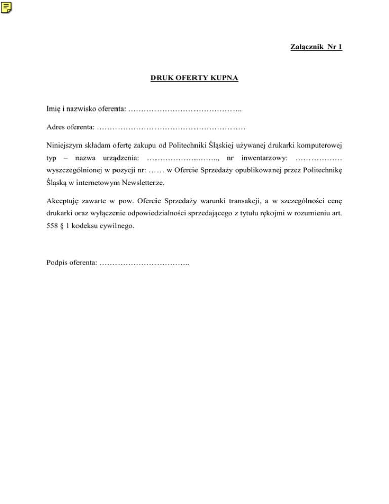 Załącznik Nr 1 DRUK OFERTY KUPNA Imię i nazwisko oferenta: …………………………………….. Adres oferenta: ………………………………………………… Niniejszym składam ofertę zakupu od Politechniki Śląskiej używanej drukarki komputerowej typ – nazwa urządzenia: ………………..…….., nr inwentarzowy: ……………… wyszczególnionej w pozycji nr: …… w Ofercie Sprzedaży opublikowanej przez Politechnikę Śląską w internetowym Newsletterze. Akceptuję zawarte w pow. Ofercie Sprzedaży warunki transakcji, a w szczególności cenę drukarki oraz wyłączenie odpowiedzialności sprzedającego z tytułu rękojmi w rozumieniu art. 558 § 1 kodeksu cywilnego. Podpis oferenta: ……………………………..