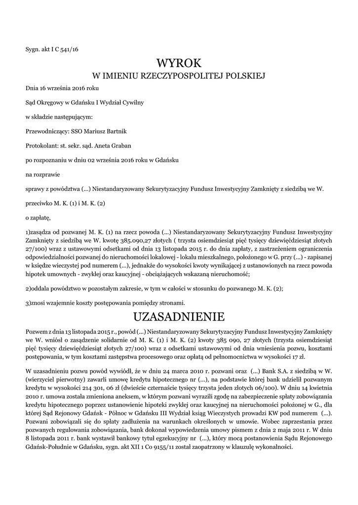 Sygn. akt I C 541/16 WYROK W IMIENIU RZECZYPOSPOLITEJ POLSKIEJ Dnia 16 września 2016 roku Sąd Okręgowy w Gdańsku I Wydział Cywilny w składzie następującym: Przewodniczący: SSO Mariusz Bartnik Protokolant: st. sekr. sąd. Aneta Graban po rozpoznaniu w dniu 02 września 2016 roku w Gdańsku na rozprawie sprawy z powództwa (...) Niestandaryzowany Sekurytyzacyjny Fundusz Inwestycyjny Zamknięty z siedzibą we W. przeciwko M. K. (1) i M. K. (2) o zapłatę, 1)zasądza od pozwanej M. K. (1) na rzecz powoda (...) Niestandaryzowany Sekurytyzacyjny Fundusz Inwestycyjny Zamknięty z siedzibą we W. kwotę 385.090,27 złotych ( trzysta osiemdziesiąt pięć tysięcy dziewięćdziesiąt złotych 27/100) wraz z ustawowymi odsetkami od dnia 13 listopada 2015 r. do dnia zapłaty, z zastrzeżeniem ograniczenia odpowiedzialności pozwanej do nieruchomości lokalowej - lokalu mieszkalnego, położonego w G. przy (...) - zapisanej w księdze wieczystej pod numerem (...), jednakże do wysokości kwoty wynikającej z ustanowionych na rzecz powoda hipotek umownych - zwykłej oraz kaucyjnej - obciążających wskazaną nieruchomość; 2)oddala powództwo w pozostałym zakresie, w tym w całości w stosunku do pozwanego M. K. (2); 3)znosi wzajemnie koszty postępowania pomiędzy stronami. UZASADNIENIE Pozwem z dnia 13 listopada 2015 r., powód (...) Niestandaryzowany Sekurytyzacyjny Fundusz Inwestycyjny Zamknięty we W. wniósł o zasądzenie solidarnie od M. K. (1) i M. K. (2) kwoty 385 090, 27 złotych (trzysta osiemdziesiąt pięć tysięcy dziewięćdziesiąt złotych 27/100) wraz z odsetkami ustawowymi od dnia wniesienia pozwu, kosztami postępowania, w tym kosztami zastępstwa procesowego oraz opłatą od pełnomocnictwa w wysokości 17 zł. W uzasadnieniu pozwu powód wywiódł, że w dniu 24 marca 2010 r. pozwani oraz (...) Bank S.A. z siedzibą w W. (wierzyciel pierwotny) zawarli umowę kredytu hipotecznego nr (...), na podstawie której bank udzielił pozwanym kredytu w wysokości 214 301, 06 zł (dwieście czternaście tysięcy trzysta jeden złotych 06/100). W dniu 14 kwietnia 2010 r. umowa została zmieniona aneksem, w którym pozwani wyrazili zgodę na zabezpieczenie spłaty zobowiązania kredytu hipotecznego poprzez ustanowienie hipoteki zwykłej oraz kaucyjnej na nieruchomości położonej w G., dla której Sąd Rejonowy Gdańsk - Północ w Gdańsku III Wydział ksiąg Wieczystych prowadzi KW pod numerem (...). Pozwani zobowiązali się do spłaty zadłużenia na warunkach określonych w umowie. Wobec zaprzestania przez pozwanych regulowania zobowiązania, bank dokonał wypowiedzenia umowy pismem z dnia 2 maja 2011 r. W dniu 8 listopada 2011 r. bank wystawił bankowy tytuł egzekucyjny nr (...), który mocą postanowienia Sądu Rejonowego Gdańsk-Południe w Gdańsku, sygn. akt XII 1 Co 9155/11 został zaopatrzony w klauzulę wykonalności. Następnie w dniu 31 marca 2014 r. wierzyciel pierwotny (...) Bank S.A. z siedzibą w W. zawarł z powodem (...) Niestandaryzowany Sekurytyzacyjny Fundusz Inwestycyjny Zamknięty we W. umowę sprzedaży wierzytelności cedując na jego rzecz całość praw i obowiązków wynikających z umowy zawartej z pozwanymi wraz z ustanowionymi zabezpieczeniami. Dalej powód wskazał, wyjaśniając ewentualne wątpliwości w zakresie oznaczenia wierzyciela pierwotnego, że w wyniku połączenia spółek (...) Bank S.A. z siedzibą w W. z (...) Bank S.A. z siedzibą w W. wierzyciel pierwotny występuje od dnia 1 czerwca 2012 r. pod nazwą (...) Bank S.A. z siedzibą w W. (KRS (...)). Na wniosek strony powodowej w księdze wieczystej nr (...), dokonano wpisu wierzyciela hipotecznego, co skutkowało w myśl przepisu art. 79 ust 1 ustawy o księgach wieczystych i hipotece, przeniesieniem wierzytelności hipotecznej wraz z zabezpieczeniem. Dalej powód wywiódł, że pismem z dnia 26 czerwca 2015r. wezwał pozwanych do dobrowolnego spełnienia świadczenia, jednakowoż pozostało ono bezskuteczne. Powód wskazał, iż na dochodzoną pozwem należność w kwocie 385 090, 27 zł składają się kwoty: - 213 493, 04 zł tytułem należności głównej, tj. tytułem pozostałego do spłaty kapitału kredytu; - 171 597, 23 zł - tytułem kapitalizowanych odsetek, w tym kwota 122 177, 28 zł tytułem odsetek karnych naliczonych przez poprzedniego wierzyciela do dnia poprzedzającego dzień zawarcia umowy sprzedaży wierzytelności, kwota 35 077, 20 zł tytułem odsetek ustawowych naliczonych od kwoty należności głównej przez stronę powodową po dniu sprzedaży wierzytelności do dnia złożenia pozwu oraz 14 342, 75 zł tytułem odsetek umownych naliczonych przez wierzyciela pierwotnego do dnia zawarcia umowy sprzedaży. Ponadto powód oświadczył, iż dochodzi również pozwem skapitalizowanej kwoty należności wskazanej powyżej i w związku z tym wniósł o zasądzenie odsetek ustawowych od dnia wytoczenia powództwa do dnia zapłaty. Do pozwu powód celem potwierdzenia okoliczności wskazanych w uzasadnieniu tegoż pisma załączono poza pełnomocnictwem procesowym oraz dowodami uiszczenia opłat, wyciąg z RFI (...) Niestandaryzowany Sekurytyzacyjny Fundusz Inwestycyjny Zamknięty we W., odpis KRS (...) S.A., umowę kredytu hipotecznego nr (...) wraz z aneksem do tejże umowy, odpis zwykły KW nr (...), wypowiedzenie umowy pozwanym z dnia 2 maja 2011 r., bankowy tytuł egzekucyjny nr (...), który mocą postanowienia Sądu Rejonowego Gdańsk-Południe w Gdańsku, sygn. akt XII 1 Co 9155/11 został zaopatrzony w klauzulę wykonalności, umowę sprzedaży wierzytelności nr (...) zawartą pomiędzy wierzycielem pierwotnym, a powodem, odpis pełny KRS (...) Bank S.A. z siedzibą w W., potwierdzenie zapłaty ceny tytułem sprzedaży wierzytelności oraz wezwania do zapłaty z dnia 26 czerwca 2015 r. wystosowane do pozwanych. W związku z powyższym Sąd Okręgowy we Wrocławiu w dniu 25 listopada 2015 r. wydał nakaz zapłaty w postępowaniu upominawczym zgodny 