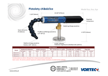 Pistolety chłodzące Model 610, 620, 630 10-5/8’’(270mm) 1-3/4’’(44mm) Regulacja temperatury Wyjście gorącego powietrza Dysza elastyczna 8’’(203mm) Przyłącze sprężonego powietrza 1/4’’ NPT (F) Wyjście zimnego powietrza średnica 3/8’’ (10mm) 4-7/8’’(124mm) 3-3/16’’ (81mm) Podstawa magnetyczna (dostępna dla systemu) SPECYFIKACJA Model 610(system) 620(system) 630(system) Wydajność chłodzenia BTU/godz. 900 1500 2500 Waty 264 440 733 Zużycie powietrza SCFM 15 25 35 3 m /godz 25.5 42.4 59.4 Min. temperatura na wyjściu Deg F -10 10 30 o C -23 -12 -1 Parametry podane przy ciśnieniu 100 psig (6.9 bar) i temperaturze powietrza wejściowego 20oC. System zawiera : filtr powietrza, podstawę magnetyczną. (urządzenia dostępne również jako sam pistolet bez filtra i podstawy). www.vortec.pl Przepływ pow. na wyjściu SCFM 2 - 15 8 - 25 18 - 35 3 m /godz 3.4 - 25.5 13.6 - 42.5 30.6 - 59.5 Waga (kg) system 1.4 1.4 1.4 pistolet 0.5 0.5 0.5