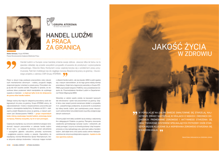 HANDEL LUDŹMI A PRACA ZA GRANICĄ JAKOŚĆ ŻYCIA W ZDROWIU Stefan Schwarz, Grupa ATERIMA, Prezes Stowarzyszenia Inicjatywa Mobilności Pracy Handel ludźmi w Europie coraz bardziej zmienia swoje oblicze. Jeszcze kilka lat temu na to zjawisko składały się przede wszystkim przypadki zmuszania do prostytucji i wykorzystania seksualnego. Obecnie Stary Kontynent coraz częściej boryka się z problemem pracy przymusowej. Fakt ten mobilizuje nas do ciągłego rozwoju Bezpiecznej pracy za granicą – kluczowego projektu z zakresu CSR Grupy ATERIMA. Pobyt w obcym kraju pozbawia pracowników wielu natural- z ofiarami handlu ludźmi. Jak się okazało, MSW w pełni zgadza nych mechanizmów obronnych – rodziny, przyjaciół, biegłej się z naszym stanowiskiem, że do tego grona należą również znajomości języka i orientacji w prawie pracy. Priorytetem sta- pracodawcy. Dzięki temu tegoroczne warsztaty w Grupie ATE- ją się dla nich wysokie zarobki. Wszystko to sprawia, że sto- RIMA poprowadzili eksperci PoMOCy oraz przedstawiciel Ze- sunkowo łatwo przekonać takich kandydatów do szybkiego społu ds. Przeciwdziałania Handlowi Ludźmi w Departamen- wyjazdu w nieznane – a stąd już tylko krok do dołączenia cie Polityki Migracyjnej MSW. do grona ofiar handlu ludźmi. Warsztaty w całości oparte zostały na kazusach typowych Dlatego ważną rolę mają do odegrania pracodawcy osób de- dla rekrutowania i opieki nad pracownikami za granicą. Dzię- legowanych do pracy za granicą. Grupa ATERIMA wierzy, że ki temu nasz zespół poznał scenariusze działań w przypadku odpowiedzialność i troska o bezpieczeństwo pracownika jest m.in. uzasadnionego podejrzenia, że pracownik w przeszłości jednym z obowiązków każdej firmy. W efekcie od 2011 r. reali- był ofiarą handlu ludźmi, jest szantażowany przez nieuczci- zujemy projekt Bezpieczna praca za granicą, a naszym part- wych werbowników lub podejmowane są próby przejęcia jego nerem jest Stowarzyszenie PoMOC – grupa wspaniałych danych osobowych. SZYBSZE ZMIANY NASTĘPUJĄ W KRAJACH O NISKICH I ŚREDNICH DO- ludzi, którzy zwalczając handel ludźmi, zmieniają świat na lepszy. Robimy wszystko, by im w tym pomagać. W POPULACJE NA CAŁYM ŚWIECIE GWAŁTOWNIE SIĘ STARZEJĄ, NAJ- Chcemy pójść krok dalej i podzielić się tą wiedzą z całą branżą firm delegujących Polaków za granicę. Planujemy stworzenie CHODACH. PROMOWANIE ZDROWEGO I AKTYWNEGO STARZENIA SIĘ Częścią tej współpracy są coroczne szkolenia budujące świa- casebooka gromadzącego sytuacje ryzyka i wskazówki, jak ORAZ TWORZENIE SYSTEMÓW SPEŁNIAJĄCYCH POTRZEBY OSÓB STAR- domość naszych pracowników w zakresie handlu ludźmi. wtedy pomagać. Liczymy na otwartą postawę i chęć koopera- SZYCH BĘDZIE KLUCZOWE DLA WSPIERANIA ZDROWEGO STARZENIA SIĘ W tym roku – ze względu na skokowy wzrost zatrudnienia cji branży w imię nadrzędnego celu, jakim jest walka z handlem – szczególnie głęboko odczuliśmy potrzebę wyrównania ludźmi. Jeśli dzięki temu choć jedna osoba uniknie niebezpie- W KAŻDYM KRAJU. i pogłębienia poziomu wiedzy w zespole. Zaprosiliśmy do czeństwa lub otrzyma profesjonalne wsparcie – będzie to dla współpracy również Ministerstwo Spraw Wewnętrznych, któ- nas ogromny sukces. re aktywnie edukuje środowiska i instytucje mające kontakt 046 GLOBAL COMPACT PRAWA CZŁOWIEKA ŚWIATOWA ORGANIZACJA ZDROWIA (WHO)
