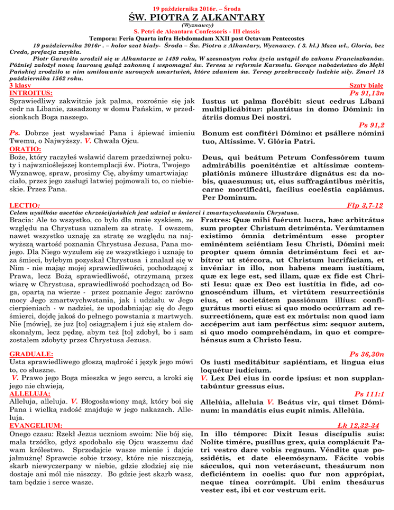 19 października 2016r. – Środa ŚW. PIOTRA Z ALKANTARY (Wyznawcy) S. Petri de Alcantara Confessoris - III classis Tempora: Feria Quarta infra Hebdomadam XXII post Octavam Pentecostes 19 pażdziernika 2016r . – kolor szat biały- Środa – Św. Piotra z Alkantary, Wyznawcy. ( 3. kl.) Msza wł., Gloria, bez Credo, prefacja zwykła. Piotr Garavito urodził się w Alkantarze w 1499 roku, W szesnastym roku życia wstąpił do zakonu Franciszkanów. Później założył nową laurową gałąź zakonną i wspomaga! św. Teresa w reformie Karmelu. Gorące nabożeństwo do Męki Pańskiej zrodziło w nim umiłowanie surowych umartwień, które zdaniem św. Teresy przekraczały ludzkie siły. Zmarł 18 października 1562 roku. 3 klasy Szaty białe INTROITUS: Ps 91,13n Sprawiedliwy zakwitnie jak palma, rozrośnie się jak Iustus ut palma florébit: sicut cedrus Líbani cedr na Libanie, zasadzony w domu Pańskim, w przed- multiplicábitur: plantátus in domo Dómini: in sionkach Boga naszego. átriis domus Dei nostri. Ps 91,2 Ps. Dobrze jest wysławiać Pana i śpiewać imieniu Bonum est confitéri Dómino: et psállere nómini Twemu, o Najwyższy. V. Chwała Ojcu. tuo, Altíssime. V. Glória Patri. ORATIO: Boże, który raczyłeś wsławić darem przedziwnej poku- Deus, qui beátum Petrum Confessórem tuum ty i najwznioślejszej kontemplacji św. Piotra, Twojego admirábilis poeniténtiæ et altíssimæ contemWyznawcę, spraw, prosimy Cię, abyśmy umartwiając platiónis múnere illustráre dignátus es: da nociało, przez jego zasługi łatwiej pojmowali to, co niebie- bis, quaesumus; ut, eius suffragántibus méritis, skie. Przez Pana. carne mortificáti, facílius coeléstia capiámus. Per Dominum. LECTIO: Flp 3,7-12 Celem wysiłków ascetów chrześcijańskich jest udział w śmierci i zmartwychwstaniu Chrystusa. Bracia: Ale to wszystko, co było dla mnie zyskiem, ze względu na Chrystusa uznałem za stratę. I owszem, nawet wszystko uznaję za stratę ze względu na najwyższą wartość poznania Chrystusa Jezusa, Pana mojego. Dla Niego wyzułem się ze wszystkiego i uznaję to za śmieci, bylebym pozyskał Chrystusa i znalazł się w Nim - nie mając mojej sprawiedliwości, pochodzącej z Prawa, lecz Bożą sprawiedliwość, otrzymaną przez wiarę w Chrystusa, sprawiedliwość pochodzącą od Boga, opartą na wierze - przez poznanie Jego: zarówno mocy Jego zmartwychwstania, jak i udziału w Jego cierpieniach - w nadziei, że upodabniając się do Jego śmierci, dojdę jakoś do pełnego powstania z martwych. Nie [mówię], że już [to] osiągnąłem i już się stałem doskonałym, lecz pędzę, abym też [to] zdobył, bo i sam zostałem zdobyty przez Chrystusa Jezusa. Fratres: Quæ mihi fuérunt lucra, hæc arbitrátus sum propter Christum detriménta. Verúmtamen existimo ómnia detriméntum esse propter eminéntem sciéntiam Iesu Christi, Dómini mei: propter quem ómnia detriméntum feci et arbítror ut stércora, ut Christum lucrifáciam, et invéniar in illo, non habens meam iustítiam, quæ ex lege est, sed illam, quæ ex fide est Christi Iesu: quæ ex Deo est iustítia in fide, ad cognoscéndum illum, et virtútem resurrectiónis eius, et societátem passiónum illíus: configurátus morti eius: si quo modo occúrram ad resurrectiónem, quæ est ex mórtuis: non quod iam accéperim aut iam perféctus sim: sequor autem, si quo modo comprehéndam, in quo et comprehénsus sum a Christo Iesu. GRADUALE: Usta sprawiedliwego głoszą mądrość i język jego mówi to, co słuszne. V. Prawo jego Boga mieszka w jego sercu, a kroki się jego nie chwieją. ALLELUJA: Alleluja, alleluja. V. Błogosławiony mąż, który boi się Pana i wielką radość znajduje w jego nakazach. Alleluja. EVANGELIUM: Onego czasu: Rzekł Jezus uczniom swoim: Nie bój się, mała trzódko, gdyż spodobało się Ojcu waszemu dać wam królestwo. Sprzedajcie wasze mienie i dajcie jałmużnę! Sprawcie sobie trzosy, które nie niszczeją, skarb niewyczerpany w niebie, gdzie złodziej się nie dostaje ani mól nie niszczy. Bo gdzie jest skarb wasz, tam będzie i serce wasze. Ps 36,30n Os iusti meditábitur sapiéntiam, et lingua eius loquétur iudícium. V. Lex Dei eius in corde ipsíus: et non supplantabúntur gressus eius. Ps 111:1 Allelúia, alleluia V. Beátus vir, qui timet Dóminum: in mandátis eius cupit nimis. Allelúia. Łk 12,32-34 In illo témpore: Dixit Iesus discípulis suis: Nolíte timére, pusíllus grex, quia complácuit Patri vestro dare vobis regnum. Véndite quæ possidétis, et date eleemósynam. Fácite vobis sácculos, qui non veteráscunt, thesáurum non deficiéntem in coelis: quo fur non apprópiat, neque tínea corrúmpit. Ubi enim thesáurus vester est, ibi et cor vestrum erit. OFFERTORIUM: Ps 20,2n Z potęgi Twej, Panie, weseli się sprawiedliwy, i z po- In virtúte tua, Dómine, lætábitur iustus, et sumocy Twojej bardzo się cieszy: spełniłeś pragnienie je- per salutáre tuum exsultábit veheménter: dego serca. sidérium ánimæ eius tribuísti ei. SECRETA: Prosimy Cię, wszechmogący Boże, spraw, aby nasza ofiara, którą w pokorze składamy Ci ku czci Twoich Świętych, była Tobie miła i oczyściła nasze dusze i ciała. Przez Pana. Præsta nobis, quaesumus, omnípotens Deus: ut nostræ humilitátis oblátio et pro tuórum tibi grata sit honóre Sanctórum, et nos córpore páriter et mente puríficet. Per Dominum. PRAEFATIO COMMUNIS: Zaprawdę godne to i sprawiedliwe, słuszne i zbawienne, abyśmy zawsze i wszędzie Tobie składali dziękczynienie, Panie, Ojcze Święty, wszechmogący, wieczny Boże, przez Chrystusa, Pana naszego. Przez Niego Twój majestat chwalą Aniołowie, uwielbiają Państwa, z lękiem czczą Potęgi, Niebiosa i Moce niebios oraz błogosławieni Serafini we wspólnej wysławiają radości. Z nimi to, prosimy, dozwól i naszym głosom wołać w pokornym uwielbieniu: Vere dignum et iustum est, æquum et salutáre, nos tibi semper et ubíque gráti