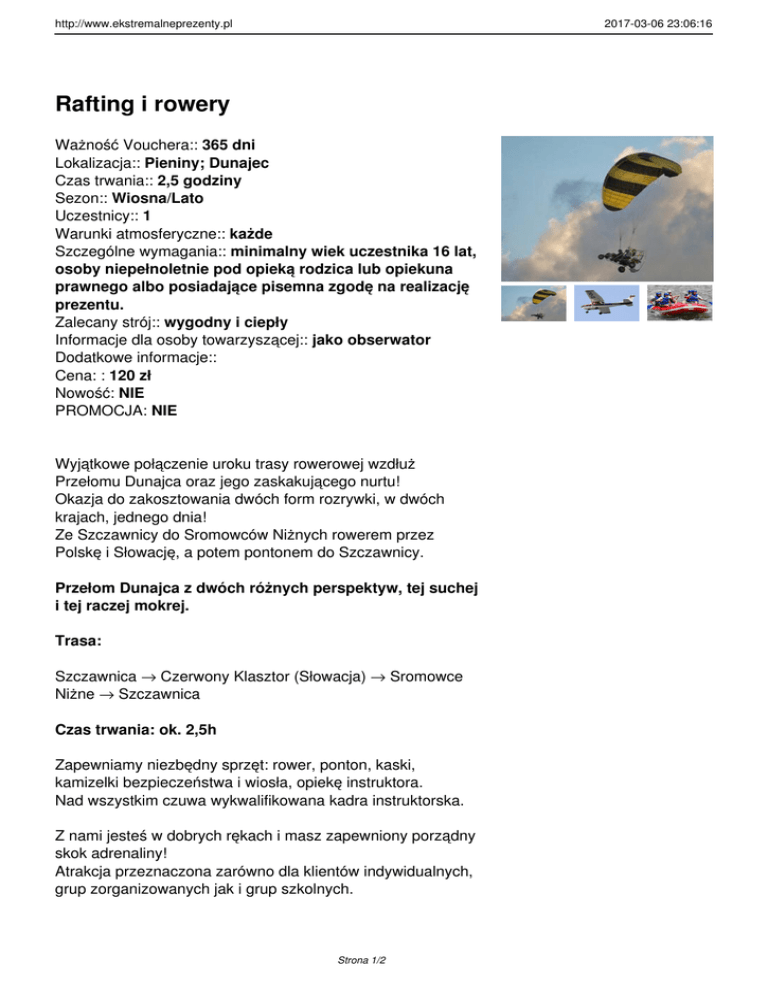http://www.ekstremalneprezenty.pl 2017-03-06 23:06:16 Rafting i rowery Ważność Vouchera:: 365 dni Lokalizacja:: Pieniny; Dunajec Czas trwania:: 2,5 godziny Sezon:: Wiosna/Lato Uczestnicy:: 1 Warunki atmosferyczne:: każde Szczególne wymagania:: minimalny wiek uczestnika 16 lat, osoby niepełnoletnie pod opieką rodzica lub opiekuna prawnego albo posiadające pisemna zgodę na realizację prezentu. Zalecany strój:: wygodny i ciepły Informacje dla osoby towarzyszącej:: jako obserwator Dodatkowe informacje:: Cena: : 120 zł Nowość: NIE PROMOCJA: NIE Wyjątkowe połączenie uroku trasy rowerowej wzdłuż Przełomu Dunajca oraz jego zaskakującego nurtu! Okazja do zakosztowania dwóch form rozrywki, w dwóch krajach, jednego dnia! Ze Szczawnicy do Sromowców Niżnych rowerem przez Polskę i Słowację, a potem pontonem do Szczawnicy. Przełom Dunajca z dwóch różnych perspektyw, tej suchej i tej raczej mokrej. Trasa: Szczawnica → Czerwony Klasztor (Słowacja) → Sromowce Niżne → Szczawnica Czas trwania: ok. 2,5h Zapewniamy niezbędny sprzęt: rower, ponton, kaski, kamizelki bezpieczeństwa i wiosła, opiekę instruktora. Nad wszystkim czuwa wykwalifikowana kadra instruktorska. Z nami jesteś w dobrych rękach i masz zapewniony porządny skok adrenaliny! Atrakcja przeznaczona zarówno dla klientów indywidualnych, grup zorganizowanych jak i grup szkolnych. Strona 1/2 http://www.ekstremalneprezenty.pl 2017-03-06 23:06:16 Strona 2/2