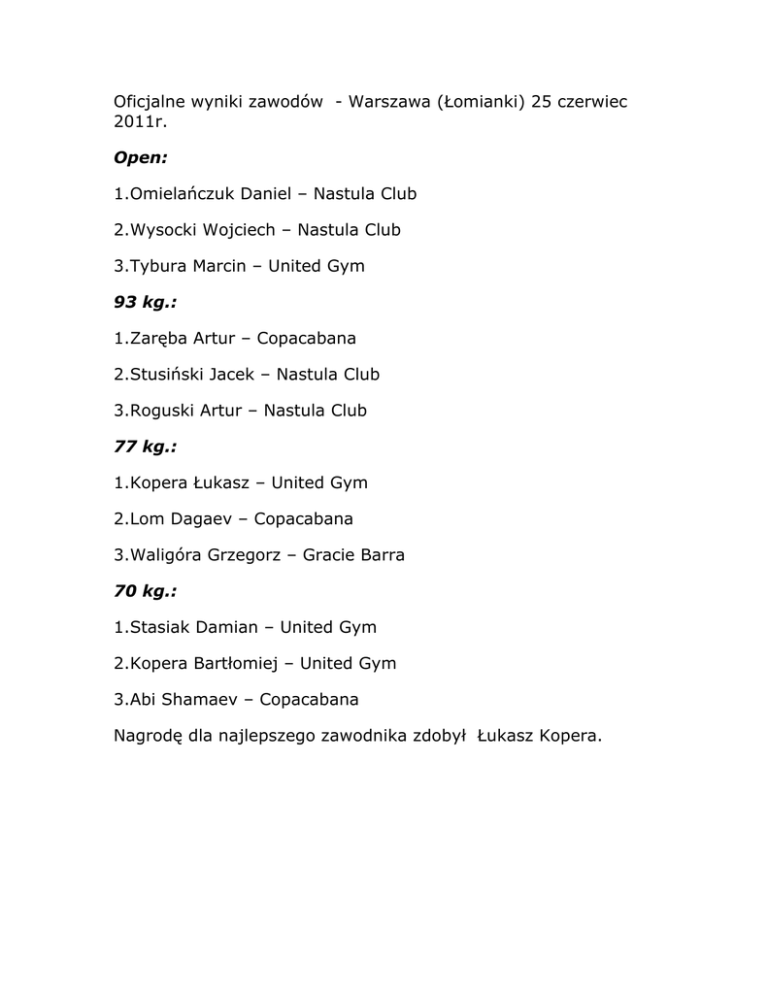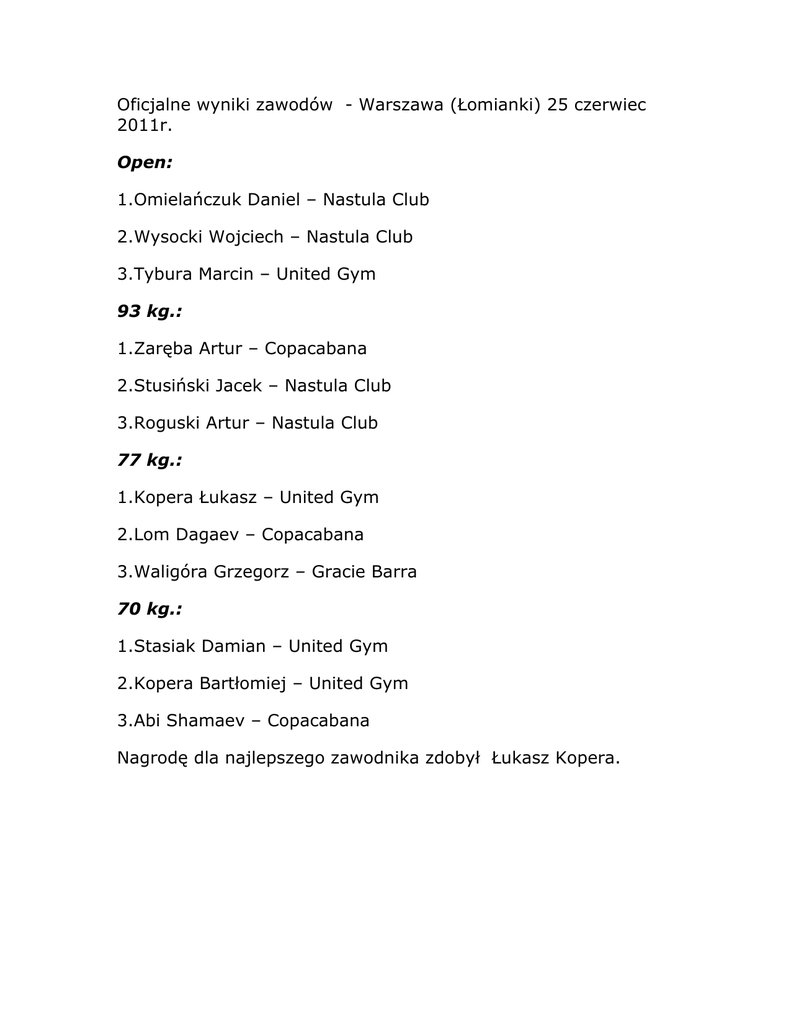 Oficjalne wyniki zawodów - Warszawa (Łomianki) 25 czerwiec 2011r. Open: 1.Omielańczuk Daniel – Nastula Club 2.Wysocki Wojciech – Nastula Club 3.Tybura Marcin – United Gym 93 kg.: 1.Zaręba Artur – Copacabana 2.Stusiński Jacek – Nastula Club 3.Roguski Artur – Nastula Club 77 kg.: 1.Kopera Łukasz – United Gym 2.Lom Dagaev – Copacabana 3.Waligóra Grzegorz – Gracie Barra 70 kg.: 1.Stasiak Damian – United Gym 2.Kopera Bartłomiej – United Gym 3.Abi Shamaev – Copacabana Nagrodę dla najlepszego zawodnika zdobył Łukasz Kopera.