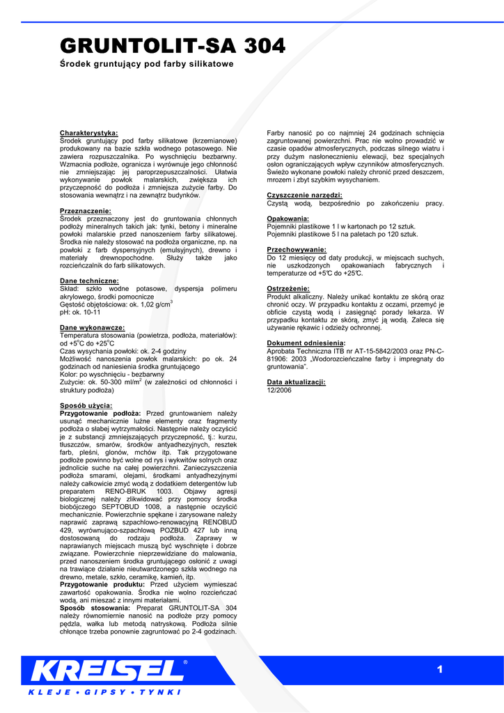 GRUNTOLITGRUNTOLIT-SA 304 Środek gruntujący pod farby silikatowe Charakterystyka: Środek gruntujący pod farby silikatowe (krzemianowe) produkowany na bazie szkła wodnego potasowego. Nie zawiera rozpuszczalnika. Po wyschnięciu bezbarwny. Wzmacnia podłoŜe, ogranicza i wyrównuje jego chłonność nie zmniejszając jej paroprzepuszczalności. Ułatwia wykonywanie powłok malarskich, zwiększa ich przyczepność do podłoŜa i zmniejsza zuŜycie farby. Do stosowania wewnątrz i na zewnątrz budynków. Przeznaczenie: Środek przeznaczony jest do gruntowania chłonnych podłoŜy mineralnych takich jak: tynki, betony i mineralne powłoki malarskie przed nanoszeniem farby silikatowej. Środka nie naleŜy stosować na podłoŜa organiczne, np. na powłoki z farb dyspersyjnych (emulsyjnych), drewno i materiały drewnopochodne. SłuŜy takŜe jako rozcieńczalnik do farb silikatowych. Dane techniczne: Skład: szkło wodne potasowe, dyspersja akrylowego, środki pomocnicze Gęstość objętościowa: ok. 1,02 g/cm3 pH: ok. 10-11 polimeru Dane wykonawcze: Temperatura stosowania (powietrza, podłoŜa, materiałów): od +5oC do +25oC Czas wysychania powłoki: ok. 2-4 godziny MoŜliwość nanoszenia powłok malarskich: po ok. 24 godzinach od naniesienia środka gruntującego Kolor: po wyschnięciu - bezbarwny ZuŜycie: ok. 50-300 ml/m2 (w zaleŜności od chłonności i struktury podłoŜa) Farby nanosić po co najmniej 24 godzinach schnięcia zagruntowanej powierzchni. Prac nie wolno prowadzić w czasie opadów atmosferycznych, podczas silnego wiatru i przy duŜym nasłonecznieniu elewacji, bez specjalnych osłon ograniczających wpływ czynników atmosferycznych. ŚwieŜo wykonane powłoki naleŜy chronić przed deszczem, mrozem i zbyt szybkim wysychaniem. Czyszczenie narzędzi: Czystą wodą, bezpośrednio po zakończeniu pracy. Opakowania: Pojemniki plastikowe 1 l w kartonach po 12 sztuk. Pojemniki plastikowe 5 l na paletach po 120 sztuk. Przechowywanie: Do 12 miesięcy od daty produkcji, w miejscach suchych, nie uszkodzonych opakowaniach fabrycznych i temperaturze od +5°C do +25°C. OstrzeŜenie: Produkt alkaliczny. NaleŜy unikać kontaktu ze skórą oraz chronić oczy. W przypadku kontaktu z oczami, przemyć je obficie czystą wodą i zasięgnąć porady lekarza. W przypadku kontaktu ze skórą, zmyć ją wodą. Zaleca się uŜywanie rękawic i odzieŜy ochronnej. Dokument odniesienia: Aprobata Techniczna ITB nr AT-15-5842/2003 oraz PN-C81906: 2003 „Wodorozcieńczalne farby i impregnaty do gruntowania”. Data aktualizacji: 12/2006 Sposób uŜycia: Przygotowanie podłoŜa: Przed gruntowaniem naleŜy usunąć mechanicznie luźne elementy oraz fragmenty podłoŜa o słabej wytrzymałości. Następnie naleŜy oczyścić je z substancji zmniejszających przyczepność, tj.: kurzu, tłuszczów, smarów, środków antyadhezyjnych, resztek farb, pleśni, glonów, mchów itp. Tak przygotowane podłoŜe powinno być wolne od rys i wykwitów solnych oraz jednolicie suche na całej powierzchni. Zanieczyszczenia podłoŜa smarami, olejami, środkami antyadhezyjnymi naleŜy całkowicie zmyć wodą z dodatkiem detergentów lub preparatem RENO-BRUK 1003. Objawy agresji biologicznej naleŜy zlikwidować przy pomocy środka biobójczego SEPTOBUD 1008, a następnie oczyścić mechanicznie. Powierzchnie spękane i zarysowane naleŜy naprawić zaprawą szpachlowo-renowacyjną RENOBUD 429, wyrównująco-szpachlową POZBUD 427 lub inną dostosowaną do rodzaju podłoŜa. Zaprawy w naprawianych miejscach muszą być wyschnięte i dobrze związane. Powierzchnie nieprzewidziane do malowania, przed nanoszeniem środka gruntującego osłonić z uwagi na trawiące działanie nieutwardzonego szkła wodnego na drewno, metale, szkło, ceramikę, kamień, itp. Przygotowanie produktu: Przed uŜyciem wymieszać zawartość opakowania. Środka nie wolno rozcieńczać wodą, ani mieszać z innymi materiałami. Sposób stosowania: Preparat GRUNTOLIT-SA 304 naleŜy równomiernie nanosić na podłoŜe przy pomocy pędzla, wałka lub metodą natryskową. PodłoŜa silnie chłonące trzeba ponownie zagruntować po 2-4 godzinach. 1