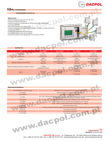 12.4.3 Sterowniki STEROWNIKI Alpha xl Właściwości: - zakres temperatur pracy od -25°C do 55°C, - możliwość dalszej rozbudowy, - wielkość programu sterującego do 200 bloczków lub 5000 bajtów w pamięci EEPROM, - duży, podświetlany wyświetlacz LCD, - 8 wejść analogowych o rozdzielczości 9 bitów w każdym modelu ALPHA XL zasilanym 24 V DC, - wbudowany drugi port komunikacyjny, - wbudowany zegar czasu rzeczywistego, - tworzenie programu sterującego jak w sterowniku ALPHA. AlPHa XL Typ AL2-14MR-D AL2-14MR-A AL2-24MR-D AL2-24MR-A Wej./Wyj. 14 8wej./6wyj. 14 8wej./6wyj. 24 15wej./9wyj. 24 15wej./9wyj. Rozszerzenie do18wej./wyj. do18wej./wyj. do 28 wej./wyj. do 28 wej./wyj. Zasilanie 24VDC +20%-15% 100-240 VAC; 50-60 Hz +10%-15% 24VDC +20%-15% 100-240 VAC; 50-60 Hz +10%-15% Napięcie wejściowe dwustanowe 24VDC +20%-15% 100-240 VAC; 50-60 Hz +10%-15% 24VDC +20%-15% 100-240 VAC; 50-60 Hz +10%-15% Wejścia konfigurowane jako analogowe -maks. 8 8 0...10VDC rozdzielczość 9 bitów - 8 (101-108) 0...10VDC rozdzielczość 9 bitów - Wyjścia przekaźniki 8A/COM przekaźniki 8A/COM przekaźniki 4 x 8A/COM przekaźniki 4 x 8A/COM 5 x 2A/COM 5 x 2A/COM Wyposażenie dodatkowe: AL-PCS/WIN-EU V. 2.00 lub wyższa Oprogramowanie narzędziowe do sterowników ALPHA XL AL-232CAB Kabel do programowania sterowników ALPHA XL AL2-EEPROM Dodatkowa kaseta pamięci EEPROM AL2-4EX (EU - EI4); 4 wejścia dwustanowe 24 V DC, + 20% / -15% typu sink&source; EU oraz EI2 mogą pracować jako liczniki szybkie do 1 kHz (wraz z bloczkiem COUNTER oraz SPD) AL2-4EX-A2 (EU - EI4); 4 wejścia dwustanowe 220 - 240 VAC, +10% / -15%, 50 - 60 Hz AL2-4EYR (EO01 - EO04); 4 wyjścia dwustanowe przekaźnikowe; 2 A / wyjście AL2-4EYT (EO01 - EO04); 4 wyjścia dwustanowe tranzystorowe; 1 A / wyjście AL2-ASI-BD Interfejs slave do sieci ASI AL2-GSM-CAB Interfejs z wyjściem RS232 do podłączenia modemi GSM, modemu telefonicznego lub komputera PC AL2-2 DA Dwa wyjścia analogowe AL2-2TC-ADP Dwa wejścia do termopar AL2-2PT-ADP Dwa wejścia do Pt100; zobacz również „Zasilacze” na stronie 745 Dacpol Sp. z o.o. ul. Puławska 34, 05-500 Piaseczno k/Warszawy tel. (+48) 22 70 35 100, fax. (+48) 22 70 35 101, [email protected], www.dacpol.com.pl Seria Jazz - sterownik z panelem 2-linijkowym (2 linie na 16 znaków) - zastępuje przekaźniki logiczne i timery niezawodny sterownik do urządzeń przemysłowych - zaprojektowany do pracy w przemysłowych warunkach - możliwość łączenia w sieć. Modbus Master/Slave - zgodny zmiędzynarodowymi standardami JAZZ to nowa seria sterowników firmy Unltronlcs. Zaprojektowane specjalnie do zastosowań przemysłowych, przystosowane są do pracy w trudnych warunkach środowiskowych oraz posiadają, szereg zabezpieczeń. Występują w czterech różnych modelach różniących się rodzajem I liczbą wejść i wyjść. Sterowniki serii Jazz mogą być montowane na penelu (IP65) lub na szynie DIN (IP20). • typ HMI: STN LCD, podświetlenie LED • do zaprojektowania 60 ekranów • możliwość wyświetlenia 64 zmiennych takich jak czas, data, zegar i zmienne • 16 klawiszy w tym 15 programowalnych Typ Wejścia Wyjścia Zasilanie JZ10-11-R10 6 wejść dwustanowych 24 VDC; 4 wyjścia przekaźnikowe; 24 VDC JZ10-11-T10 6 wejść dwustanowych 24 VDC; 4 wyjścia tranzystorowe; 24 VDC 6 wejść dwustanowych 24 VDC; 2 we cyfrowe / analogowe (0-10V), 2 we analogowe 7 wyjść tranzystorowych; 6 wejść dwustronnych 24 VDC; 2 we cyfrowe / analogowe (0-10V), 2 we analogowe JZ10-11-R31 16 wejść dwustanowych 24 VDC; 2 we cyfrowe / analogowe (0-10V), 2 we analogowe Dimensions 24VDC (0/4-20mA), JZ10-11-T40 24 VDC (0/4-20mA), 11 wyjść przekaźnikowych; 20 wyjść tranzystorowych; Dimensions 147.5 mm (5.807") 16 wejść dwustanowych 24 VDC; 2 we 12 mm (0.472") cyfrowe / analogowe (0-10V), 2 we analogowe 16.8 mm (0.661") 147.5 mm (5.807") 117 mm (4.606") 24VDC (0/4-20mA), 12 mm (0.472") 16.8 mm (0.661") 85.7 mm (3.374") JZ10-11 T17 24VDC (0/4-20mA), 85.7 mm (3.374") 4 mm (0.157") JZ10-11-R16 6 wyjść przekaźnikowych; Dimensions 113.7 mm (4.476") 16.8 mm (0.661") 113.7 mm (4.476") 13.2 mm (0.52") 46.6 mm (1.835") 7.5 mm (0.295") Mounting Panel mounting DIN-rail mounting Panel mounting DIN-rail mounting 113.7 mm (4.476") Snap unit onto the DIN rail 13.2 mm (0.52") 46.6 mm (1.835") Snap unit onto the DIN rail Insert into cut-out: 117 x 89mm (WxH) Montaż na szynie DIN 4.606”x 3.504” 304g (10.72 oz) Insert into cut-out: 117 x 89mm (WxH) 4.606”x 3.504” Weight Panel 5mm (max) 0.197" (max) DIN-rail mounting Insert into cut-out: 117 x 89mm (WxH) 4.606”x 3.504” Snap unit onto the DIN rail Gasket Panel 5mm (max) 0.197" (max) . . . . 35 mm (1.378") Panel mounting 53 mm (2.087") Mounting 35 mm (1.378") Panel 5mm (max) 0.197" (max) 53 mm (2.087") Montaż panelowy 304g (10.72 oz) 4 mm (0.157") Mounting 117 mm (4.606") 304g (10.72 oz) Weight 85.7 mm (3.374") 46.6 mm 12 (1.835") mm (0.472") 13.2 mm (0.52") 147.5 mm (5.807") Weight 7.5 mm (0.295") 4 mm (0.157") Wymiary [mm] 7.5 mm (0.295") 117 mm (4.606") Sterownik serii Jazz dostarczany jest w pakietach zawierających właściwy model sterownika, uszczelkę do montażu panelowego, zaciski wejść/wyjść oraz złączki umożliwiające montaż panelowy. Gasket The information in this document reflects products at the date of printing. Unitronics reserves the right, subject to all applicable laws, at any time, at its sole The information in this document reflects products at the date of printing. Unitronics reserves the right, subject to all applicable laws, at any time, at its sole 35 mm (1.378") discretion, and without notice, to discontinue or change the features, materials and other specifications its products, and tospecifications either permanently or discretion, and without notice, todesigns, discontinue or change the features, designs,ofmaterials and other of its products, and to either permanently or Dacpol Sp. z o.o. Puławska 34 Piaseczno k/