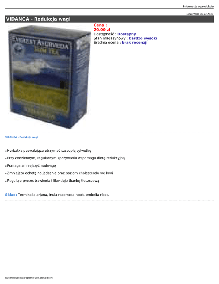 Informacje o produkcie Utworzono 06-03-2017 VIDANGA - Redukcja wagi Cena : 20.00 zł Dostępność : Dostępny Stan magazynowy : bardzo wysoki Średnia ocena : brak recenzji VIDANGA - Redukcja wagi ¤ Herbatka pozwalająca utrzymać szczupłą sylwetkę ¤ Przy codziennym, regularnym spożywaniu wspomaga dietę redukcyjną ¤ Pomaga zmniejszyć nadwagę ¤ Zmniejsza ochotę na jedzenie oraz poziom cholesterolu we krwi ¤ Reguluje proces trawienia i likwiduje tkankę tłuszczową Skład: Terminalia arjuna, inula racemosa hook, embelia ribes. Wygenerowano w programie www.oscGold.com