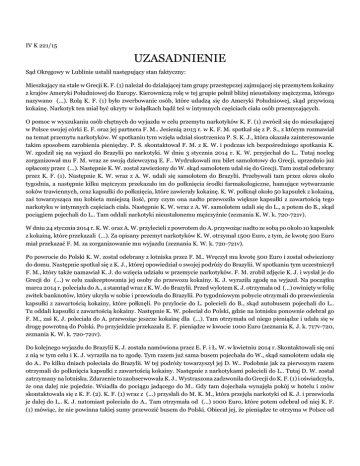 IV K 221/15 UZASADNIENIE Sąd Okręgowy w Lublinie ustalił następujący stan faktyczny: Mieszkający na stałe w Grecji K. F. (1) należał do działającej tam grupy przestępczej zajmującej się przemytem kokainy z krajów Ameryki Południowej do Europy. Kierowniczą rolę w tej grupie pełnił bliżej nieustalony mężczyzna, którego nazywano (...). Rolą K. F. (1) było zwerbowanie osób, które udadzą się do Ameryki Południowej, skąd przywiozą kokainę. Narkotyk ten miał być ukryty w żołądkach bądź też w intymnych częściach ciała osób przemycających. O pomoc w wyszukaniu osób chętnych do wyjazdu w celu przemytu narkotyków K. F. (1) zwrócił się do mieszkającej w Polsce swojej córki E. F. oraz jej partnera F. M.. Jesienią 2013 r. w K. F. M. spotkał się z P. S., z którym rozmawiał na temat przemytu narkotyków. W spotkaniu tym wzięła udział siostrzenica P. S. K. J., która okazała zainteresowanie takim sposobem zarobienia pieniędzy. P. S. skontaktował F. M. z K. W. i podczas ich bezpośredniego spotkania K. W. zgodził się na wyjazd do Brazylii po narkotyki. W dniu 3 stycznia 2014 r. K. W. przyjechał do L.. Tutaj nocleg zorganizował mu F. M. wraz ze swoją dziewczyną E. F.. Wydrukowali mu bilet samolotowy do Grecji, uprzednio już opłacony przez (...). Następnie K. W. został zawieziony do W. skąd samolotem udał się do Grecji. Tam został odebrany przez K. F. (1). Następnie K. W. wraz z A. W. udali się samolotem do Brazylii. Przebywali tam przez okres około tygodnia, a następnie kilku mężczyzn przekazało im do połknięcia środki farmakologiczne, hamujące wytwarzanie soków trawiennych, oraz kapsułki do połknięcia, które zawierały kokainę. K. W. połknął około 50 kapsułek z kokainą, zaś towarzysząca mu kobieta mniejszą ilość, przy czym ona nadto przewoziła większe kapsułki z zawartością tego narkotyku w intymnych częściach ciała. Następnie K. W. wraz z A. W. samolotem udali się do L., a potem do B., skąd pociągiem pojechali do L.. Tam oddali narkotyki nieustalonemu mężczyźnie (zeznania K. W. k. 720-721v). W dniu 24 stycznia 2014 r. K. W. oraz A. W. przylecieli z powrotem do A. przywożąc nadto ze sobą po około 10 kapsułek z kokainą, które przekazali (...). Za opisany przemyt narkotyków K. W. otrzymał 1500 Euro, z tym, że kwotę 500 Euro miał przekazać F. M. za zorganizowanie mu wyjazdu (zeznania K. W. k. 720-721v). Po powrocie do Polski K. W. został odebrany z lotniska przez F. M.. Wręczył mu kwotę 500 Euro i został odwieziony do domu. Następnie spotkał się z K. J., której opowiedział o swojej podróży do Brazylii. W spotkaniu tym uczestniczył F. M., który także namawiał K. J. do wzięcia udziału w przemycie narkotyków. F. M. zrobił zdjęcie K. J. i wysłał je do Grecji do (...) w celu zaakceptowania jej osoby do przewozu kokainy. K. J. wyraziła zgodę na wyjazd. Na początku marca 2014 r. poleciała do A., a stamtąd wraz z K. W. do Brazylii. Przed wylotem K. J. otrzymała od (...) owinięty w folię zwitek banknotów, który ukryła w sobie i przewiozła do Brazylii. Po tygodniowym pobycie otrzymali do przewiezienia kapsułki z zawartością kokainy, które połknęli. Po przylocie do L. polecieli do B., skąd autobusem pojechali do L.. Tu oddali kapsułki z zawartością kokainy. Następnie K. W. poleciał do Polski, gdzie na lotnisku ponownie odebrał go F. M., zaś K. J. poleciała do A. przewożąc jeszcze kokainę dla (...). Tam otrzymała od niego pieniądze i udała się w drogę powrotną do Polski. Po przyjeździe przekazała E. F. pieniądze w kwocie 1000 Euro (zeznania K. J. k. 717v-720, zeznania K. W. k. 720-721v). Do kolejnego wyjazdu do Brazylii K. J. została namówiona przez E. F. i Ł. W. w kwietniu 2014 r. Skontaktowali się oni z nią w tym celu i K. J. wyraziła na to zgodę. Tym razem już sama busem pojechała do W., skąd samolotem udała się do A.. Po kilku dniach poleciała do Brazylii. W tej podróży towarzyszył jej D. W.. Podobnie jak za pierwszym razem otrzymali do połknięcia kapsułki z zawartością kokainy. Następnie z narkotykami polecieli do L.. Tutaj D. W. został zatrzymany na lotnisku. Zdarzenie to zaobserwowała K. J.. Wystraszona zadzwoniła do Grecji do K. F. (1) i oświadczyła, że ona dalej nie pojedzie. Wsiadła do pociągu jadącego do M.. Gdy tam dojechała wynajęła pokój w hotelu i znów skontaktowała się z K. F. (2). K. F. (1) wraz z (...) przysłali do M. K. M., która przejęła narkotyki od K. J. i przewiozła je dalej do L.. K. J. natomiast poleciała do A.. Tam otrzymała od (...) 1000 Euro, które potem odebrał od niej K. F. (1) mówiąc, że nie powinna takiej sumy przewozić busem do Polski. Obiecał jej, że pieniądze te otrzyma w Polsce od E. F.. Przed wyjazdem do Polski K. J. otrzymała od K. F. (1) do przewiezienia odkurzacz zapakowany w pudełko, przy czym wewnątrz odkurzacza umieszczone zostało 965,50 g marihuany. Odkurzacz ten miał w Polsce odebrać Ł. W.. W dniu 26 maja 2014 r. K. J. przyjechała busem z Grecji do L., gdzie została zatrzymana przez funkcjonariuszy celnych oraz policjantów. W przewożonym przez nią odkurzaczu ujawniono narkotyki i dokonano zatrzymania K. J. (zeznania K. J. k. 717v-720, zeznania M. T. k. 814-814v).). E. F. i F. M. zostali oskarżeni o to, że w czasie od sierpnia 2013 r. do końca maja 2014 r., w K., w L. i w W., wspólnie i w porozumieniu z innymi ustalonymi i nieustalonymi osobami, czyniąc z popełnienia przestępstwa stałe źródło dochodu, w ramach zorganizowanej grupy przestępczej, dopuścili się handlu ludźmi polegającego na zwerbowaniu i transportowaniu K. W. i K. J. w celu wykorzystania w okolicznościach poniżających godność człowieka do wprowadzania na obszar celny Wspólnoty Europejskiej znacznych ilości kokainy – środka odurzającego z grupy IN oraz do udziału w wewnątrzwspólnotowym nabywaniu znacznych ilości ziela konop