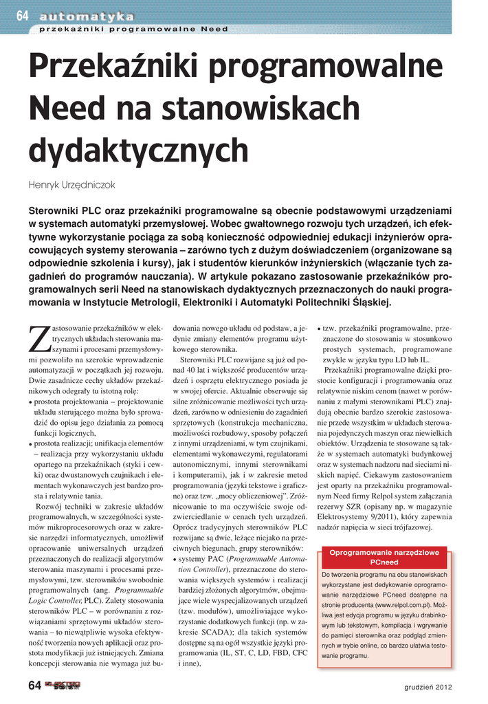 64 przekaüniki programowalne Need Przekaźniki programowalne Need na stanowiskach dydaktycznych Henryk Urzędniczok Sterowniki PLC oraz przekaüniki programowalne sπ obecnie podstawowymi urzπdzeniami w systemach automatyki przemys≥owej. Wobec gwa≥townego rozwoju tych urzπdzeÒ, ich efektywne wykorzystanie pociπga za sobπ koniecznoúÊ odpowiedniej edukacji inøynierÛw opracowujπcych systemy sterowania ñ zarÛwno tych z duøym doúwiadczeniem (organizowane sπ odpowiednie szkolenia i kursy), jak i studentÛw kierunkÛw inøynierskich (w≥πczanie tych zagadnieÒ do programÛw nauczania). W artykule pokazano zastosowanie przekaünikÛw programowalnych serii Need na stanowiskach dydaktycznych przeznaczonych do nauki programowania w Instytucie Metrologii, Elektroniki i Automatyki Politechniki ålπskiej. Z astosowanie przekaünikÛw w elektrycznych uk≥adach sterowania maszynami i procesami przemys≥owymi pozwoli≥o na szerokie wprowadzenie automatyzacji w poczπtkach jej rozwoju. Dwie zasadnicze cechy uk≥adÛw przekaünikowych odegra≥y tu istotnπ rolÍ: ï prostota projektowania ñ projektowanie uk≥adu sterujπcego moøna by≥o sprowadziÊ do opisu jego dzia≥ania za pomocπ funkcji logicznych, ï prostota realizacji; unifikacja elementÛw ñ realizacja przy wykorzystaniu uk≥adu opartego na przekaünikach (styki i cewki) oraz dwustanowych czujnikach i elementach wykonawczych jest bardzo prosta i relatywnie tania. RozwÛj techniki w zakresie uk≥adÛw programowalnych, w szczegÛlnoúci systemÛw mikroprocesorowych oraz w zakresie narzÍdzi informatycznych, umoøliwi≥ opracowanie uniwersalnych urzπdzeÒ przeznaczonych do realizacji algorytmÛw sterowania maszynami i procesami przemys≥owymi, tzw. sterownikÛw swobodnie programowalnych (ang. Programmable Logic Controller, PLC). Zalety stosowania sterownikÛw PLC ñ w porÛwnaniu z rozwiπzaniami sprzÍtowymi uk≥adÛw sterowania ñ to niewπtpliwie wysoka efektywnoúÊ tworzenia nowych aplikacji oraz prostota modyfikacji juø istniejπcych. Zmiana koncepcji sterowania nie wymaga juø bu- 64 dowania nowego uk≥adu od podstaw, a jedynie zmiany elementÛw programu uøytkowego sterownika. Sterowniki PLC rozwijane sπ juø od ponad 40 lat i wiÍkszoúÊ producentÛw urzπdzeÒ i osprzÍtu elektrycznego posiada je w swojej ofercie. Aktualnie obserwuje siÍ silne zrÛønicowanie moøliwoúci tych urzπdzeÒ, zarÛwno w odniesieniu do zagadnieÒ sprzÍtowych (konstrukcja mechaniczna, moøliwoúci rozbudowy, sposoby po≥πczeÒ z innymi urzπdzeniami, w tym czujnikami, elementami wykonawczymi, regulatorami autonomicznymi, innymi sterownikami i komputerami), jak i w zakresie metod programowania (jÍzyki tekstowe i graficzne) oraz tzw. Ñmocy obliczeniowejî. ZrÛønicowanie to ma oczywiúcie swoje odzwierciedlanie w cenach tych urzπdzeÒ. OprÛcz tradycyjnych sterownikÛw PLC rozwijane sπ dwie, leøπce niejako na przeciwnych biegunach, grupy sterownikÛw: ï systemy PAC (Programmable Automation Controller), przeznaczone do sterowania wiÍkszych systemÛw i realizacji bardziej z≥oøonych algorytmÛw, obejmujπce wiele wyspecjalizowanych urzπdzeÒ (tzw. modu≥Ûw), umoøliwiajπce wykorzystanie dodatkowych funkcji (np. w zakresie SCADA); dla takich systemÛw dostÍpne sπ na ogÛ≥ wszystkie jÍzyki programowania (IL, ST, C, LD, FBD, CFC i inne), ï tzw. przekaüniki programowalne, przeznaczone do stosowania w stosunkowo prostych systemach, programowane zwykle w jÍzyku typu LD lub IL. Przekaüniki programowalne dziÍki prostocie konfiguracji i programowania oraz relatywnie niskim cenom (nawet w porÛwnaniu z ma≥ymi sterownikami PLC) znajdujπ obecnie bardzo szerokie zastosowanie przede wszystkim w uk≥adach sterowania pojedynczych maszyn oraz niewielkich obiektÛw. Urzπdzenia te stosowane sπ takøe w systemach automatyki budynkowej oraz w systemach nadzoru nad sieciami niskich napiÍÊ. Ciekawym zastosowaniem jest oparty na przekaüniku programowalnym Need firmy Relpol system za≥πczania rezerwy SZR (opisany np. w magazynie Elektrosystemy 9/2011), ktÛry zapewnia nadzÛr napiÍcia w sieci trÛjfazowej. Oprogramowanie narzÍdziowe PCneed Do tworzenia programu na obu stanowiskach wykorzystane jest dedykowanie oprogramowanie narzÍdziowe PCneed dostÍpne na stronie producenta (www.relpol.com.pl). Moøliwa jest edycja programu w jÍzyku drabinkowym lub tekstowym, kompilacja i wgrywanie do pamiÍci sterownika oraz podglπd zmiennych w trybie online, co bardzo u≥atwia testowanie programu. grudzieÒ 2012 65 przekaüniki programowalne Need Rys. 1. Stanowisko do programowania sterowania rozruchem silnika indukcyjnego. kÛw programowalnych, nauka programowania w jÍzyku drabinkowym a takøe ugruntowanie wiedzy z zakresu realizacji dyskretnych algorytmÛw sterowania i regulacji. Sterowanie rozruchem silnika indukcyjnego duøej mocy Pierwsze stanowisko, pokazane na rysunku 1, przygotowano do realizacji zadania typowego dla przekaünikÛw programowal66 R E K L A M A Rys. 2. Uk≥ad po≥πczeÒ uzwojeÒ silnika Stanowiska dydaktyczne z przekaünikami Need W Instytucie Metrologii, Elektroniki i Automatyki Politechniki ålπskiej, dziÍki wsparciu firmy Relpol, przygotowano dwa stanowiska dydaktyczne przeznaczone do nauki programowania przekaünikÛw programowalnych serii Need. Stanowiska te bÍdπ wykorzystywane na studiach pierwszego stopnia (inøynierskich) w zakresie przedmiotu Podstawy Automatyki dla kierunkÛw Elektrotechnika, Elektronika i Telekomunikacja oraz Informatyka Przemys≥owa. G≥Ûwnym celem jest poznanie moøliwoúci i typowych zastosowaÒ przekaüni- 65 66 przekaüniki programowalne Need Rys. 3. Stanowisko do programowania uk≥adu regulacji temperatury 65 nych ñ prostego automatu sekwencyjnego, w tym przypadku sterowania rozruchem silnika indukcyjnego duøej mocy, przy wykorzystaniu prze≥πczenia uzwojeÒ, tzw. Ñgwiazda / trÛjkπtî. Realizacja tego zadania wymaga wykorzystania programowych