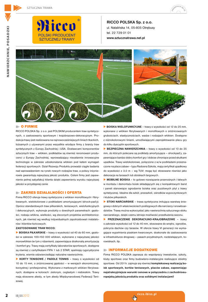 SZTUCZNA TRAWA RICCO POLSKA Sp. z o.o. N AW IERZC H N IE, PO S A D Z KI ul. Natalińska 14, 05-805 Otrębusy tel. 22 729 01 01 www.sztucznatrawa.net.pl O FIRMIE BOISKA WIELOFUNKCYJNE – trawy o wysokości od 12 do 25 mm, RICCO POLSKA Sp. z o.o. jest POLSKIM producentem traw syntetycz- wykonane z włókien fibrylowanych i monofilowych o zróżnicowanych nych, o zastosowaniu sportowym i krajobrazowo-dekoracyjnym. Pro- grubościach, elastycznościach, wadze i rodzajach włókien. Dostępne dukcja trawy jest realizowana na najnowocześniejszych liniach tkackich, z różnokolorowymi liniami, umożliwiającymi zaprojektowanie placu gry tożsamych z używanymi przez wszystkie wiodące firmy z branży traw do kilku dyscyplin sportowych. syntetycznych z Europy Zachodniej i USA. Dostawcami komponentów BEZPIECZNA NAWIERZCHNIA – trawy o wysokości od 10 do 35 sztucznych traw – włókien, podkładów są również renomowani produ- mm, do których polecane są podkłady amortyzujące – shockpad’y, za- cenci z Europy Zachodniej, wprowadzający nieustannie innowacyjne pewniające bardzo dobry komfort gry i dobrze chroniące przed skutkami technologie w zakresie udoskonalania włókien pod katem wymagań upadków. Trawy wielokolorowe, połączone z w/w podkładami przezna- federacji sportowych. Dział Rozwoju Produktu prowadzi ciągłe badania czone na place zabaw – typu Radosna Szkoła, mają certyfikat upadkowy nad wprowadzeniem na rynek nowych rodzajów traw, a polscy inżynie- do wysokości z 3,0 m – wg TUV; mogą być stosowane również jako rowie gwarantują najwyższą jakość produktu. Celem firmy jest zapew- dekoracja na tarasach lub stoiskach targowych. nienie pełnej satysfakcji klienta dzięki zapewnieniu wyrobu najwyższej MOBILNE BOISKA – to gotowe rozwiązanie przenośnych i łatwych jakości w przystępnej cenie w montażu i demontażu boisk składających się z kompaktowych band i paneli stanowiące ogrodzenie boiska oraz puzzlowych płyt z trawy ZAKRES DZIAŁALNOŚCI I OFERTA syntetycznej. Idealne dla szkół, przeszkoli, ośrodków wypoczynkowych Firma RICCO oferuje trawy syntetyczne z włókien monofilowych i fibry- i klubów piłkarskich. lowanych, wielokolorowe z podkładami amortyzującymi (shock-pad’y). STOKI NARCIARSKIE – trawa syntetyczna imitująca warstwę śnie- Oprócz standardowych traw piłkarskich, tenisowych, wielofunkcyjnych gową o dobrych właściwościach poślizgowych dla narciarzy i snowboar- i dekoracyjnych, wykonuje produkty o dowolnych parametrach: gęsto- dzistów. Trawę można wykorzystać jako nawierzchnię sztucznego stoku ści, rodzaju włókna, wielkości, wg zleconych projektów architektonicz- narciarskiego, dzięki czemu istnieje możliwość przedłużenia sezonu. nych, jak również wg według indywidualnych zapotrzebowań instalato- PRZEZNACZENIE DEKORACYJNO-KRAJOBRAZOWE – trawy rów i klientów końcowych. o zakresie wysokości od 12 do 40 mm, stosowane do wnętrz, ogrodów, ZASTOSOWANIE TRAW RICCO: pokrycia dachów czy tarasów. W ofercie trawy VI generacji nie wyma- BOISKA PIŁKARSKIE – trawy o wysokości od 40 do 60 mm, gęsto- gające wypełnienia piaskiem kwarcowym, doskonałe do zastosowania ści w zakresie 100-150 000 włókien, wykonane z najwyższej jakości w infrastrukturze drogowej – pasach przydrożnych, rozdzielających, to- monowłókien (w tym z rdzeniem), zapewniające doskonałą amortyzację rowiskach, itp. i komfort gry. Trawy mają certyfikaty laboratoriów sportowych, dostępne są również z certyfikatami FIFA 1 lub 2 STAR; spełniają rygorystyczne informacje dodatkowe kryteria, wiernie odzwierciedlając naturalne nawierzchnie. Firma RICCO POLSKA zaprasza do współpracy inwestorów, szkoły, KORTY TENISOWE / PADDLE TENNIS – trawy o wysokości od kluby sportowe oraz firmy budowlano-instalacyjne realizujące obiekty 10 do 15 mm, o zróżnicowanej gęstości – w wersjach ekonomicznej, sportowe. Od 2011r. zajmuje się również kompleksową realizacją bo- korzystnej i profesjonalnej. Wykonane z markowych włókien fibrylowa- isk sportowych, kortów tenisowych, placów zabaw, zapewniając nych; dostępne w kolorach: zielonym, ceglastym i niebieskim. Trawy najatrakcyjniejsze warunki cenowe w połączedniu z zachodnioeu- mają stosowne atesty, w tym atesty Międzynarodowej Federacji Teni- ropejską jakością produktu oraz solidnymi instalacjami! sowej. 2 2012 ricco.ibiss.pl