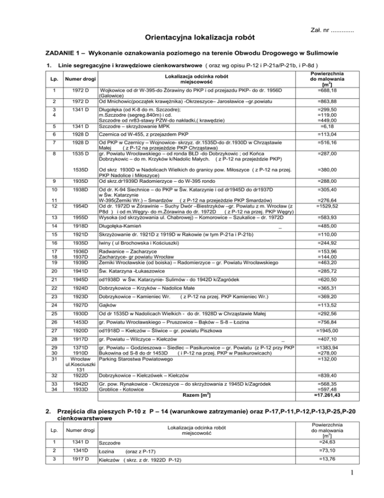 Zał. nr ............. Orientacyjna lokalizacja robót ZADANIE 1 – Wykonanie oznakowania poziomego na terenie Obwodu Drogowego w Sulimowie 1. Linie segregacyjne i krawędziowe cienkowarstwowe ( oraz wg opisu P-12 i P-21a/P-21b, i P-8d ) Lokalizacja odcinka robót miejscowość Powierzchnia do malowania [m2] =688,18 Lp. Numer drogi 1 1972 D 2 1972 D 3 4 1341 D 5 1341 D Długołęka (od K-8 do m. Szczodre); m.Szczodre (segreg.840m) i cd. Szczodre od nr83-stawy PZW-do nakładki,( krawędzie) Szczodre – skrzyŜowanie MPK 6 1928 D Czernica od W-455, z przejazdem PKP =113,04 7 1928 D =516,16 8 1535 D Od PKP w Czernicy – Wojnowice- skrzyz. dr.1535D-do dr.1930D w Chrząstawie Małej ( z P-12 na przejeŜdzie PKP Chrząstawa) gr. Powiatu Wrocławskiego – od ronda BŁD -do Dobrzykowic ; od Końca Dobrzykowic – do m. Krzyków k/Nadolic Małych. ( z P-12 na przejeŜdzie PKP) Od skrz 1930D w Nadolicach Wielkich do granicy pow. Miłoszyce ( z P-12 na przej. PKP Nadolice i Miłoszyce) Od skrz.dr1939D Radomierzyce – do W-395 rondo =380,00 1535D 9 1935D 10 1938D 11 12 1954D 13 Wojkowice od dr W-395-do śórawiny do PKP i od przejazdu PKP- do dr. 1956D (Galowice) Od Mnichowic(początek krawęŜnika) -Okrzeszyce– Jarosławice –gr.powiatu =863,88 =299,50 =119,00 =449,00 =6,18 =287,00 =288,00 =305,40 =276,64 =1529,52 1955D Od dr. K-94 Siechnice – do PKP w Św. Katarzynie i od dr1945D do dr1937D w Św. Katarzynie W-395(śerniki Wr.) – Smardzów ( z P-12 na przejeŜdzie PKP Smardzów) Od dr. 1972D w śórawinie – Suchy Dwór –Biestrzyków –gr. Powiatu z m. Wrocław (z P8d ) i od m.Węgry- do m.śórawina do dr. 1972D ( z P-12 na przej. PKP Węgry) Wysoka (od skrzyŜowania ul. Chabrowej) – Komorowice – Szukalice – dr. 1972D 14 1918D Długołęka-Kamień =485,00 15 1921D SkrzyŜowanie dr. 1921D z 1919D w Rakowie (w tym P-21a i P-21b) =110,00 16 1935D Iwiny ( ul Brochowska i Kościuszki) =244,92 17 18 19 1936D 1937D 1939D Radwanice – Zacharzyce Zacharzyce- gr powiatu Wrocław śerniki Wrocławskie (od boiska) – Radomierzyce – gr. Powiatu Wrocławskiego =153,96 =144,00 =463,20 20 1941D Św. Katarzyna -Łukaszowice =285,72 21 1945D od1938D w Św. Katarzynie- Sulimów - do 1942D k/Zagródek =620,50 22 1924D Dobrzykowice – Krzyków – Nadolice Małe =365,31 23 1923D Dobrzykowice – Kamieniec Wr. 24 1927D Gajków =113,52 25 1930D Od dr 1535D w Nadolicach Wielkich - do dr. 1928D w Chrząstawie Małej =292,56 26 1453D gr. Powiatu Wrocławskiego – Pruszowice – Bąków – S-8 – Łozina =756,84 27 1920D od1918D – Kiełczów – Śliwice – gr. powiatu Piszkowa =1945,00 28 1917D gr. Powiatu – Wilczyce – Kiełczów 29 30 31 32 1371D 1910D Wrocław ul.Kosciuszki 131 1922D 33 34 1942D 1933D _ ( z P-12 na przej. PKP Kamieniec Wr.) =583,93 =369,20 _ =407,10 gr. Powiatu – Godzieszowa – Siedlec – Pasikurowice – gr. Powiatu (z P-12 przy PKP Bukowina od S-8 do dr 1453D ( i P-12 na przej. PKP w Pasikurowicach) Parking Starostwa Powiatowego =1383,94 =278,00 =132,00 Dobrzykowice – Kiełczówek – Kiełczów =839,40 Gr. pow. Rynakowice - Okrzeszyce – do skrzyŜowania z 1945D k/Zagródek Groblice - Kotowice Razem [m2] =568,35 =597,48 =17.261,43 2. Przejścia dla pieszych P-10 z P – 14 (warunkowe zatrzymanie) oraz P-17,P-11,P-12,P-13,P-25,P-20 cienkowarstwowe Lokalizacja odcinka robót miejscowość Powierzchnia do malowania [m2] =24,63 Lp. Numer drogi 1 1341 D Szczodre 2 1341D Łozina (oraz z P-17) =73,10 3 1917 D Kiełczów ( skrz. z dr. 1922D P-12) =13,76 1 4 1917 D Wilczyce 5 1341 D =40,88 Szczodre – Stawy 6 1480 D Stępin 0,00 7 1371 D Siedlec =25,50 8 1921 D Raków =10,75 ( bez wyniesionych 2015) =13,88 9 1453 D Bierzyce =12,25 10 1453 D Pruszowice =14,25 11 1928 D Czernica =24,50 12 1928 D Wojnowice =12,75 13 1930 D Chrząstawa Wielka =21,50 14 1535 D Nadolice Wielkie 15 1926D Gajków 19,00 16 1922 D Dobrzykowie + Kiełczówek =68,05 17 1938 D Św. Katarzyna od PKP do K-94; i ul. śernicka ( oraz z P-13,P-11 ,P25) 18 1955 D Wysoka 19 1939 D śerniki Wrocławskie i Biestrzyków, oraz Radomierzyce 20 1954 D Biestrzyków 21 1954 D śerniki Wielkie =10,75 22 1956 D Wilczków =16,25 23 1956 D Jaksonów =13,50 24 1972 D Wojkowice 25 1924 D Rynakowice 26 1942 D Okrzeszyce 27 1972 D Okrzeszyce =11,50 28 1953 D Rzeplin =13,13 29 1941 D Łukaszowice =34,38 30 1945 D Sulimów =33,75 31 1937 D Zacharzyce =25,25 32 1919D Bielawa =10,75 33 1918 D Kamień i m. Długołęka =90,25 34 1910 D Bukowina =82,08 35 1371D m. Godzieszowa ( oraz z P-17) =33,88 36 1371D m. Pasikurowice =82,38 37 1920D 38 1972D m. śórawina (oraz z P-17) =137,50 39 1954D m. śórawina (oraz z P-13) =75,30 40 1955D Karwiany =13,12 41 1934D Trestno 42 1972D Mnichowice =28,50 43 1341D Łosice =13,50 44 1972D śórawina „ORANGE” – wieŜa telewizyjna =21,00 45 1954D Mędłów =19,63 46 1954D Suchy Dwór 47 1923D Kamieniec Wrocławski (k/szkoły) ( tym P-20) =40,50 48 1972D Jarosławice =14,25 49 1453D Domaszczyn (k/pos.nr 71 i k/wiaty 50 1938D Smardzów ( P-25 i P-17) 51 1941D Święta Katarzyna =14,25 52 1933D Groblice =14,25 53 1933D Kotowice 0,00 ( +nowe pl.zabaw) =256,99 =42,93 (oraz z P-14, P-17) =57,63 =30,69 (oraz z P-14, P-17 ) =25,50 (oraz z P-12 ) =11,50 =21,68 ( oraz z P-12 i P-13) (oraz z P-21) ( oraz z P-17, P-12) =10,00 Brzezia Łąka (w tym nowe) =26,24 =15,25 ( z P-25) (oraz z P17) =32,05 =34,46 =25,50 Razem [m2] =1.814,87 2 3. Przejścia dla pieszych P-10 z P – 14 (warunkowe zatrzymanie), oraz P-17 grubowarstwowe Lokalizacja odcinka robót miejscowość Lp. Numer drogi 1 1341D Łosice ( z P-17) 2 1341D Łozina ( z P-17) Powierzchnia do malowania [m2] 19,38 16,80 2 Razem [m ] =36,18 4. Piktogramy cienkowarstwowe typu A-17 i P-23 i P-17 Lokalizacja odcinka robót miejscowość Powierzchnia do malowania [m2] 8,00 Lp. Numer drogi 1 1371 D Siedlec 2 1920 D Brzezia Łąka 14,84 4 1953 D Rzeplin 8,00 5 1938D Św. Katarzyna – Siechnice od PKP – K-94. P-23 – 28 szt. 18,54 6 1954D Biestr