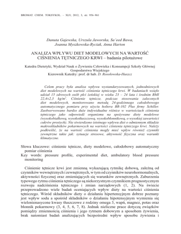 BROMAT. CHEM. TOKSYKOL. – XLV, 2012, 3, str. 956–961 Danuta Gajewska, Urszula Jaworska, Sa’eed Bawa, Joanna Myszkowska-Ryciak, Anna Harton ANALIZA WPŁYWU DIET MODELOWYCH NA WARTOŚĆ CIŚNIENIA TĘTNICZEGO KRWI – badania pilotażowe Katedra Dietetyki, Wydział Nauk o Żywieniu Człowieka i Konsumpcji Szkoły Głównej Gospodarstwa Wiejskiego Kierownik Katedry: prof. dr hab. D. Rosołowska-Huszcz Celem pracy była analiza wpływu wystandaryzowanych, jednodniowych diet modelowych na wartość ciśnienia tętniczego krwi. W badaniach wzięło udział 15 zdrowych osób płci żeńskiej w wieku 23 – 24 lata i średnim BMI 22,4±2,3 kg/m2. Ciśnienie tętnicze, podczas stosowania zaleconych diet modelowych, monitorowano metodą 24-godzinnego całodobowego automatycznego pomiaru przy użyciu holtera BR-102 Plus firmy Schiller. Zaobserwowano bardzo duże indywidualne różnice w wartościach ciśnienia tętniczego jako odpowiedź organizmu na spożywane diety modelowe (wysokobiałkową, wysokotłuszczową, wysokobłonnikową, o wysokiej zawartości cukrów prostych). Nie stwierdzono istotnego wpływu diet o odmiennym składzie makroskładników pokarmowych na wartości ciśnienia tętniczego krwi. Należy podkreślić, że na wartość ciśnienia mogły mieć wpływ również czynniki zewnętrzne takie jak: sytuacje stresowe, aktywność fizyczna oraz warunki klimatyczne. Słowa kluczowe: ciśnienie tętnicze, diety modelowe, całodobowy automatyczny pomiar ciśnienia Key words: pressure profile, experimental diet, ambulatory blood pressure monitoring Ciśnienie tętnicze krwi jest zmienną wykazującą rytmikę dobową, zależną od czynników wewnętrznych i zewnętrznych, w tym od czynników neurohormonalnych, aktywności fizycznej oraz zmieniających się warunków zewnętrznych. Zaburzenia typowego rytmu ciśnienia tętniczego są niekorzystnym czynnikiem prognostycznym rozwoju nadciśnienia tętniczego i zmian narządowych (1, 2). Na świecie przeprowadzono wiele badań oceniających wpływ diety na wartości ciśnienia tętniczego. Wśród składników diety o działaniu hipertensyjnym dobrze poznany jest wpływ sodu a spośród składników o działaniu hipotensyjnym wymienia się wielonienasycone kwasy tłuszczowe z rodziny omega 3, wapń, magnez, potas oraz błonnik pokarmowy (3, 4, 5, 6, 7, 8). Jednak nieliczne prace dotyczą związków pomiędzy zmiennością ciśnienia i jego rytmem dobowym a sposobem żywienia, brak natomiast badań analizujących bezpośredni wpływ sposobu żywienia i Nr 3 957 Wpływ diet modelowych na wartość ciśnienia krwi zawartych w diecie składników odżywczych w krótkim czasie na wartości ciśnienia. Niniejsza praca jest próbą oceny wpływu składu diety na wartości ciśnienia tętniczego mierzonego metodą całodobowego automatycznego pomiaru ciśnienia AMBP (Ambulatory Blood Pressure Monitoring), która pozwala zarówno na ocenę całodobowego rytmu ciśnienia jak też krótkookresowych jego wahań (9, 10). MATERIAŁ I METODY Badaniami objęto 15 zdrowych osób płci żeńskiej, studentek Szkoły Głównej Gospodarstwa Wiejskiego. Osoby te charakteryzowały się niską aktywnością fizyczną, nie przyjmowały leków ani suplementów oraz nie paliły. Stan odżywienia studentek oceniono na podstawie pomiarów masy ciała, wzrostu, obwodów talii i bioder oraz wskaźnika masy ciała BMI. Na potrzeby niniejszego doświadczenia opracowano cztery diety modelowe, o zróżnicowanych proporcjach makroskładników: wysokobiałkową (DB), wysokotłuszczową (DT), wysokobłonnikową (DBł) oraz dietę bogatą w cukry proste (DCp). Opracowano także modelowe, jednodniowe jadłospisy spełniające założone kryteria. Udział makroskładników pokarmowych w dietach modelowych zamieszczono w tabeli I. Dietę kontrolną stanowiła dieta zwyczajowo spożywana przez poszczególne osoby. Jednodniowe diety modelowe stosowano w 7-dniowych interwałach czasowych. Ciśnienie tętnicze monitorowano metodą 24-godzinnego całodobowego automatycznego pomiaru przy użyciu holtera BR-102 Plus firmy Schiller. Rejestracja pomiarów ciśnienia (w czasie aktywnym i spoczynku) dokonywana była co 20 min w trakcie normalnej aktywności życiowej studentek. Uśrednione wartości ciśnienia tętniczego, skurczowego (SBP) i rozkurczowego (DBP), zmierzone w czasie stosowania diet modelowych odnoszono do wartości ciśnienia osób badanych uzyskanych podczas stosowania diety zwyczajowej. Oceny zwyczajowego sposobu żywienia dokonano przy użyciu metody 3-dniowego bieżącego notowania spożycia żywności. Wartość energetyczną diety oraz zawartość składników pokarmowych obliczono korzystając z programu komputerowego DIETETYK 2. Analizy statystycznej uzyskanych wyników dokonano przy pomocy testu t-Studenta. Ta b e l a I . Udział makroskładników pokarmowych w poszczególnych dietach modelowych Ta b l e I . Macronutrients composition of experimental diet DB Energia (kcal) Białko (%) Tłuszcz (%) Węglowodany (%) Błonnik (g) Cukry proste (%) 2198 22 28 50 18 2,4 DBł 2170 13 27 60 46 4,3 DT 2035 13 49 38 9 2,7 DCp 2104 12 30 58 10 22 DB - dieta wysokobiałkowa; DBł – dieta wysokobłonnikowa; DT – dieta wysokotłuszczowa; DCp – dieta o zwiększonej zawartości cukrów prostych 958 Nr 3 D. Gajewska i inni WYNIKI I ICH OMÓWIENIE Średnia wieku badanych kobiet wynosiła 23,7±0,5 lat. Średnie BMI natomiast wynosiło 22,4±2,3 kg/m2. Tylko w jednym przypadku wartości BMI odbiegały od wartości prawidłowych (29 kg/m2). Ocena zwyczajowego sposobu żywienia badanych osób wykazała zróżnicowaną podaż energii, wahającą się od niespełna 1200 kcal do ponad 2200 kcal (Tab. II). Zgodnie z zaleceniami wartość energetyczna diety dla tej grupy populacyjnej powinna wynosić około 2200 kcal/d (11). Udział energii pochodzącej z białka oraz tłuszczu był zgodny z wartościami referencyjnymi (odpowiednio 13% i 28%). Jedynie podaż energii z węglowodanów