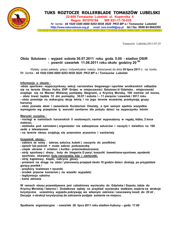 TUKS ROZTOCZE ROLLERBLADE TOMASZÓW LUBELSKI 22-600 Tomaszów Lubelski ul. Kopernika 4 Regon 951076194 NIP 921-17-76-535 Nr konta : 44 1020 5385 0000 9202 0038 3620 PKO BP o / Tomaszów Lubelski http://www.tuksroztocze.org.pl email :[email protected] tel./ fax 0048 84 6642305 TUKS ROZTOCZE ROLLERBLADE TOMASZÓW LUBELSKI --- TUKS ROZTOCZE ROLLERBLADE TOMASZÓW LUBELSKI --- TUKS ROZTOCZE ROLLERBLADE TOMASZÓW LUBELSKI --- TUKS ROZTOCZE ROLLERBLADE Tomaszów Lubelski,2011-07-25 Obóz Sztutowo - wyjazd sobota 30.07.2011 roku godz. 5.00 - stadion OSiR - powrót czwartek 11.08.2011 roku około godziny 20 00 Wpłaty przez zakłady pracy i indywidualne należy dokonywać do dnia 30 lipca 2011 r. na konto. Nr konta : 44 1020 5385 0000 9202 0038 3620 PKO BP o / Tomaszów Lubelski Informacje o obozie : -obóz sportowo - wypoczynkowy sekcji narciarstwa biegowego i sportów wrotkarskich odbędzie się na terenie Obozu Hufca ZHP Grójec w miejscowości Sztutowo k/ Gdańska , miejscowość znajduje się na Mierzei Wiślanej pomiędzy Stegnami, a Krynicą Morską, 100 metrów od morza, - obóz trwać będzie 12 dni pomiędzy 30.07 / sobota / – 11 sierpnia / czwartek / 2011 roku - obóz powstaje na wakacyjną akcję letnią i na jego terenie wcześniej przebywają grupy harcerzy - obóz posiada atest i zezwolenie Kuratorium Oświaty, a tym samym spełnia wszystkie wymagania wg przepisów tj. warunki sanitarne dla pobytu dzieci na wypoczynku letnim Warunki socjalne : - noclegi w namiotach harcerskich 5 osobowych; namiot wyposażony w regały, łóżka, 2 koce materac, - stołówka pod namiotem ( organizator nie zabezpiecza sztućców i naczyń) + świetlica na 100 osób z telewizorem - na terenie obozu znajdują się przenośne prysznice i sanitariaty Uczestnik obozu : - zabiera ze sobą : talerze, sztućce, kubek ( naczynia do posiłków) - śpiwór lub pościel + może zabrać poduszeczkę - ciepłe ubranie + ortalion ( kurtka - przeciwdeszczowa) - strój sportowy ( dresy , buty do biegania /2 pary/, koszulki bawełniane-sportowe, spodenki sportowe, skarpety), buty narciarskie, kije i nartorolki, - strój kąpielowy, klapki, nakrycie głowy - prowiant na drogę na obóz / planowany przejazd około 10 godzin dzieci dostają po przyjeździe gorący posiłek / - przybory toaletowe + ręczniki - środek przeciw komarom ( na wszelki wypadek) - legitymacja szkolna - karta zdrowia W ramach obozu przewidywana jest całodniowa wycieczka do Gdańska i Sopotu, także do Krynicy Morskiej / latarnia /. Dodatkowe opłaty na przykład wycieczka statkiem, wejścia na atrakcje turystyczne uczestnicy wyjazdu pokrywają we własnym zakresie / szacowany koszt do 20 zł/ . Decyzja o atrakcji turystycznej do zaliczenia podjęta zostanie na miejscu. Spotkanie organizacyjne - czwartek 28 lipca 2011 roku stadion-trybuny – godz. 17.00