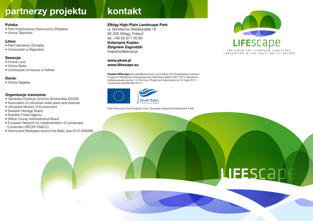 partnerzy projektu kontakt Polska: Elbląg High-Plain Landscape Park ul. Bohaterów Westerplatte 18 82-300 Elbląg, Poland tel. +48 55 611 45 90 Katarzyna Kopiec Zbigniew Zagrodzki [email protected] • Park Krajobrazowy Wysoczyzny Elbląskiej • Gmina Tolkmicko Litwa: • Park Narodowy Žemajtija • Uniwersytet w Kłajpedzie Szwecja: • Gmina Lund • Gmina Sjobo • Uniwersytet Linneusza w Kalmar Dania: • Gmina Slagelse www.pkwe.pl www.lifescape.eu Projekt LIFEscape jest współfinansowany ze środków Unii Europejskiej w ramach Programu Współpracy Transgranicznej Południowy Bałtyk 2007-2013. Wysokość dofinansowania wynosi 1,4 mln Euro. Projekt jest realizowany od 12 maja 2011 r. i potrwa do października 2013 r. Organizacje zrzeszone: • Generalna Dyrekcja Ochrony Środowiska (GDOŚ) • Association of Lithuanian state parks and reserves • Lithuanian Ministry of Environment • Swedish Heritage Board • Swedish Forest Agency • Skåne County Administrative Board • European Network for Implementation of Landscape Convention (RECEP-ENELC) • Visions and Strategies around the Baltic Sea 2010 (VASAB) Part-financed by the European Union, European Regional Development Fund Europejska Konwencja Krajobrazowa (EKK) została przyjęta we Florencji w 2000 roku i weszła w życie w roku 2004. 27 krajów, wśród nich Polska. Litwa, Szwecja i Dania zobowiązało się do wprowadzenia w swoim prawie zapisów dotyczących ochrony krajobrazu i promowania międzynarodowej współpracy w tej dziedzinie. Niestety do dziś zbyt mało z tych postulatów zostało zrealizowanych. COUNCIL OF EUROPE CONSEIL DE L'EUROPE EUROPEAN LANDSCAPE CONVENTION CONVENTION EUROPÉNNE DU PAYSAGE Degradacja naturalnych i kulturowych krajobrazów postępuje wszędzie w Europie. Fragmentacja krajobrazu, niewłaściwe zarządzanie przestrzenią, oraz chaotyczna i pozbawiona stylu zabudowa są szeroko rozpowszechnione, podczas gdy świadomość społeczna konieczności ochrony krajobrazu jest na ogół niska. Niektóre kraje rozwinęły jednak bardziej efektywne formy planowania przestrzennego i zarządzania krajobrazem niż inne. Projekt LIFEscape łączy siły specjalistów planowania przestrzennego - teoretyków i praktyków z Polski, Litwy, Szwecji i Danii dla wymiany doświadczeń i wypracowania innowacyjnych rozwiązań dla zarządzania krajobrazem w każdym z regionów. Z doświadczeń zachodnioeuropejskich wiadomo że podstawą dla skutecznej ochrony krajobrazu jest uczestnictwo społeczne. W ramach projektu LIFEscape wszyscy użytkownicy przestrzeni danego obszaru: właściciele ziemscy, instytucje publiczne, przedsiębiorcy, deweloperzy, organizacje pozarządowe i młodzi ludzie zostaną aktywnie włączeni w proces bieżącego planowania przestrzennego swojej gminy. Stopniowo będzie się zwiększać ich świadomość problemów krajobrazowych i zrozumienie dla podejmowanych działań, co wpłynie korzystnie na efektywność ochrony krajobrazu. Międzynarodowa wymiana doświadczeń i współpraca: Każdy z krajów jest na innym poziomie wdrażania EKK. Z tego powodu profesjonalna wymiana i ponadgraniczna współpraca krajów partnerskich jest wskazana dla przenoszenia i adaptowania dobrych praktyk z kraju do kraju. W ten sposób zaczną być generowane oddolne inicjatywy, które mogą przyczynić się do zmiany ustawodawstwa w danym kraju. Celem projektu LIFEscape jest przyspieszenie wdrażania Europejskiej Konwencji Krajobrazowej w uczestniczących krajach, poprzez wypracowanie innowacyjnych rozwiązań dla planowania przestrzennego z udziałem społecznym. główne wyniki projektu • Podręcznik narzędzi i metod planowania krajobrazu, opierający się na postulatach EKK jak również międzynarodowych przykładach dobrych praktyk. Znajdą się tam nowoczesne narzędzia wizualizcje przestrzenne oraz metody współpracy z użytkownikami społecznymi. • Nowe lub zaktualizowane lokalne plany zagospodarowania przestrzennego lub strategie zarządzania uwzględniające wartości krajobrazu. • Intensywna kampania podnosząca świadomość problematyki i wartości krajobrazu. Jej elementami będą: transmisje w mediach, działania ukierunkowane na dzieci i młodzież, wizyty studyjne na obszarach pilotażowych w krajach partnerskich, wydarzenia społeczne takie jak: plenery malarsko-fotograficzne, strona internetowa projektu. • Południowobałtyckie Forum Krajobrazowe - międzynarodowe ciało służące współpracy i wymianie pomysłów. • Zalecenia legislacyjne będą wnoszone do ministerstw odpowiadających za planowanie przestrzenne i ochronę środowiska w poszczególnych krajach. lokalne działania Projekt LIFEscape ma wydźwięk zdecydowanie praktyczny. Z tego powodu wybrane zostały cztery obszary pilotażowe, gdzie znajdą zastosowanie wypracowane w projekcie metody. Partnerzy projektu przy udziale specjalistów oraz społeczności lokalnych (Lokalne Grupy Działania) będą współpracowali na rzecz rozwiązania konkretnych problemów krajobrazowych. Obszar pilotażowy 1: Gmina Tolkmicko, województwo Warmińsko Mazurskie, Polska Gmina Tolkmicko, obejmująca najcenniejszą część Parku Krajobrazowego Wysoczyzny Elbląskiej leży nad Zalewem Wiślanym. Maksymalna różnica wysokości sięga tu prawie 200m wznosząc niemal bezpośrednio od brzegu zalewu. Bogactwem tego terenu są malownicze otwarte panoramy, piękne lasy i charakterystyczne ceglane budownictwo. Największym zagrożeniem jest dla nich postępująca rozproszona zabudowa. W ramach projektu stworzony będzie dla części tego obszaru pilotażowego nowy plan zagospodarowania przestrzennego, który uwzględni ochronę najbardziej wartościowych krajobrazów. Plan tworzony i realizowany będzie we współpracy ze społecznością lokalną. Obszar pilotażowy 3: Vombsänkan, Skane, Sweden Dolina rzeki Klingaväl jest cennym w skali europejskim obszarem bioróżnorodności oraz unikalnego krajobrazu. W ramach LIFEscape dwie gminy