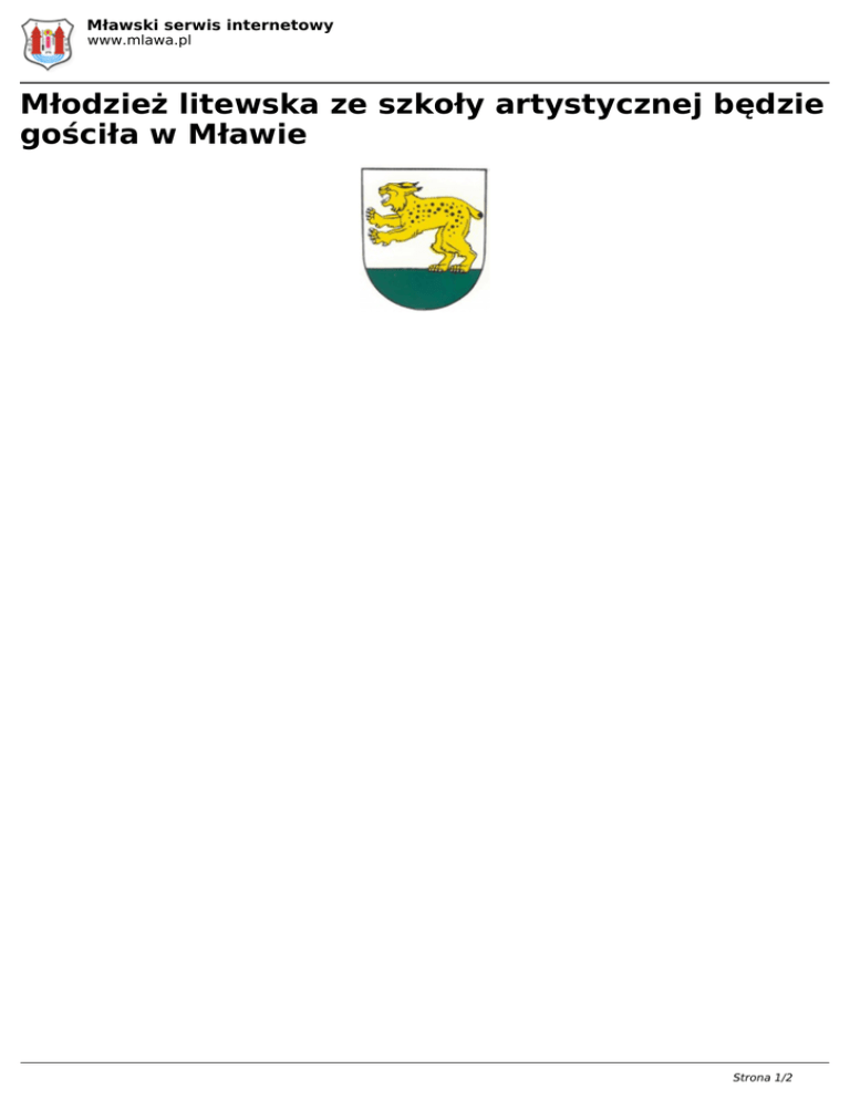 Mławski serwis internetowy www.mlawa.pl Młodzież litewska ze szkoły artystycznej będzie gościła w Mławie Strona 1/2 Mławski serwis internetowy www.mlawa.pl Od czwartku, 29 września w Mławie będzie gościła delegacja z Artystycznej Szkoły Miasta Raseiniai z Litwy. Wizyta potrwa do niedzieli, 2 października. Gospodarzami wizyty są Burmistrz Miasta Mława, Sławomir Kowalewski oraz Dyrektor Państwowej Szkoły Muzycznej I i II st. w Mławie, Wilhelm Taraszkiewicz. Głównym celem wizyty jest podpisanie umowy o współpracy pomiędzy szkołami muzycznymi w Raseiniai i w Mławie. W piątek, 30 września o godz. 17.00 w sali koncertowej PSM, specjalnie dla mieszkańców naszego miasta, koncert utworów kameralnych w wykonaniu uczniów i nauczycieli Artystycznej Szkoły Miasta Raseiniai. ZAPRASZAMY! MAGIA MUZYKI Arystyczna Szkoła Miasta Raseiniai (REPUBLIKA LITEWSKA), Państwowa Szkoła Muzyczna I i II st. w Mławie oraz Burmistrz Miasta Mława serdecznie zapraszają na koncert utworów kameralnych w wykonaniu uczniów i nauczycieli Artystycznej Szkoły Miasta Raseiniai. Koncert odbędzie się w piątek, 30 września o godzinie 17.00 w sali koncertowej PSM, ul. Sienkiewicza 24. PROGRAM KONCERTU Leonid Moisejenko „Wesoły marsz"Darius Daknys „Walc doliny" - zespół instrumentalny pod kierunkiem Jolanta Turčinskienė l Litewska piosenka ludowa „Płynie kaczka", solista Emilia Bagdonaitė, nauczycielka Stanislava Vežbavičienė l Wilhelm Friedemann Bach „Wiosna" l Audrius Germanavičius „Pieśnia" - wykonają siostry Lyja ir Vėja Germanavičiūtės; nauczyciele Jolanta Turčinskienė i Laisvida Juodytė l „Węgierski Taniec" - Johannesa Brahmsa - Mindaugas Žiukas; nauczyciel Zita Žemaitienė; l Ludowa piosenka litewska „Jak piękny piękny" -zaśpiewają siostry Lyja i Veja Germanavičiūtės, przygotowane przez Audrius Germanavičius l Bill Ready – „Trzy ślepe myszy" l Alek Rouli – „W kraju krasnoludów", duet fortepianowy Evelina Dubauskaitė i Paulina Veličkaitė, nauczyciel Džiuljeta Banienė l Aleksandr Derbenko „Rok Toccata", Mindaugas Žiukas, nauczyciel Zita Žemaitienė l Mikalojus Novikas „Šliady", zaśpiewa Emilija Bagdonaitė, nauczycielka Stanislava Vežbavičienė l Fragmenty „Etiudy" Fryderyka Chopina zagrają nauczyciele - Jolanta Turčinskienė i Saulė Krečkauskienė l Jarosław Cechanovič „Pierwsza Miłość", zaśpiewa Emilia Bagdonaitė, nauczyciel Stanislava Vežbavičienė l Diana Moisejenkaitė „Navatna polka" l Ludowa piosenka litewska „Zašpiewami siedząc" l Rolf Lovland „Tajemniczy sad" zagra trio instrumentalne nauczycieli - Jolanta Turčinskienė, Vaidas Dabžanskis i Saulė Krečkauskienė l Michael Giachino. „Rzeczy, których opracowaliśmy...", muzyka z filmu animowanego „Up" l Daniel Nash - „Wariacje", wykonywane przez zespół instrumentalny pod kierunkiem Jolanta Turčinskienė l Koncert będą prowadzili aktorzy teatru „Svajoklis (Marzeniec)": Simonas Batavičius, Agnetha Daniela Maslauskaitė, Wiktoria Bendžiūtė Reżyser programu - Pan Akvilė Damašauskaitė Dyrektor koncertu - Pani Albina Damašauskienė Tłumacz delegacji – Pan Benediktas Siliūnas Strona 2/2