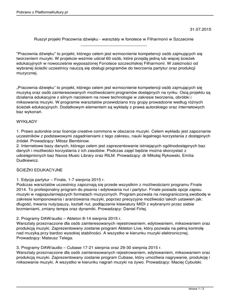 Pobrano z PlatformaKultury.pl 31.07.2015 Ruszył projekt Pracownia dźwięku - warsztaty w fonotece w Filharmonii w Szczecinie ____________________________ "Pracownia dźwięku" to projekt, którego celem jest wzmocnienie kompetencji osób zajmujących się tworzeniem muzyki. W projekcie weźmie udział 60 osób, które przejdą jedną lub więcej ścieżek edukacyjnych w nowocześnie wyposażonej Fonotece szczecińskiej Filharmonii. W zależności od wybranej ścieżki uczestnicy nauczą się obsługi programów do tworzenia partytur oraz produkcji muzycznej. „Pracownia dźwięku” to projekt, którego celem jest wzmocnienie kompetencji osób zajmujących się muzyką oraz osób zainteresowanych możliwościami programów dostępnych na rynku. Osią projektu są działania edukacyjne z silnym naciskiem na nowe technologie w zakresie tworzenia, obróbki i miksowania muzyki. W programie warsztatów przewidziano trzy grupy prowadzone według różnych ścieżek edukacyjnych. Dodatkowym elementem są wykłady z prawa autorskiego oraz internetowych baz wykonań. WYKŁADY 1. Prawo autorskie oraz licencje creative commons w obszarze muzyki. Celem wykładu jest zapoznanie uczestników z podstawowymi zagadnieniami z tego zakresu, nauki legalnego korzystania z dostępnych źródeł. Prowadzący: Miłosz Bembinow. 2. Internetowe bazy danych, którego celem jest zaprezentowanie istniejących ogólnodostępnych baz danych i możliwości korzystania z ich zasobów. Podczas zajęć będzie można skorzystać z udostępnionych baz Naxos Music Library oraz RILM. Prowadzący: dr Mikołaj Rykowski, Emilia Dudkiewicz. ŚCIEŻKI EDUKACYJNE 1. Edycja partytur – Finale, 1-7 sierpnia 2015 r. Podczas warsztatów uczestnicy zapoznają się przede wszystkim z możliwościami programu Finale 2014. To profesjonalny program do pisania i edytowania nut i partytur. Finale posiada opcje zapisu muzyki w najpopularniejszych formatach muzycznych. Program pozwala na nieograniczoną swobodę w zakresie komponowania i aranżowania muzyki, poprzez precyzyjne możliwości takich ustawień jak: długość, trwania nuty/pauzy, kształt nut, podłączenie klawiatury MIDI z wybranymi przez siebie brzmieniami, zmiany tempa oraz dynamiki. Prowadzący: Daniel Firlej. 2. Programy DAW/audio – Ableton 8-14 sierpnia 2015 r. Warsztaty przeznaczone dla osób zainteresowanych rejestrowaniem, edytowaniem, miksowaniem oraz produkcją muzyki. Zaprezentowany zostanie program Ableton Live, który pozwala na pełną kontrolę nad muzyką przy bardzo wysokiej stabilności. A wszystko w kierunku muzyki elektronicznej. Prowadzący: Mateusz Telega. 3. Programy DAW/audio – Cubase 17-21 sierpnia oraz 29-30 sierpnia 2015 r. Warsztaty przeznaczone dla osób zainteresowanych rejestrowaniem, edytowaniem, miksowaniem oraz produkcją muzyki. Zaprezentowany zostanie program Cubase, który umożliwia nagrywanie, produkcję i miksowanie muzyki. A wszystko w kierunku nagrań muzyki na żywo. Prowadzący: Maciej Cybulski. strona 1 / 2 Pobrano z PlatformaKultury.pl Zapisy: W celu wzięcia udziału w Projekcie, należy wypełnić formularz dostępny na stronie internetowej filharmonia.szczecin.pl oraz przesłać go drogą elektroniczną do dnia 20.07.2015 r. Regulamin strona 2 / 2