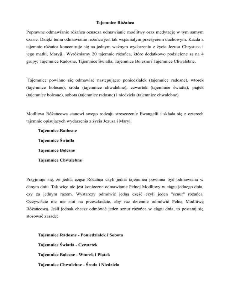 Tajemnice Różańca Poprawne odmawianie różańca oznacza odmawianie modlitwy oraz medytację w tym samym czasie. Dzięki temu odmawianie różańca jest tak wspaniałym przeżyciem duchowym. Każda z tajemnic różańca koncentruje się na jednym ważnym wydarzeniu z życia Jezusa Chrystusa i jego matki, Maryji. Wyróżniamy 20 tajemnic różańca, które dodatkowo podzielone są na 4 grupy: Tajemnice Radosne, Tajemnice Światła, Tajemnice Bolesne i Tajemnice Chwalebne. Tajemnice powinno się odmawiać następująco: poniedziałek (tajemnice radosne), wtorek (tajemnice bolesne), środa (tajemnice chwalebne), czwartek (tajemnice światła), piątek (tajemnice bolesne), sobota (tajemnice radosne) i niedziela (tajemnice chwalebne). Modlitwa Różańcowa stanowi swego rodzaju streszczenie Ewangelii i składa się z czterech tajemnic opisujących wydarzenia z życia Jezusa i Maryi. Tajemnice Radosne Tajemnice Światła Tajemnice Bolesne Tajemnice Chwalebne Przyjmuje się, że jedna część Różańca czyli jedna tajemnica powinna być odmawiana w danym dniu. Tak więc nie jest konieczne odmawianie Pełnej Modlitwy w ciągu jednego dnia, czy za jednym razem. Wystarczy odmówić jedną część czyli jeden "sznur" różańca. Oczywiście nic nie stoi na przeszkodzie, aby raz dziennie odmówić Pełną Modlitwę Różańcową. Jeśli jednak chcesz odmówić jeden sznur różańca w ciągu dnia, to postaraj się stosować zasadę: Tajemnice Radosne - Poniedziałek i Sobota Tajemnice Światła - Czwartek Tajemnice Bolesne - Wtorek i Piątek Tajemnice Chwalebne - Środa i Niedziela Tajemnice Różańca ... Każda z czterech części Pełnej Modlitwy Różańcowej składa się z 5 Tajemnic : Tajemnica Radosna Poniedziałek i Sobota 1. Zwiastowanie Maryi, iż jest matką Syna Bożego. 2. Nawiedzenie świętej Elżbiety. 3. Narodzenie Pana Jezusa. 4. Ofiarowanie Jezusa w świątyni. 5. Odnalezienie Pana Jezusa wśród uczonych w świątyni. Tajemnica Światła Czwartek 1. Chrzest Pana Jezusa w Jordanie. 2. Objawienie Siebie na weselu w Kanie. 3. Głoszenie Królestwa Bożego i wzywanie do nawrócenia. 4. Przemienienie na górze Tabor. 5. Ustanowienie Eucharystii. Tajemnica Bolesna Wtorek i Piątek 1. Modlitwa Pana Jezusa w Ogrodzie Oliwnym (Ogrójcu). 2. Biczowanie Pana Jezusa. 3. Ukoronowanie koroną z cierni. 4. Dźwiganie krzyża przez Pana Jezusa. 5. Śmierć na krzyżu. Tajemnica Chwalebna Środa i Niedziela 1. Zmartwychwstanie Pana Jezusa. 2. Wniebowstąpienie Pana Jezusa. 3. Zesłanie Ducha Świętego. 4. Wniebowzięcie Maryi. 5. Ukoronowanie Maryi na Królową Nieba i Ziemi. Każda z 5 tajemnic w danej części odpowiada jednej dziesiątce Różańca. Dziesiątka Różańca - 10 razy Zdrowaś Maryjo ...