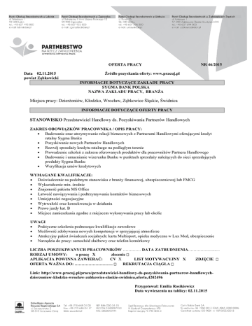 OFERTA PRACY Data 02.11.2015 powiat Ząbkowicki NR 46/2015 Źródło pozyskania oferty: www.pracuj.pl INFORMACJE DOTYCZĄCE ZAKŁADU PRACY SYGMA BANK POLSKA NAZWA ZAKŁADU PRACY, BRANŻA Miejsca pracy: Dzierżoniów, Kłodzko, Wrocław, Ząbkowice Śląskie, Świdnica INFORMACJE DOTYCZĄCE OFERTY PRACY STANOWISKO Przedstawiciel Handlowy ds. Pozyskiwania Partnerów Handlowych ZAKRES OBOWIĄZKÓW PRACOWNIKA / OPIS PRACY: Budowanie oraz utrzymywanie relacji biznesowych z Partnerami Handlowymi oferującymi kredyt ratalny Sygma Banku Pozyskiwanie nowych Partnerów Handlowych Rozwój sprzedaży kredytu ratalnego na podległym terenie Prowadzenie szkoleń z zakresu oferowanych produktów dla pracowników Partnera Handlowego Budowanie i umacnianie wizerunku Banku w punktach sprzedaży należących do sieci sprzedających produkty Sygma Banku Weryfikacja umów kredytowych WYMAGANE KWALIFIKACJE: Doświadczenie na podobnym stanowisku z branży finansowej, ubezpieczeniowej lub FMCG Wykształcenie min. średnie Znajomość pakietu MS Office Łatwość nawiązywania i podtrzymywania kontaktów biznesowych Umiejętności negocjacyjne Wytrwałość oraz konsekwencja w działaniu Prawo jazdy kat. B Miejsce zamieszkania zgodne z miejscem wykonywania pracy lub okolic UWAGI Praktyczne szkolenia podnoszące kwalifikacje zawodowe Możliwość zdobywania nowych kompetencji w sprzyjającej atmosferze Atrakcyjny pakiet świadczeń socjalnych: karta Multisport, opieka medyczna w Lux Med, ubezpieczenie Narzędzia do pracy: samochód służbowy oraz telefon komórkowy LICZBA POSZUKIWANYCH PRACOWNIKÓW …….…… DATA ZATRUDNIENIA………………..… RODZAJ UMOWY: o pracę X zlecenie APLIKACJA POWINNA ZAWIERAĆ: CV X LIST MOTYWACYJNY X ZDJĘCIE OFERTA WAŻNA DO: ……………………… REKRUTACJA CIĄGŁA Link: http://www.pracuj.pl/praca/przedstawiciel-handlowy-ds-pozyskiwania-partnerow-handlowychdzierzoniow-klodzko-wroclaw-zabkowice-slaskie-swidnica,oferta,4202496 Przygotował: Emilia Rosikiewicz Data wywieszenia na tablicy: 02.11.2015