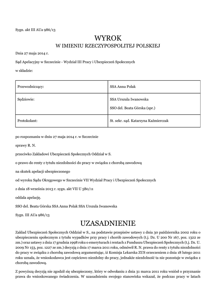 Sygn. akt III AUa 986/13 WYROK W IMIENIU RZECZYPOSPOLITEJ POLSKIEJ Dnia 27 maja 2014 r. Sąd Apelacyjny w Szczecinie - Wydział III Pracy i Ubezpieczeń Społecznych w składzie: Przewodniczący: SSA Anna Polak Sędziowie: SSA Urszula Iwanowska SSO del. Beata Górska (spr.) Protokolant: St. sekr. sąd. Katarzyna Kaźmierczak po rozpoznaniu w dniu 27 maja 2014 r. w Szczecinie sprawy R. N. przeciwko Zakładowi Ubezpieczeń Społecznych Oddział w S. o prawo do renty z tytułu niezdolności do pracy w związku z chorobą zawodową na skutek apelacji ubezpieczonego od wyroku Sądu Okręgowego w Szczecinie VII Wydział Pracy i Ubezpieczeń Społecznych z dnia 18 września 2013 r. sygn. akt VII U 580/11 oddala apelację. SSO del. Beata Górska SSA Anna Polak SSA Urszula Iwanowska Sygn. III AUa 986/13 UZASADNIENIE Zakład Ubezpieczeń Społecznych Oddział w S., na podstawie przepisów ustawy z dnia 30 października 2002 roku o ubezpieczeniu społecznym z tytułu wypadków przy pracy i chorób zawodowych (t.j. Dz. U 200 Nr 167, poz. 1322 ze zm.) oraz ustawy z dnia 17 grudnia 1998 roku o emeryturach i rentach z Funduszu Ubezpieczeń Społecznych (t.j. Dz. U. 2009 Nr 153, poz. 1227 ze zm.) decyzją z dnia 17 marca 2011 roku, odmówił R. N. prawa do renty z tytułu niezdolności do pracy w związku z chorobą zawodową argumentując, iż Komisja Lekarska ZUS orzeczeniem z dnia 18 lutego 2011 roku uznała, że wnioskodawca jest częściowo niezdolny do pracy, jednakże niezdolność ta nie pozostaje w związku z chorobą zawodową. Z powyższą decyzją nie zgodził się ubezpieczony, który w odwołaniu z dnia 31 marca 2011 roku wniósł o przyznanie prawa do wnioskowanego świadczenia. W uzasadnieniu swojego stanowiska wskazał, że podczas pracy w latach 1971-1999 miał kontakt z azbestem, co spowodowało powstanie u niego choroby zawodowej w postaci choroby opłucnej lub osierdzia wywołane pyłem azbestu-rozległe zgrubienia opłucnej. Dalej powód wskazał, że w świetle powyższego orzeczenia, orzeczenie lekarza orzecznika ZUS nie uwzględnia rzeczywistego stanu jego zdrowia. W odpowiedzi na odwołanie pozwany organ rentowy wniósł o jego oddalenie w całości, podtrzymując argumentację, jak w uzasadnieniu zaskarżonej decyzji. Wyrokiem z dnia 18 września 2013r. Sąd Okręgowy w Szczecinie VII Wydział Pracy i Ubezpieczeń Społecznych oddalił odwołanie. Sąd Okręgowy ustalił i zważył, co następuje: R. N. urodził się (...). Orzeczeniem Wojewódzkiego Ośrodka Medycyny Pracy (...) Centrum (...) w S. z 24 września 2010 roku, rozpoznano u wnioskodawcy chorobę zawodową – choroby opłucnej lub osierdzia wywołane pyłem azbestu – rozległe zgrubienia opłucnej. Orzeczeniem z dnia 20 stycznia 2011 roku Komisja Lekarska ZUS ustaliła u wnioskodawczyni stały uszczerbek na zdrowiu w wysokości 15 %, spowodowany skutkami choroby zawodowej. Aktualnie u wnioskodawcy rozpoznaje się: - cukrzycę typu 2 niewyrównaną, - chorobę wieńcową stabilną II wg CCS, - nadciśnienie tętnicze II wg WHO, - utrwalone migotanie przedsionków, - otyłość BMI=38,5kg/m2, - żylaki podudzi, - marskość wątroby w okresie początkowym, - zgrubienia opłucnej wywołane pyłami azbestu jako choroba zawodowa w wywiadzie. Ubezpieczony R. N. jest częściowo i trwale niezdolny do pracy z przyczyn internistycznych. Rozpoznana u wnioskodawcy choroba zawodowa – zgrubienia opłucnej wywołane kontaktem z azbestem - nie jest przyczyną niezdolności ubezpieczonego do pracy. Odwołanie wnioskodawcy R. N., stanowiące przedmiot niniejszego rozpoznania, w ocenie Sądu Okręgowego nie zasługiwało na uwzględnienie. Zgodnie z dyspozycją art. 6 ust. 1 pkt 6 ustawy z dnia 30 października 2002 roku o ubezpieczeniu społecznym z tytułu wypadków przy pracy i chorób zawodowych (Dz. U. 2002 r. nr 199, poz. 1673), ubezpieczonemu, który stał się niezdolny do pracy wskutek wypadku przy pracy lub choroby zawodowej przysługuje renta z tytułu niezdolności do pracy. Z kolei art. 17 ust 1 powołanej ustawy statuuje, iż przy ustalaniu prawa do renty z tytułu niezdolności do pracy powstałej w warunkach, o których mowa powyżej stosuje się odpowiednio przepisy ustawy z dnia 17 grudnia 1998 roku o emeryturach i rentach z Funduszu Ubezpieczeń Społecznych (Dz. U. 2009 r. Nr 153, poz. 1227 ze zm.).Renta z tytułu niezdolności do pracy przysługuje niezależnie od długości okresu ubezpieczenia wypadkowego oraz bez względu na datę powstania niezdolności do pracy spowodowanej chorobą zawodową (art. 17 ust. 2 ustawy wypadkowej). Za chorobę zawodową uważa się chorobę określoną w wykazie chorób zawodowych, o którym mowa w art. 237 § 1 pkt 2 Kodeksu pracy, jeżeli została spowodowana działaniem czynników szkodliwych dla zdrowia występujących w środowisku pracy lub sposobem wykonywania pracy (art. 4) Przedmiotowy wykaz zawarty został w Rozporządzeniu Rady Ministrów z dnia 30 lipca 2002 roku w sprawie wykazu chorób zawodowych, szczegółowych zasad postępowania w sprawach zgłaszania podejrzenia, rozpoznawania i stwierdzana chorób zawodowych oraz podmiotów właściwych w tych sprawach (Dz. U. 2002 r. nr 132 poz. 1115). Wskazane rozporządzenie pod pozycją 4 (choroby opłucnej lub osierdzia wywołane pyłem azbestu) pkt 1 wykazu wskazuje – jako chorobę zawodową – rozległe zgrubienia opłucnej. Sąd Okręgowy podkreślił, że z przywołanych przepisów wynika, że aby otrzymać rentę z tytułu niezdolności do pracy, osoba ubiegająca się o to świadczenie musi być osobą niezdolną do pracy w związku z występowaniem u niej schorzenia spowodowanego chorobą zawodową. W myśl art. 57 ustawy emerytalno – rentowej, renta z tytułu niezdolności do pracy przysługuje ubezpieczonemu, który spełnił łącznie następujące przesłanki : 1. jest niezdolny do pracy 2. ma wymagany okres składkowy i nieskładkowy 3.niezdolność do pracy powstała w okresie składkowym lub nies
