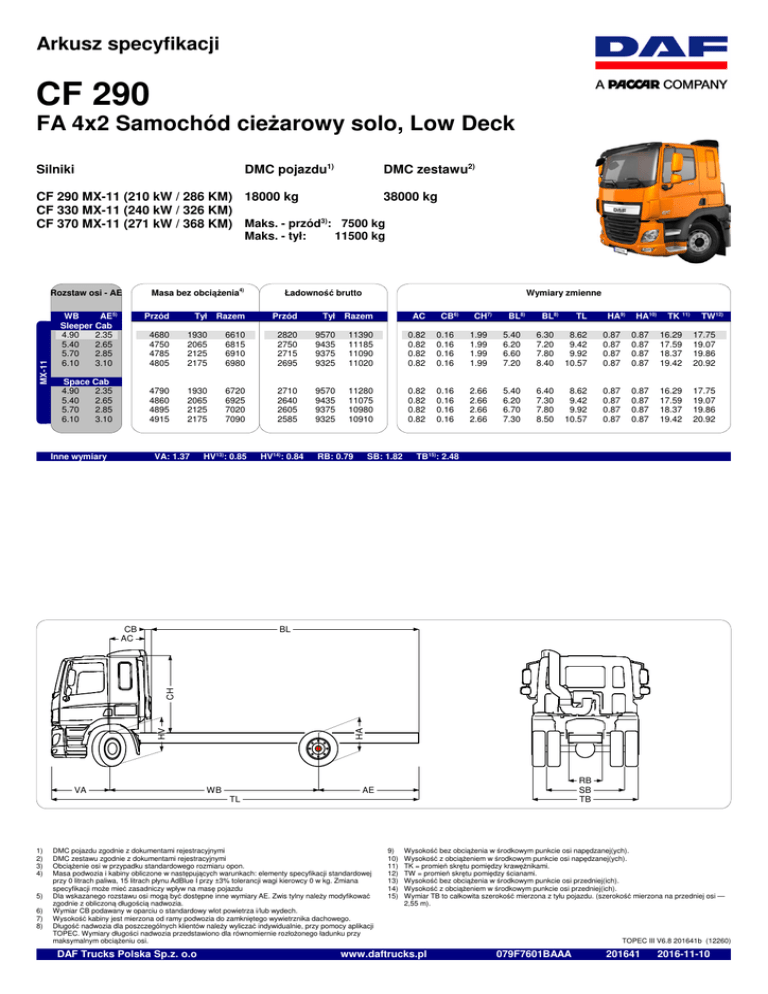 Arkusz specyfikacji CF 290 FA 4x2 Samochód cieżarowy solo, Low Deck DMC pojazdu1) Silniki DMC zestawu2) CF 290 MX-11 (210 kW / 286 KM) 18000 kg 38000 kg CF 330 MX-11 (240 kW / 326 KM) CF 370 MX-11 (271 kW / 368 KM) Maks. - przód3): 7500 kg Maks. - tył: MX-11 Rozstaw osi - AE WB AE5) Sleeper Cab 4.90 2.35 5.40 2.65 5.70 2.85 6.10 3.10 Masa bez obciążenia4) Przód Space Cab 4.90 2.35 5.40 2.65 5.70 2.85 6.10 3.10 Inne wymiary Tył Razem 11500 kg Ładowność brutto Przód Wymiary zmienne Tył Razem AC CB6) CH7) BL8) BL8) TL HA9) HA10) TK 11) TW12) 4680 4750 4785 4805 1930 2065 2125 2175 6610 6815 6910 6980 2820 2750 2715 2695 9570 9435 9375 9325 11390 11185 11090 11020 0.82 0.82 0.82 0.82 0.16 0.16 0.16 0.16 1.99 1.99 1.99 1.99 5.40 6.20 6.60 7.20 6.30 7.20 7.80 8.40 8.62 9.42 9.92 10.57 0.87 0.87 0.87 0.87 0.87 0.87 0.87 0.87 16.29 17.59 18.37 19.42 17.75 19.07 19.86 20.92 4790 4860 4895 4915 1930 2065 2125 2175 6720 6925 7020 7090 2710 2640 2605 2585 9570 9435 9375 9325 11280 11075 10980 10910 0.82 0.82 0.82 0.82 0.16 0.16 0.16 0.16 2.66 2.66 2.66 2.66 5.40 6.20 6.70 7.30 6.40 7.30 7.80 8.50 8.62 9.42 9.92 10.57 0.87 0.87 0.87 0.87 0.87 0.87 0.87 0.87 16.29 17.59 18.37 19.42 17.75 19.07 19.86 20.92 VA: 1.37 HV13): 0.85 RB: 0.79 SB: 1.82 TB15): 2.48 BL VA HA HV CH CB AC HV14): 0.84 WB RB SB TB AE TL 1) 2) 3) 4) 5) 6) 7) 8) DMC pojazdu zgodnie z dokumentami rejestracyjnymi DMC zestawu zgodnie z dokumentami rejestracyjnymi Obciążenie osi w przypadku standardowego rozmiaru opon. Masa podwozia i kabiny obliczone w następujących warunkach: elementy specyfikacji standardowej przy 0 litrach paliwa, 15 litrach płynu AdBlue I przy ±3% tolerancji wagi kierowcy 0 w kg. Zmiana specyfikacji może mieć zasadniczy wpływ na masę pojazdu Dla wskazanego rozstawu osi mogą być dostępne inne wymiary AE. Zwis tylny należy modyfikować zgodnie z obliczoną długością nadwozia. Wymiar CB podawany w oparciu o standardowy wlot powietrza i/lub wydech. Wysokość kabiny jest mierzona od ramy podwozia do zamkniętego wywietrznika dachowego. Długość nadwozia dla poszczególnych klientów należy wyliczać indywidualnie, przy pomocy aplikacji TOPEC. Wymiary długości nadwozia przedstawiono dla równomiernie rozłożonego ładunku przy maksymalnym obciążeniu osi. DAF Trucks Polska Sp.z. o.o 9) 10) 11) 12) 13) 14) 15) Wysokość bez obciążenia w środkowym punkcie osi napędzanej(ych). Wysokość z obciążeniem w środkowym punkcie osi napędzanej(ych). TK = promień skrętu pomiędzy krawężnikami. TW = promień skrętu pomiędzy ścianami. Wysokość bez obciążenia w środkowym punkcie osi przedniej(ich). Wysokość z obciążeniem w środkowym punkcie osi przedniej(ich). Wymiar TB to całkowita szerokość mierzona z tyłu pojazdu. (szerokość mierzona na przedniej osi — 2,55 m). www.daftrucks.pl TOPEC III V6.8 201641b (12260) 079F7601BAAA 201641 2016-11-10 CF 290 FA 4x2 Samochód cieżarowy solo, Low Deck Kabina z zewnątrz Kabina Sleeper Cab ze zderzakiem z ocynkowanej stali, barwioną szybą oraz elektrycznie sterowanymi szybami bocznymi. Lusterka główne i szerokokątne ogrzewane elektrycznie. Szerokość kabiny 2300 mm; Lusterko przednie; Lusterka regulowane elektrycznie. Opcjonalnie: • Space Cab • Światła przeciwmgielne i reflektory • Pneum. zawiesz. kabiny dośw. zakręty • Reflektory przednie LED • Światła Skylights • Światła przeciwmgielne Aerodynamika Opcjonalnie: • Osłony boczne • RóŜne typy spoilerów dachowych i ich mocowania Układ hamulcowy Układ hamulcowy DAF. Opcjonalnie: • Hamulec silnikowy MX • Intarder ZF Podwozie Rozstaw osi 4,90 m / zwis tylny 2,35 m; Wysokość podłuŜnicy 260 mm; Standardowe umiejscowienie podzespołu; Aluminiowy zbiornik paliwa 450 l, wys. 505 mm; Chlapacz; Przednia osłona podwozia; Zbiornik płynu AdBlue o poj. 50 l po lewej str. Opcjonalnie: • RóŜne materiały i pojemności • Kosz koła zapasowego z prawej zbiorników paliwa strony Sprzęg i wyposażenie do podłączenia przyczepy Element zamykający. Opcjonalnie: • Wartość D poprzecznicy: D = 13,7 Nadwozia i przygotowania do nadwozi Złącze uŜytkowe z przodu kabiny. Kolory Kolor kabiny H3279 biały opalizujący; Panel reflekt. przedn. i zderzak: Brilliant White; Kolor podwozia szary. Opcjonalnie: • Panel reflekt. przedn. i zderzak: kolor • Szare osłony lusterek kabiny • Osłony lusterek w kolorze nadwozia • Panel reflekt. przedn. i zderzak: • Kolory kabiny i podwozia - patrz Stone Grey katalog kolorów Wnętrze kabiny Fotel kierowcy: Comfort Air; Fotel zmiennika: podstawowy; Aluminiowy wywietrznik dachowy, sterowanie ręczne; Klimatyzacja; Filtr przeciwpyłkowy. Opcjonalnie: • Kierownica, skóra, kolor czarny • Lodówka • Kierownica, skóra, kolor brązowa • RóŜne typy siedzeń kierowcy i miedź zmiennika Komunikacja i zarządzanie inf. dotyczącymi jazdy Tachograf cyfrowy, Stoneridge; Ustawienie ogranicznika prędkości 85 km/h; Anteny: AM/FM, 2x GSM, GPS; Tempomat adaptacyjny z FCW i AEBS. Opcjonalnie: • RóŜni producenci i typy wyposaŜenia • Tempomat Predictive Cruise Control audio • Tempomat Predictive Cruise Control • Telefon TruckPhone Lite Bezpieczeństwo i ochrona Układ ostrzegania o opuszczeniu pasa ruchu; Układ kontroli stabilności pojazdu (VSC); Podstawowy układ immobilizera silnika. Opcjonalnie: • Sygnał ostrzegawczy cofania • RóŜne klasy przepisów bezpieczeństwa EC-ADR Wał odbioru mocy (WOM) Opcjonalnie: • RóŜne typy "PTO"/ róŜne pozycje montaŜu Zasilanie elektryczne Alternator 80 A-akumul. 2x175 Ah. Opcjonalnie: • Alternator 120 A • Akumulatory 2x140Ah • Akumulatory 2x 230 Ah Masa całkowita pojazdu i masa całkowita zestawu Maks. tech. m. całk. poj. zal. od m. podw. 19,5át; Maks. DCM zestawu zal. od ukł. nap. 38át, kl. 2. Opcjonalnie: • Maks. DCM zest. zal. od ukł. nap. 40 000 kg, kl. 3 Warunki zastosowania Wlot powietrza na dachu kabiny. Opcjonalnie: • Tryb cichy