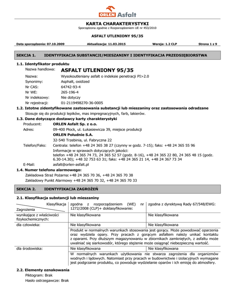 KARTA CHARAKTERYSTYKI Sporządzona zgodnie z Rozporządzeniem UE nr 453/2010 ASFALT UTLENIONY 95/35 Data sporządzenia: 07.10.2009 SEKCJA 1. Aktualizacja: 11.03.2015 Wersja: 1.2 CLP Strona 1 z 9 IDENTYFIKACJA SUBSTANCJI/MIESZANINY I IDENTYFIKACJA PRZEDSIĘBIORSTWA 1.1. Identyfikator produktu Nazwa handlowa: ASFALT UTLENIONY 95/35 Nazwa: Wysokoutleniany asfalt o indeksie penetracji PI>2.0 Synonimy: Asphalt, oxidized Nr CAS: 64742-93-4 Nr WE: 265-196-4 Nr indeksowy: Nie dotyczy Nr rejestracji: 01-2119498270-36-0005 1.2. Istotne zidentyfikowane zastosowania substancji lub mieszaniny oraz zastosowania odradzane Stosuje się do produkcji lepików, mas impregnacyjnych, farb, lakierów. 1.3. Dane dotyczące dostawcy karty charakterystyki Producent: ORLEN Asfalt Sp. z o.o. Adres: 09-400 Płock, ul. Łukasiewicza 39, miejsce produkcji ORLEN Południe S.A. 32-540 Trzebinia, ul. Fabryczna 22 Telefon/Faks: Centrala: telefon +48 24 365 38 27 (czynny w godz. 7-15); faks: +48 24 365 55 96 Informacje w sprawach dotyczących jakości: telefon +48 24 365 74 73, 24 365 52 57 (godz. 8-16), +48 24 365 22 80, 24 365 48 15 (godz. 6.30-14.30); +48 32 753 63 31; faks: +48 24 365 21 14, +48 24 367 73 34 E-Mail: [email protected] 1.4. Numer telefonu alarmowego: Zakładowa Straż Pożarna:+48 24 365 70 36, +48 24 365 70 38 Zakładowy Punkt Alarmowy +48 24 365 70 32, +48 24 365 70 33 SEKCJA 2. IDENTYFIKACJA ZAGROŻEŃ 2.1. Klasyfikacja substancji lub mieszaniny Klasyfikacja Zagrożenia zgodna z rozporządzeniem (WE) 1272/2008 (CLP)+ doklasyfikowanie: nr zgodna z dyrektywą Rady 67/548/EWG: wynikające z właściwości fizykochemicznych: Nie klasyfikowana Nie klasyfikowana dla człowieka: Nie klasyfikowana Nie klasyfikowana Produkt w normalnych warunkach stosowania jest gorący. Może powodować oparzenia oraz wydziela opary. Przy pracach z gorącym asfaltem należy unikać kontaktu z oparami. Przy dłuższym magazynowaniu w zbiornikach zamkniętych, z asfaltu może uwalniać się siarkowodór, którego stężenie może osiągnąć niebezpieczną wartość. dla środowiska: Nie klasyfikowana Nie klasyfikowana W normalnych warunkach użytkowania nie stwarza zagrożenia dla organizmów wodnych i lądowych. Natomiast przy pracach w budownictwie i izolacyjnych wymagane jest podgrzanie produktu, co powoduje wydzielanie oparów i ich emisję do atmosfery. 2.2. Elementy oznakowania Piktogram: Brak Hasło ostrzegawcze: Brak KARTA CHARAKTERYSTYKI Sporządzona zgodnie z Rozporządzeniem UE nr 453/2010 ASFALT UTLENIONY 95/35 Data sporządzenia: 07.10.2009 Aktualizacja: 11.03.2015 Wersja: 1.2 CLP Strona 2 z 9 Zwroty wskazujące rodzaj zagrożenia: Brak Zwroty wskazujące środki ostrożności: Brak 2.3. Inne zagrożenia Zgodnie z obowiązującym prawem, wysokoutleniany asfalt nie jest klasyfikowany jako niebezpieczny. Badania na zwierzętach wskazują, że powtarzająca się ekspozycja na jego opary może być czynnikiem rakotwórczym o słabym działaniu (patrz sekcja 11). SEKCJA 3. SKŁAD/INFORMACJA O SKŁADNIKACH 3.1. Substancje Nazwa substancji Wzór % wagowy Nr CAS Nr WE Nr indeksowy Asfalt utleniony Nie dotyczy 100 64742-93-4 265-196-4 Nie dotyczy Złożona substancja składająca się z ciężkiego destylatu próżniowego (tzw. fluksu) i pozostałości po destylacji próżniowej ropy naftowej, zawierająca związki węglowodorowe o dominującej zawartości atomów węgla powyżej C25, niewielkie ilości pierwiastków (S, N, O, metali) poddana utlenianiu za pomocą powietrza. SEKCJA 4. ŚRODKI PIERWSZEJ POMOCY 4.1. Opis środków pierwszej pomocy Wdychanie: Wynieść poszkodowanego na świeże powietrze, ułożyć w pozycji leżącej, rozluźnić odzież, jeżeli poszkodowany nie oddycha, zastosować sztuczne oddychanie; jeżeli nie stwierdza się czynności serca, zastosować zewnętrzny masaż serca w połączeniu ze sztucznym oddychaniem używając maseczki ratowniczej do sztucznego oddychania, okryć poszkodowanego, zapewnić spokój, nie podawać płynów osobie nieprzytomnej i przy zaburzeniach świadomości. Transport przeprowadzić w pozycji leżącej, bocznej. Kontakt ze skórą: Miejsce oparzenia schłodzić tak szybko jak to możliwe w celu ograniczenia wpływu ciepła na powstanie jeszcze poważniejszych zmian oparzeniowych. Miejsce oparzenia należy chłodzić bieżącą zimną wodą przez przynajmniej 10 minut. Należy przy tym unikać nadmiernego wychłodzenia ciała. Nie próbować usuwać asfaltu z obszaru oparzenia. Asfalt po schłodzeniu tworzy wodoodporną, jałową powłokę na oparzeniu, która zapobiega jego wysuszaniu. Zanieczyszczone ubranie można zdjąć pod warunkiem, że nie przywarło ono do skóry. Kontakt z oczami: Przemyć bieżącym i łagodnym strumieniem wody pitnej przez okres ok. 15 minut, przy odwiniętych powiekach, usunąć szkła kontaktowe, nie wycierać oczu, założyć jałowy, luźny opatrunek; oddać poszkodowanego pod opiekę okulisty. Połknięcie: Nie prowokować wymiotów, gdyż istnieje możliwość przedostania się produktu do dróg oddechowych. Nie podawać nic doustnie. Jeżeli nie nastąpi poprawa zapewnić pomoc medyczną. 4.2. Najważniejsze ostre i opóźnione objawy oraz skutki narażenia Nie określono. 4.3. Wskazania dotyczące wszelkiej natychmiastowej pomocy lekarskiej i szczególnego postępowania z poszkodowanym W razie przypadkowego kontaktu gorącego asfaltu ze skórą nie należy podejmować żadnej próby usuwania go. W każdym z wyżej podanych przypadków postępowania, gdy zaburzenia nie ustępują, należy natychmiast wezwać lekarza lub odwieźć poszkodowanego do szpitala, pokazać opakowanie produktu lub etykietę. SEKCJA 5. POSTĘPOWANIE W PRZYPADKU POŻARU 5.1. Środki gaśnicze Odpowiednie środki gaśnicze: Dwutlenek węgla, proszek gaśniczy, piana gaśnicza, piasek, rozproszone prądy wodne, para gaśnicza. Niewłaściwe środki gaśnicze: Nie stosować zwartych strumieni wody na powierzchnię stopionego KARTA CHARAKTERYSTYKI Sporządzona z