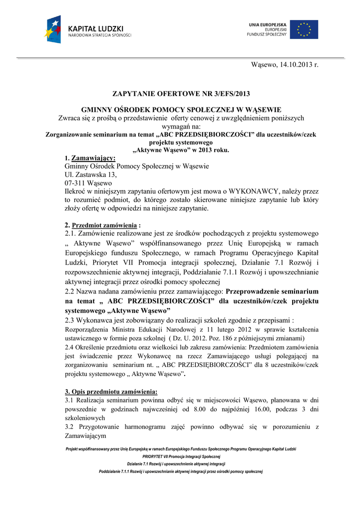 Wąsewo, 14.10.2013 r. ZAPYTANIE OFERTOWE NR 3/EFS/2013 GMINNY OŚRODEK POMOCY SPOŁECZNEJ W WĄSEWIE Zwraca się z prośbą o przedstawienie oferty cenowej z uwzględnieniem poniższych wymagań na: Zorganizowanie seminarium na temat „ABC PRZEDSIĘBIORCZOŚCI” dla uczestników/czek projektu systemowego „Aktywne Wąsewo” w 2013 roku. 1. Zamawiający: Gminny Ośrodek Pomocy Społecznej w Wąsewie Ul. Zastawska 13, 07-311 Wąsewo Ilekroć w niniejszym zapytaniu ofertowym jest mowa o WYKONAWCY, należy przez to rozumieć podmiot, do którego zostało skierowane niniejsze zapytanie lub który złoży ofertę w odpowiedzi na niniejsze zapytanie. 2. Przedmiot zamówienia : 2.1. Zamówienie realizowane jest ze środków pochodzących z projektu systemowego „ Aktywne Wąsewo” współfinansowanego przez Unię Europejską w ramach Europejskiego funduszu Społecznego, w ramach Programu Operacyjnego Kapitał Ludzki, Priorytet VII Promocja integracji społecznej, Działanie 7.1 Rozwój i rozpowszechnienie aktywnej integracji, Poddziałanie 7.1.1 Rozwój i upowszechnianie aktywnej integracji przez ośrodki pomocy społecznej 2.2 Nazwa nadana zamówieniu przez zamawiającego: Przeprowadzenie seminarium na temat „ ABC PRZEDSIĘBIORCZOŚCI” dla uczestników/czek projektu systemowego „Aktywne Wąsewo” 2.3 Wykonawca jest zobowiązany do realizacji szkoleń zgodnie z przepisami : Rozporządzenia Ministra Edukacji Narodowej z 11 lutego 2012 w sprawie kształcenia ustawicznego w formie poza szkolnej ( Dz. U. 2012. Poz. 186 z późniejszymi zmianami) 2.4 Określenie przedmiotu oraz wielkości lub zakresu zamówienia: Przedmiotem zamówienia jest świadczenie przez Wykonawcę na rzecz Zamawiającego usługi polegającej na zorganizowaniu seminarium nt. „ ABC PRZEDSIĘBIORCZOŚCI” dla 8 uczestników/czek projektu systemowego „ Aktywne Wąsewo”. 3. Opis przedmiotu zamówienia: 3.1 Realizacja seminarium powinna odbyć się w miejscowości Wąsewo, planowana w dni powszednie w godzinach najwcześniej od 8.00 do najpóźniej 16.00, podczas 3 dni szkoleniowych 3.2 Przygotowanie harmonogramu zajęć powinno odbywać się w porozumieniu z Zamawiającym Projekt współfinansowany przez Unię Europejską w ramach Europejskiego Funduszu Społecznego Programu Operacyjnego Kapitał Ludzki PRIORYTET VII Promocja Integracji Społecznej Działanie 7.1 Rozwój i upowszechnienie aktywnej integracji Poddziałanie 7.1.1 Rozwój i upowszechnianie aktywnej integracji przez ośrodki pomocy społecznej 3.3 Zapewnienie uczestnikom/czkom materiałów szkoleniowych oraz wszelkich pomocy dydaktycznych oznakowanych zgodnie z zasadami promocji projektów dla beneficjentów POKL 3.4 Oznakowanie pomieszczeń, w których jest realizowana usługa szkoleniowa zgodnie z zasadami promocji projektów dla beneficjentów POKL 3.5 Zapewnienie wyżywienia podczas seminarium (kawa, herbata, słodycze, posiłek ciepły powyżej 6 godzin trwania zajęć) 3.6 Przygotowanie i prowadzanie bieżącej dokumentacji zajęć ( listy obecności, dzienniki zajęć, harmonogram zajęć, pokwitowania odbioru zaświadczeń/certyfikatów/dyplomów, poczęstunku)-jeśli dotyczy 3.7 Po zakończeniu przekazanie Zamawiającemu certyfikatów potwierdzających udział uczestnika w kursie oraz wyniki ankiety oceniających seminarium. 3.8 Przedstawienie programu seminarium najpóźniej w dniu podpisania umowy. 3.9 Zapewnienie min. 18 h zajęć. 3.10 Ubezpieczenie odpowiedzialności cywilnej trwające minimum 12 miesięcy od dnia wszczęcia postępowania o zamówienie w zakresie świadczenia usług szkoleniowych 3.11 30% ceny kosztów seminarium na materiały i środki dydaktyczne 3. Termin realizacji zamówienia: Wykonawca zobowiązuje się wykonać usługę szkoleniową według harmonogramu ustalonego z Zamawiającym jednak nie później niż od 01.11.2013 r. do 30.11.2013 r. 4. Unieważnienie postępowania: Zamawiający unieważni postępowanie, jeżeli cena nadesłanych ofert znacznie przewyższy kwotę, którą zamawiający może przeznaczyć na sfinansowanie zamówienia. 5. Warunki udziału w postępowaniu oraz opis sposobu dokonywania oceny spełnienia tych warunków: 4.1. W postępowaniu mogą wziąć udział i złożyć ofertę Wykonawcy, którzy prowadzą działalność usługowa w przedmiotowym zakresie. 4.2. Wykaz osób, które będą uczestniczyć w wykonaniu zamówienia. 6. Kryterium oceny ofert: W przypadku złożenia ofert spełniających wszystkie warunki formalne i merytoryczne udziału przez więcej niż jednego wykonawcę Zamawiający dokona oceny ofert na podstawie poniżej przedstawionych kryteriów oceny ofert (ocena w oparciu o informacje zawarte w ofercie oraz załącznikach): - Najkorzystniejsza stawka brutto całej usługi -60% - Kwalifikacje -20% -Doświadczenie- 20% Projekt współfinansowany przez Unię Europejską w ramach Europejskiego Funduszu Społecznego Programu Operacyjnego Kapitał Ludzki PRIORYTET VII Promocja Integracji Społecznej Działanie 7.1 Rozwój i upowszechnienie aktywnej integracji Poddziałanie 7.1.1 Rozwój i upowszechnianie aktywnej integracji przez ośrodki pomocy społecznej Za najkorzystniejszą zostanie uznana oferta, która otrzyma najwyższą ocenę końcową. W przypadku, kiedy cena najkorzystniejszej oferty przekroczy wartość założoną przez Zamawiającego w budżecie projektu zamawiający umarza postępowanie. 7. Ofertę należy składać w terminie do 21 października 2013 r. w: biurze Projektu- Gminny Ośrodek Pomocy Społecznej Ul. Zastawska 13, 07-311 Wąsewo Budynek Urzędu Gminy pokój nr 2 drogą e-mailową: [email protected] faxem: 29 645 80 00 z dopiskiem: „ Oferta na zorganizowanie seminarium nt. „ A B C PRZEDSIĘBIORCZOŚCI” w ramach projektu systemowego „Aktywne Wąsewo”. 8. Dodatkowe informacje: 7.1 osobą upoważnioną do kontaktów z Oferentem jest: Pani Katarzyna Otwinowska, Tel. 29 645 80 00 wew. 32./kom.: 509-635-057 7.2 Zamawiający nie dopuszcza możliwoś