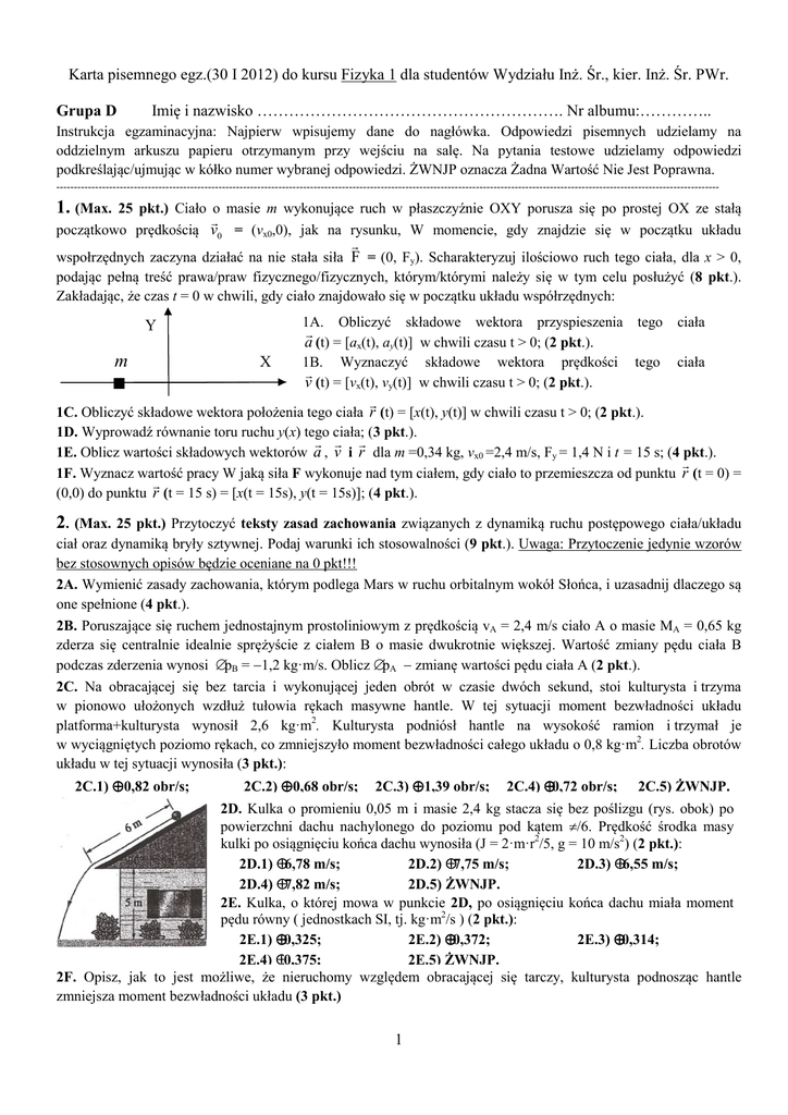 Karta pisemnego egz.(30 I 2012) do kursu Fizyka 1 dla studentów Wydziału Inż. Śr., kier. Inż. Śr. PWr. Grupa D Imię i nazwisko …………………………………………………. Nr albumu:………….. Instrukcja egzaminacyjna: Najpierw wpisujemy dane do nagłówka. Odpowiedzi pisemnych udzielamy na oddzielnym arkuszu papieru otrzymanym przy wejściu na salę. Na pytania testowe udzielamy odpowiedzi podkreślając/ujmując w kółko numer wybranej odpowiedzi. ŻWNJP oznacza Żadna Wartość Nie Jest Poprawna. -------------------------------------------------------------------------------------------------------------------------------------------------------------------------------------------- 1. (Max. 25 pkt.) Ciało o masie m wykonujące ruch w płaszczyźnie OXY porusza się po prostej OX ze stałą początkowo prędkością v0 = (vx0,0), jak na rysunku, W momencie, gdy znajdzie się w początku układu wspołrzędnych zaczyna działać na nie stała siła F = (0, Fy). Scharakteryzuj ilościowo ruch tego ciała, dla x > 0, podając pełną treść prawa/praw fizycznego/fizycznych, którym/którymi należy się w tym celu posłużyć (8 pkt.). Zakładając, że czas t = 0 w chwili, gdy ciało znajdowało się w początku układu współrzędnych: Y m X 1A. Obliczyć składowe wektora przyspieszenia tego a (t) = [ax(t), ay(t)] w chwili czasu t > 0; (2 pkt.). 1B. Wyznaczyć składowe wektora prędkości tego v (t) = [vx(t), vy(t)] w chwili czasu t > 0; (2 pkt.). ciała ciała 1C. Obliczyć składowe wektora położenia tego ciała r (t) = [x(t), y(t)] w chwili czasu t > 0; (2 pkt.). 1D. Wyprowadź równanie toru ruchu y(x) tego ciała; (3 pkt.). 1E. Oblicz wartości składowych wektorów a , v i r dla m =0,34 kg, vx0 =2,4 m/s, Fy = 1,4 N i t = 15 s; (4 pkt.). 1F. Wyznacz wartość pracy W jaką siła F wykonuje nad tym ciałem, gdy ciało to przemieszcza od punktu r (t = 0) = (0,0) do punktu r (t = 15 s) = [x(t = 15s), y(t = 15s)]; (4 pkt.). 2. (Max. 25 pkt.) Przytoczyć teksty zasad zachowania związanych z dynamiką ruchu postępowego ciała/układu ciał oraz dynamiką bryły sztywnej. Podaj warunki ich stosowalności (9 pkt.). Uwaga: Przytoczenie jedynie wzorów bez stosownych opisów będzie oceniane na 0 pkt!!! 2A. Wymienić zasady zachowania, którym podlega Mars w ruchu orbitalnym wokół Słońca, i uzasadnij dlaczego są one spełnione (4 pkt.). 2B. Poruszające się ruchem jednostajnym prostoliniowym z prędkością vA = 2,4 m/s ciało A o masie MA = 0,65 kg zderza się centralnie idealnie sprężyście z ciałem B o masie dwukrotnie większej. Wartość zmiany pędu ciała B podczas zderzenia wynosi ∆pB = −1,2 kg·m/s. Oblicz ∆pA − zmianę wartości pędu ciała A (2 pkt.). 2C. Na obracającej się bez tarcia i wykonującej jeden obrót w czasie dwóch sekund, stoi kulturysta i trzyma w pionowo ułożonych wzdłuż tułowia rękach masywne hantle. W tej sytuacji moment bezwładności układu platforma+kulturysta wynosił 2,6 kg·m2. Kulturysta podniósł hantle na wysokość ramion i trzymał je w wyciągniętych poziomo rękach, co zmniejszyło moment bezwładności całego układu o 0,8 kg·m2. Liczba obrotów układu w tej sytuacji wynosiła (3 pkt.): 2C.1) ≈ 0,82 obr/s; 2C.2) ≈ 0,68 obr/s; 2C.3) ≈ 1,39 obr/s; 2C.4) ≈0,72 obr/s; 2C.5) ŻWNJP. 2D. Kulka o promieniu 0,05 m i masie 2,4 kg stacza się bez poślizgu (rys. obok) po powierzchni dachu nachylonego do poziomu pod kątem π/6. Prędkość środka masy kulki po osiągnięciu końca dachu wynosiła (J = 2·m·r2/5, g = 10 m/s2) (2 pkt.): 2D.1) ≈6,78 m/s; 2D.2) ≈7,75 m/s; 2D.3) ≈6,55 m/s; 2D.4) ≈7,82 m/s; 2D.5) ŻWNJP. 2E. Kulka, o której mowa w punkcie 2D, po osiągnięciu końca dachu miała moment pędu równy ( jednostkach SI, tj. kg·m2/s ) (2 pkt.): 2E.1) ≈0,325; 2E.2) ≈0,372; 2E.3) ≈0,314; 2E.4) ≈0,375; 2E.5) ŻWNJP. 2F. Opisz, jak to jest możliwe, że nieruchomy względem obracającej się tarczy, kulturysta podnosząc hantle zmniejsza moment bezwładności układu (3 pkt.) 1 3. (Max. 25 pkt.) Przytoczyć zwięźle teksty zasad termodynamiki fenomenologicznej (8 pkt.). Uwaga: Przytoczenie jedynie wzorów bez stosownych komentarzy będzie oceniane na 0 pkt!!! Idealny gazu dwuatomowy w ilości n = 0,6 mola, znajdujący się początkowo w stanie (Pa = 106 Pa, Va = 0,002 m3, Ta) poddawany jest cyklicznie 4 przemianom: a→b→c→d→a (patrz rysunek poniżej); R = 8,3 J/(mol K); ln 2 ≈ 0,7. 3A. Wyznacz wartość Ta a potem kolejno: (Pb, Vb, Tb), (Pc, Vc, Tc), (Pd, Vd, Td). (6 pkt.) 3B. Przedstaw przemiany a→b→c→d→a w zmiennych (P,V) (4 pkt.). 3C. Praca wykonana przez gaz w przemianach b→c wynosi (2 pkt.): 3C.1) 1 kJ; 3C.2) 2 kJ; 3C.3) 4 kJ; 3C.4) −4 kJ; 3C.5) ŻWNJP. (2Pa,2Ta) 3D) Ciepło pobierane przez gaz w procesie b→c wynosi (2 pkt.): b c P ‒ 3D.1) ≈5 kJ; 3D.2) ≈7 kJ; 3D.3) ≈14 kJ; 3D.4) ≈10 kJ; 3D.5) ŻWNJP. 3E) Zmiana energii wewnętrznej w procesach a→b→c wyniosła (3 pkt.): a d 3E.1) ≈14 kJ; 3E.2) ≈6 kJ; 3E.3) ≈10 kJ; (Pa,Ta) T 3E.4) ≈5 kJ; 3E.5) ŻWNJP. 4. (Max. 25 pkt.) Podaj definicję fali mechanicznej. Opisać prędkości stowarzyszone z falą, rodzaje energii mechanicznej przenoszonej przez falę oraz warunki konieczne do rozchodzenia się fali mechanicznej (10 pkt.). 4A. Sinusoidalna poprzeczna fala mechaniczna propaguje się w dodatnim kierunku osi OX, wzdłuż której ułożona jest naciągnięta struna o długości 15,69 m i liniowej gęstości masy 0,04 kg/m. Amplituda fali wynosi 4·10-3 m, jej długość 0,56 m, częstotliwość fali 112 Hz, a faza początkowa jest równa zeru. Bezwzględna wartość wychylenia punktów struny odległych od źródła fali o 10 m w chwili czasu 2 s wynosi (w oblicz. przyjąć π = 3,14) (6 pkt.): 4A.1) ≈ 2,3·10-3 m; 4A.2) ≈3,6·10-3 m; 4A.3) ≈9,5·10-4 m; 4A.4) ≈ 4,6·10-4 m; 4A.5) ŻWNJP. 4B. Naprężenie struny wynosi (w jednostkach SI tj. N) (2 pkt.): 4B.1) ≈ 