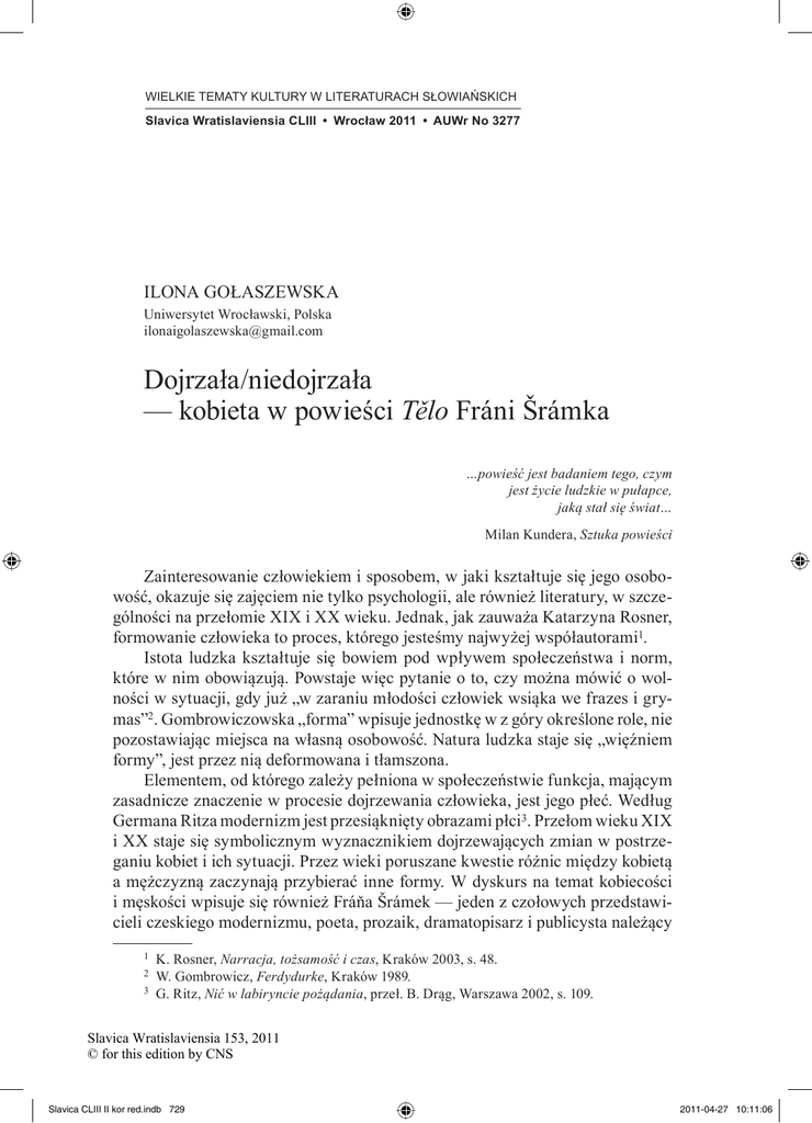 WIELKIE TEMATY KULTURY W LITERATURACH SŁOWIAŃSKICH Slavica Wratislaviensia CLIII • Wrocław 2011 • AUWr No 3277 ILONA GOŁASZEWSKA Uniwersytet Wrocławski, Polska [email protected] Dojrzała/niedojrzała — kobieta w powieści Tělo Fráni Šrámka …powieść jest badaniem tego, czym jest życie ludzkie w pułapce, jaką stał się świat… Milan Kundera, Sztuka powieści Zainteresowanie człowiekiem i sposobem, w jaki kształtuje się jego osobowość, okazuje się zajęciem nie tylko psychologii, ale również literatury, w szczególności na przełomie XIX i XX wieku. Jednak, jak zauważa Katarzyna Rosner, formowanie człowieka to proces, którego jesteśmy najwyżej współautorami1. Istota ludzka kształtuje się bowiem pod wpływem społeczeństwa i norm, które w nim obowiązują. Powstaje więc pytanie o to, czy można mówić o wolności w sytuacji, gdy już „w zaraniu młodości człowiek wsiąka we frazes i grymas”2. Gombrowiczowska „forma” wpisuje jednostkę w z góry określone role, nie pozostawiając miejsca na własną osobowość. Natura ludzka staje się „więźniem formy”, jest przez nią deformowana i tłamszona. Elementem, od którego zależy pełniona w społeczeństwie funkcja, mającym zasadnicze znaczenie w procesie dojrzewania człowieka, jest jego płeć. Według Germana Ritza modernizm jest przesiąknięty obrazami płci3. Przełom wieku XIX i XX staje się symbolicznym wyznacznikiem dojrzewających zmian w postrzeganiu kobiet i ich sytuacji. Przez wieki poruszane kwestie różnic między kobietą a mężczyzną zaczynają przybierać inne formy. W dyskurs na temat kobiecości i męskości wpisuje się również Fráňa Šrámek — jeden z czołowych przedstawicieli czeskiego modernizmu, poeta, prozaik, dramatopisarz i publicysta należący 1 2 3 K. Rosner, Narracja, tożsamość i czas, Kraków 2003, s. 48. W. Gombrowicz, Ferdydurke, Kraków 1989. G. Ritz, Nić w labiryncie pożądania, przeł. B. Drąg, Warszawa 2002, s. 109. Slavica Wratislaviensia 153, 2011 © for this edition by CNS Slavica CLIII II kor red.indb 729 2011-04-27 10:11:06 730 • Ilona Gołaszewska do „generacji burzycieli”, pokolenia, które na scenę literacką wstąpiło na przełomie XIX i XX wieku pod hasłami anarchizmu, pacyfizmu i witalizmu. Twórczość witalistyczna Fráni Šrámka jest głęboko związana z jego antymilitaryzmem. Filozofia przyznająca życiu i zmysłom wartość najważniejszą była formą obrony przed wojną i jej okrucieństwem. Pisarz, który w czasie I wojny światowej trafił na front rosyjski, później również na rumuński i włoski, wyrażał w ten sposób chęć powrotu do pięknych, zmysłowych stron życia. Z tego pragnienia rodzi się w 1919 roku powieść Tělo. Obok fascynacji życiem główny temat utworu stanowi proces dojrzewania młodej bohaterki — Máni Švarcovej. Poszukiwanie odpowiedzi na pytania, kim jest kobieta oraz jak kształtuje się jej osobowość, Fráňa Šrámek rozpoczyna od okresu dzieciństwa. Jest to czas szczególny, który razem z młodością łączy się u niej w epokę nieświadomości, niewiedzy. Máňa w wieku osiemnastu lat jest pewną siebie dziewczyną, której życie ogranicza się do spacerów, spotkań z przyjaciółmi, lekcji śpiewu i kokietowania wszystkich napotkanych mężczyzn. Ten okres beztroski, może nawet niedojrzałości, pisarz zamyka uświadomieniem, które ma miejsce jedynie w sferze cielesnej. Małżeństwo z pełnym życia Koterą staje się kolejnym etapem na drodze do dojrzałości bohaterki. Máňa musi bowiem odnaleźć się w patriarchalnym świecie, w którym rola kobiety jest ograniczona przez normy społeczne. Bohaterka musi podporządkować się tej hierarchii i tak manewrować swymi cielesnymi pragnieniami, aby znajdowały się one w granicach dozwolonych przez społeczeństwo. Dlaczego w Bildungsromanie kobieta nie dojrzewa? Decydując się na przedstawienie kształtowania się osobowości kobiety w powieści, Šrámek nawiązał do tradycji Bildungsromanu4. Gatunek ten narodził się pod koniec XVIII wieku w Niemczech, a za wzór „powieści edukacyjnej”, jak w języku polskim bywa nazywany Bildungsroman5, jest uważany Wilhelm Meister Goethego. Sam termin został po raz pierwszy użyty przez Karla Morgensterna w roku 1816, który definiując Bildungsroman, napisał: „it portrays the Bildung of the hero in its beginnings and growth to a certain stage of complete4 Kwestią sporną jest to, czy można mówić o Bildungsromanie poza granicami niemieckimi. Część badaczy tego gatunku (zwłaszcza niemieckich) przyjmuje, że gatunek ten jest zbyt głęboko zakorzeniony w niemieckiej kulturze, dlatego Bildungsroman poza niemieckim obszarem nie istnieje. I choć polscy germaniści (opieram się tu na dość starych źródłach — zob. B. Hadaczek, Polska powieść rozwojowa w dwudziestoleciu międzywojennym, Szczecin 1985, s. 8 [przypis]) zgadzają się z tym, to zwłaszcza współczesne badania i prace na temat Bildungsromanu (i nie chodzi tylko o literaturę polską) wskazują na to, że zjawisko Bildungsromanu w pewnej formie zostało zapożyczone przez inne literatury. Nie ulega również wątpliwości, że wraz z upływem czasu Bildungsroman nabrał cech czasów nowoczesnych. 5 Zob. H. Orłowski, Stereotyp fabularny niemieckiej „powieści rozwojowej” (Entwicklungsroman) okresu mieszczańskiego realizmu, [w:] Poetyka i historia, red. J. Trzynadlowski, Wrocław-Warszawa-Kraków 1968. Slavica Wratislaviensia 153, 2011 © for this edition by CNS Slavica CLIII II kor red.indb 730 2011-04-27 10:11:07 Dojrzała/niedojrzała — kobieta w powieści Tělo Fráni Šrámka • 731 ness...”6. Jednak dopiero użycie tego terminu przez Wilhelma Diltheya w 1870 roku sprawiło, że stał się on bardziej popularny. Obydwaj badacze podkreślają, że rozwój bohatera w tym gatunku przebiega według określonego porządku — bohater formuje się, przechodząc 