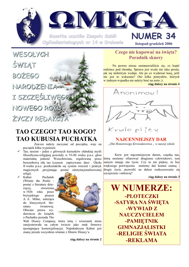 Gazetka uczniów Zespołu Szkół Ogólnokształcących nr 14 w Krakowie NUMER 34 listopad-grudzień 2006 Czego nie kupować na święta? Poradnik sknery WESOŁYCH ŚWIĄT Na pewno nieraz zastanawialiście się, co kupić rodzince pod choinkę. Sprawa jest wcale nie taka prosta, jak się niektórym wydaje. Ale po co wydawać kasę, jeśli nie jest to wskazane? Oto kilka pomysłów, których w żadnym wypadku nie należy brać na serio ;). ciąg dalszy na stronie 4 BOŻEGO NARODZENIA I SZCZĘŚLIWEGO NOWEGO ROKU ŻYCZY REDAKCJA TAO CZEGO? TAO KOGO? TAO KUBUSIA PUCHATKA Zawsze należy zaczynać od początku, więc na początek kilka wyjaśnień: Tao, taoizm - jeden z głównych kierunków chińskiej myśli filozoficzno-religijnej powstały w VI-III wieku p.n.e. głosi materialną jedność Wszechświata, regulowaną przez bezosobową siłę tao (czasem zapisywane: dao) . Około II wieku p.n.e. przekształciła się system wierzeń i praktyk magicznych ,przyjmując postać zinstytucjonalizowanej religii. Kubuś Puchatek (Winnie the Pooh) postać z literatury dziecięcej, stworzona w 1926 roku przez brytyjskiego pisarza A. A. Milne, należąca do klasycznych literatury światowej. Obecnie prawa wydawnicze do książek o Puchatku posiada The Walt Disney Company, która imię i wizerunek misia zarejestrowała na całym świecie jako znak firmowy (postępująca komercjalizacja). Najmłodszym Kubuś jest znany przede wszystkim właśnie z filmów Disney’a. ciąg dalszy na stronie 2 NAJCENNIEJSZY DAR „Dni Honorowego Krwiodawstwa „ w naszej szkole Krew jest najcenniejszym darem, cząstką nas, którą możemy ofiarować drugiemu człowiekowi, tym samym ratując mu życie. Czy to nie piękne, że bez większego poświęcenia możemy dać komuś szansę drugie życie, pozwolić na dalsze rozkoszowanie się szczęściem i miłością? ciąg dalszy na stronie 3 W NUMERZE: -PLOTECZKI -SATYRA NA ŚWIĘTA -WYWIAD Z NAUCZYCIELEM -PAMIĘTNIK GIMNAZJALISTKI -RELIGIE ŚWIATA -REKLAMA Satyra na święta Gdy nadchodzi taki czas Gdy choinka wita nas Amish na pierwszy rzut oka nic wam pewnie nie mówi. Więc spróbuję wam przybliżyć Gdy kolędy zewsząd grają Nazwa ten termin. Gdy słodycze dzieci mają Amisze to wywodzący się ze Szwajcarii konserwatywny odłam mennonitów żyjący Zasiadamy wraz z rodziną w USA. Członkowie tego wyznania żyją bez telewizji, radia, samochodów, luksusowych sklepów. Po prostu bez wszystkiego, co wydaje się nam Przy stole, z ciocią Niną niezbędne dzisiaj. Amisze porozumiewają się z języku z wujkiem Władkiem angielskim lub niemieckim. Uprawiają ziemię i starają się dziadkiem Sławkiem być jak najdalej od cywilizacji. Mieszkańcy Stanów babcią Gienią Zjednoczonych i innych państw traktują ich jak atrakcję siostrą Renią turystyczną, więc przyjeżdżają czasem po podglądać Amiszów. rodzicami, KAROLINA wspaniałymi potrawami: groch z kapustą, karp w zasmażce, Ciąg dalszy ze strony 1 kluski z makiem, pieróg z masłem. Co tradycja to tradycja, co rok wzrasta twa ambicja, by dowiedzieć się dlaczego, po co, na co, gdzie kolego Narodziło się Dzieciątko Tao Kubusia Puchatka (The Tao of Poch. - książka napisana przez traktowane jak Paniątko Benjamina Hoffa wyjaśniająca, w prosty sposób, przez charaktery, przeszło dwa tysiące lat postawy życiowe, a także przez przygody, jakie spotykają Misia o Bardzo kłania mu się cały świat. Małym Rozumku i jego przyjaciół, podstawowe zagadnienia taoizmu. Po co, na co i dlaczego Jednak w pewnym sensie nie przedstawia nam nic nowego, bo przecież spoglądamy co rok w niebo każde dziecko wie, że BARDZO WAŻNE sprawy Królika nie mają żadnego znaczenia. Że Sowa Przemądrzała niby dużo wie, lecz tak wyszukując pierwszej gwiazdy naprawdę nie wie prawie nic ( i w dodatku jest straaaaszną nudziarą), że co też robi chyba każdy. Tygrys jest TROSZKĘ zbyt pewny siebie, że Prosiaczek się ZAWSZE Coraz ciszej biją dzwony, i WSZYSTKIEGO boi. A Puchatek pomimo swego małego rozumku jest Coraz głośniej megafony: zawsze szczęśliwy i wszystko mu się udaje. Właśnie to, że postaci „Ale dzieci przecież w święta stworzone przez Milne’a są nam tak dobrze znane, powoduje, że dzięki przyrównaniu do nich postaw i zasad taoizmu, te wydają się bardzo proste pamiętajcie o prezentach!” TAO CZEGO? TAO KOGO? TAO KUBUSIA PUCHATKA *MiMi* i oczywiste. Nie będę tej książki nikomu polecać, bo uważam, że jest to jedna z tych książek, po które powinni sięgać tylko ci ludzie, którzy są pewni, że tego chcą i są na to gotowi. Agnieszka Pietrzyk Powyższe pytanie wielu Polaków codziennie zadaje sobie, oglądając reklamy podczas filmu, serialu lub teleturnieju. W stacjach komercyjnych reklamy są dłuższe i częściej emitowane, ponieważ to najważniejsze źródło utrzymania tychże stacji. Im więcej firm, produktów będzie reklamowanych, tym więcej będzie zysków. Telewizje komercyjne już uciekają się do wymyślnych sposobów typu: „TYLKO JEDNA REKLAMA”. Wcale nie kończy się na jednej reklamie. Programy telewizji publicznej emitują mniej reklam, bo telewidzowie opłacają abonament, który zasila budżet telewizji publicznej. Działają też stacje nieemitujące żadnych reklam, gdyż widzowie tych stacji opłacają dość wysoki comiesięczny abonament. Podczas bloków reklamowych nie warto się irytować. Można ten czas wykorzystać na przykład na zaparzenie sobie herbaty. K KAROLINA 2 Gazetka Zespołu Szkół Ogólnokształcących nr 14 w Krakowie listopad-grudzień 2006 Ciąg dalszy ze strony 1 NAJCENNIEJSZY DAR „Dni Honorowego Krwiodawstwa „ w naszej szkole Co roku nasza szkoła przyłącza się do akcji krwiodawstwa i bierze udział w różnych konkursach w ramach „Dni Hononorowego Krwiodawstwa”(22-27.11). Uczniowie liceum ponadto odbyli szkolenie związane z uzyskaniem certyfikatu UE ”Udzielanie pierwszej pomocy”. Zdobyło go 17 ucznió