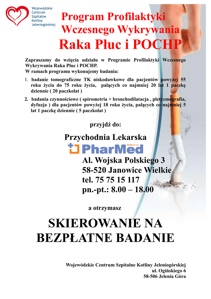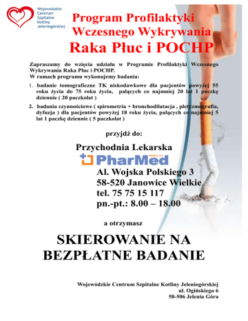 Program Profilaktyki Wczesnego Wykrywania Raka Płuc i POCHP Zapraszamy do wzięcia udziału w Programie Profilaktyki Wczesnego Wykrywania Raka Płuc i POCHP. W ramach programu wykonujemy badania: 1. badanie tomograficzne TK niskodawkowe dla pacjentów powyżej 55 roku życia do 75 roku życia, palących co najmniej 20 lat 1 paczkę dziennie ( 20 paczkolat ) 2. badania czynnościowe ( spirometria + bronchodilatacja , pletyzmografia, dyfuzja ) dla pacjentów powyżej 18 roku życia, palących co najmniej 5 lat 1 paczkę dziennie ( 5 paczkolat ) przyjdź do: Przychodnia Lekarska Al. Wojska Polskiego 3 58-520 Janowice Wielkie tel. 75 75 15 117 pn.-pt.: 8.00 – 18.00 a otrzymasz SKIEROWANIE NA BEZPŁATNE BADANIE Wojewódzkie Centrum Szpitalne Kotliny Jeleniogórskiej ul. Ogińskiego 6 58-506 Jelenia Góra