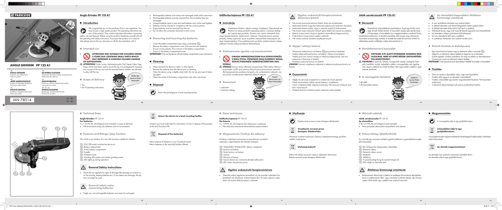 Angle Grinder PP 125 A1 Introduction We congratulate you on the purchase of your new appliance. You have chosen a high quality product. The operating instructions are part of the product. They contain important information concerning safety, use and disposal. Before using the product, familiarise yourself with all the operating and safety instructions. If you pass the product on to anyone else, please ensure that you also pass on all the documentation with it. Intended use ATTENTION! NOT SUITABLE FOR CHILDREN UNDER 3 YEARS OLD: CONTAINS SMALL PARTS WHICH MAY REPRESENT A CHOKING HAZARD! DANGER OF SUFFOCATION! ATTENTION! Cords / wires / polystyrene parts / foil / tapes / clips / tags, loops, which have been used to secure the toy in its packaging for transport, are not part of the toy and must be removed before children are allowed to play with the toy. A NGLE GRINDER PP 125 A1 SZLIFIERKA KĄTOWA ANGLE GRINDER W skazówki dotyczące obsługi i bezpieczeństwa W skazówki dla rodziców O peration and Safety Notes N otes for parents J ÁTÉK SAROKCSISZOLÓ Scope Ú HLOVÁ BRUSKA K ezelési és biztonsági útmutatások T udnivalók szülők részére P okyny pro obsluhu a bezpečnostní pokyny U pozornění pro rodiče UHLOVÁ BRÚSKA WINKELSCHLEIFER O vládacie a bezpečnostné pokyny P okyny pre rodičov of delivery Hello! My name is Peter Parkside! Removing and inserting the batteries Loosen the battery compartment screw using a screwdriver 3 . Remove the battery compartment cover and insert the new batteries. Ensure correct polarity. This is shown in the battery compartment. Screw on the battery compartment cover. ATTENTION! Only use the device with the battery compartment cover screwed on. B edienungs- und Sicherheitshinweise H inweise für die Eltern 3 Data 1 2 3 4 k k blin blin 5 4 SZENIA! UWAGA! Sznury / druty / elementy styropianowe / folie / taśmy / klamry / przywieszki, szlufki, przy pomocy których jest przymocowana zabawka dla bezpieczeństwa podczas transportu, nie są elementami zabawki i muszą zostać usunięte przed oddaniem zabawki dziecku. 5 Nie można ponownie ładować baterii, które nie są ładowalne. Ładowalne baterie mogą być ładowane jedynie pod nadzorem dorosłych. Ładowalne baterie należy wyjąć z zabawki przed ich ładowaniem. Nie można razem stosować różnych typów baterii lub nowych ze zużytymi. Baterie muszą zostać włożone zgodnie z prawidłową biegunowością. Puste baterie muszą zostać wyjęte z zabawki. Nie można zwierać zacisków przyłączeniowych. Wyjąć i włożyć baterie z elemekkel kapcsolatos általános A biztonsági utasítások Bevezető Gratulálunk új készülékének vásárlásához. Ezzel egy kiváló minőségű termék mellett döntött. A használati utasítás ezen termék része. A biztonságra, a használatára és a megsemmisítésre vonatkozó fontos utasításokat tartalmazza. A termék használata előtt ismerje meg valamennyi használati és biztonsági utasítást. A termék harmadik fél számára történő továbbadása esetén mellékelje a teljes dokumentációt is. FIGYELEM! 3 ÉV ALATTI GYERMEKEK SZÁMÁRA NEM ALKALMAS, MERT AZ APRÓ RÉSZEK LENYELHETŐEK! FULLADÁSVESZÉLY! FIGYELEM! A zsinórok / drótok / hungarocell- részek / szalagok / kampók / medálok, hurkok, melyekkel a játék a csomagolásba van rögzítve, nem részei a játéknak és el kell távolítani őket még mielőtt a játékot a gyermeknek átadnánk. Czyszczenie Nigdy nie zanurzać urządzenia w wodzie lub innych płynach. Przed czyszczeniem należy usunąć baterie z urządzenia. Czyść urządzenie lekko wilgotną ściereczką. Nie stosować żadnych środków czyszczących. Wnętrze komory na baterie czyścić wyłącznie suchą szmatką. A csomagolás tartalma 1 db játék 1 db használati utasítás A nem újratölthető elemeket nem szabad tölteni. A tölthető elemeket csak felnőtt felügyelete mellett szabad tölteni. A tölthető elemeket töltés előtt ki kell venni a játékból. Különböző típusú, vagy új és használt elemek egyszerre nem használhatók. Az elemeket a helyes polaritással kell behelyezni. Az üres elemeket ki kell venni a játékból. A csatlakozó- kampókat nem szabad rövidre zárni. Elemek R endeltetésszerű használat P oluzować śrubę komory na baterie 3 przy pomocy śrubokręta. Należy zdjąć pokrywę komory na baterie i włożyć nowe baterie. Należy przy tym zwrócić uwagę na właściwą biegunowość. Jest ona pokazana w komorze na baterie. Przykręcić pokrywę komory na baterie. UWAGA! Używać urządzenia wyłącznie z zakręconą pokrywą komory na baterie. D ane techniczne Contact your local authorities for information on how to dispose of the product at the end of product life. and fittings / play function 6 7 Szlifierka kątowa: PP 125 A1 Na baterie 3 x 1,5V , R6, AA (mignon) (nie dołączone w zestawie) Nie zalecamy stosowania akumulatorów, jedynie baterii. kivétele és behelyezése Egy csavarhúzóval lazítsa meg az elemtartó rekesz csavarját 3 . Vegye le az elemtartó rekesz fedelét és tegye be az új elemeket. Ezalatt ügyeljen a helyes polaritásra. Ez meg van jelölve az elemrekeszben. Csavarozza vissza az elemtartó rekesz fedelét. FIGYELEM! Csak becsavarozott elemrekesz- fedéllel használja a készüléket. Tisztítás Soha ne merítse a készüléket vízbe, vagy más folyadékba. Tisztítás előtt vegye ki az elemeket a készülékből. Tisztítsa a készüléket egy enyhén megnedvesített kendővel. Ne használjon tisztítószert. Z elemtartó rekesz belsejét csak száraz porkendővel tisztítsa. Helló! A nevem Peter Parkside! 1 2 3 4 5 6 A készüléket adja le egy gyűjtőállomáson. Ez a termék egy szerszám mintájára gyártott játékszer a gyermekeknek megfelelő funkciókkal. Utylizacja baterii! 1 2 3 Baterii nie należy wyrzucać razem z odpadami domowymi. Baterie zwracać przez dostępne składowiska. 4 5 6 7 Ogólne wskazó